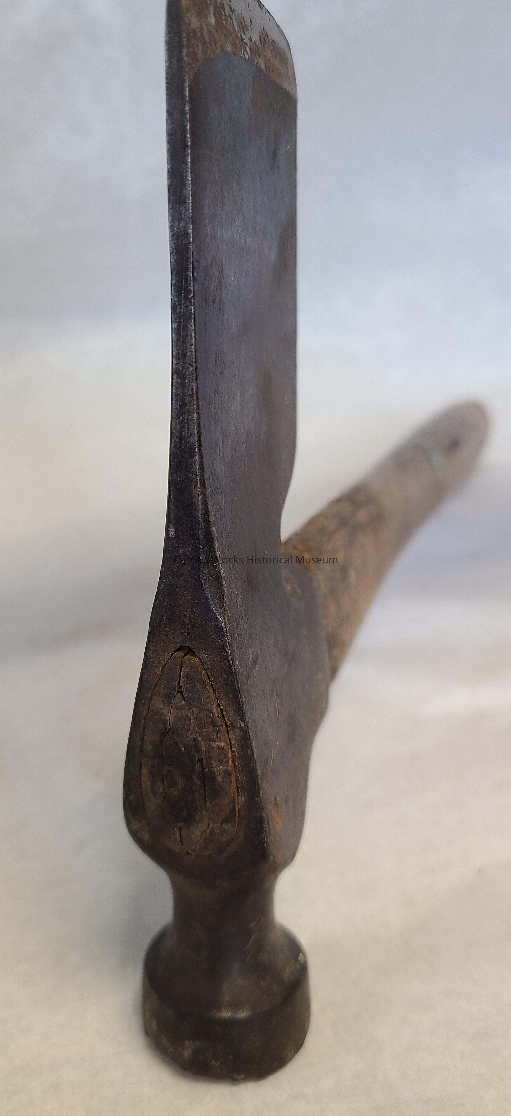 The wooden handle is tan with dark spots and residue.