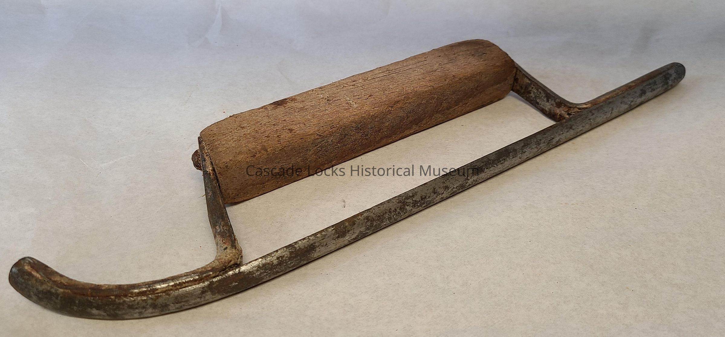 Wood handle is tan with slight brown spots and wear. The steel is silver with dark spots and pitting. In the pitting there is rust. The top of the steel has thick coating of off-white oxidation.