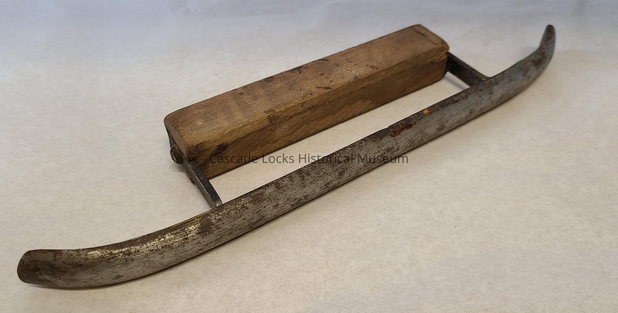 Wood handle is tan with dark residue spots and wear. The steel is silver with dark spots and pitting. In the pitting there is rust. There is a gold colored metal that has been pored over the weld connections on the sled. The gold metal has teal and off-white oxidation.