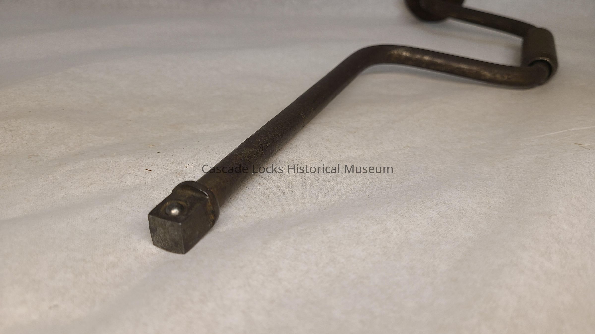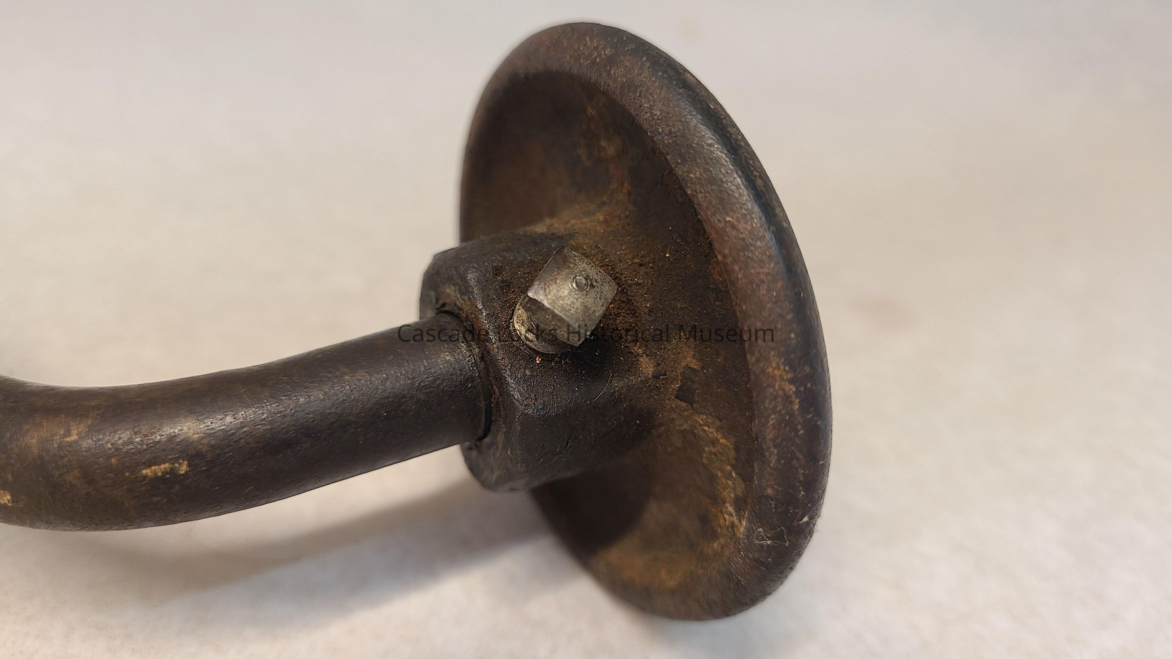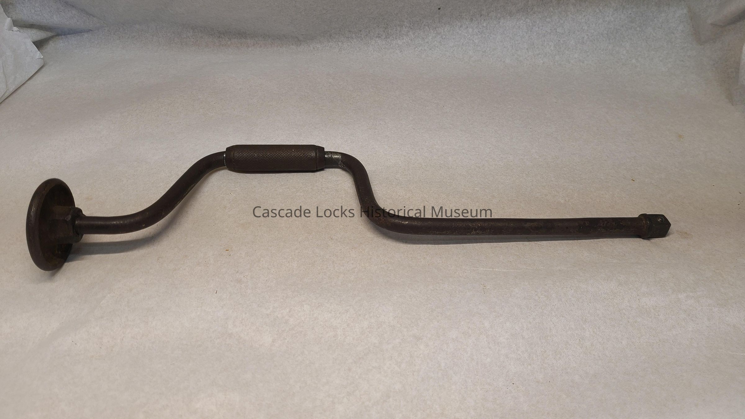 Metal hand crank with square base and round handle head. The shaft of the hand crank is curved into a strong u shape in the upper middle portion. Attached to the shaft is a spinning hand grip. The crank would have been used attached to a drill.