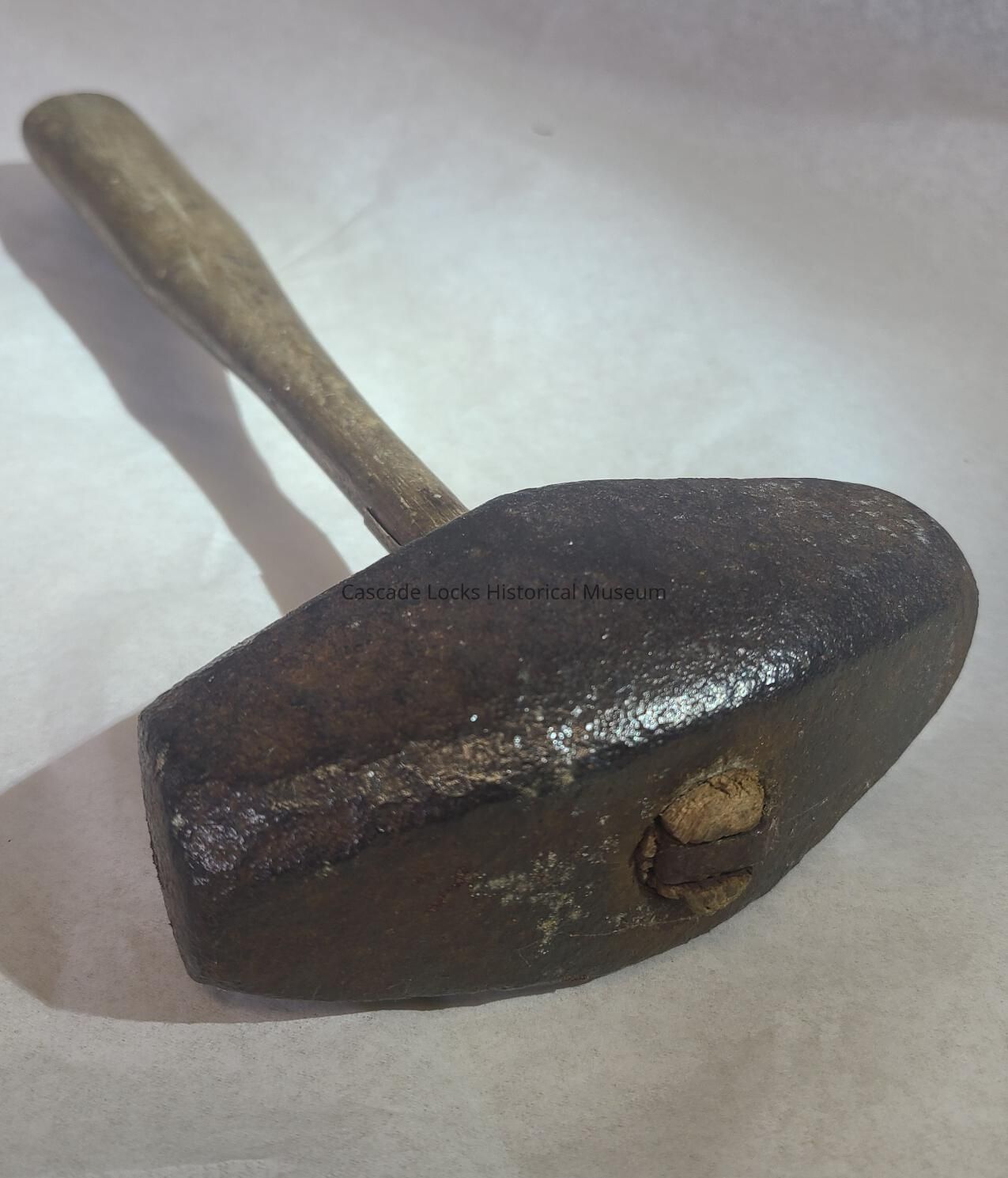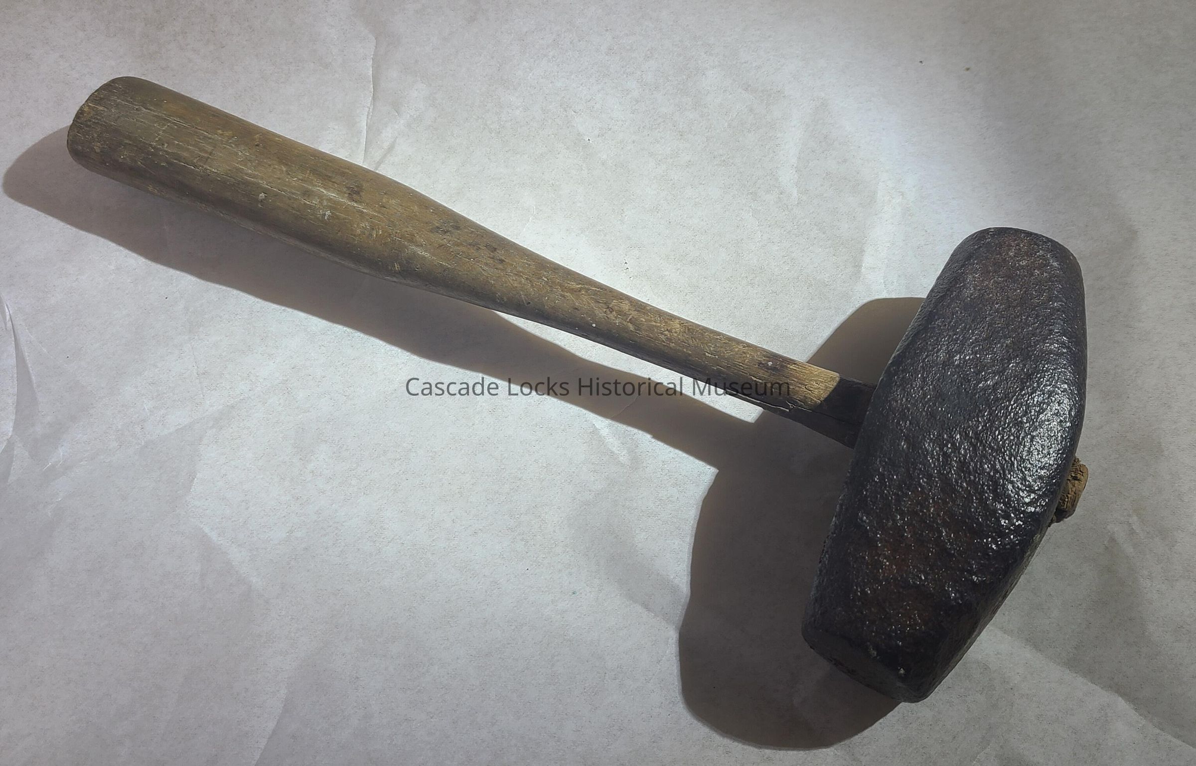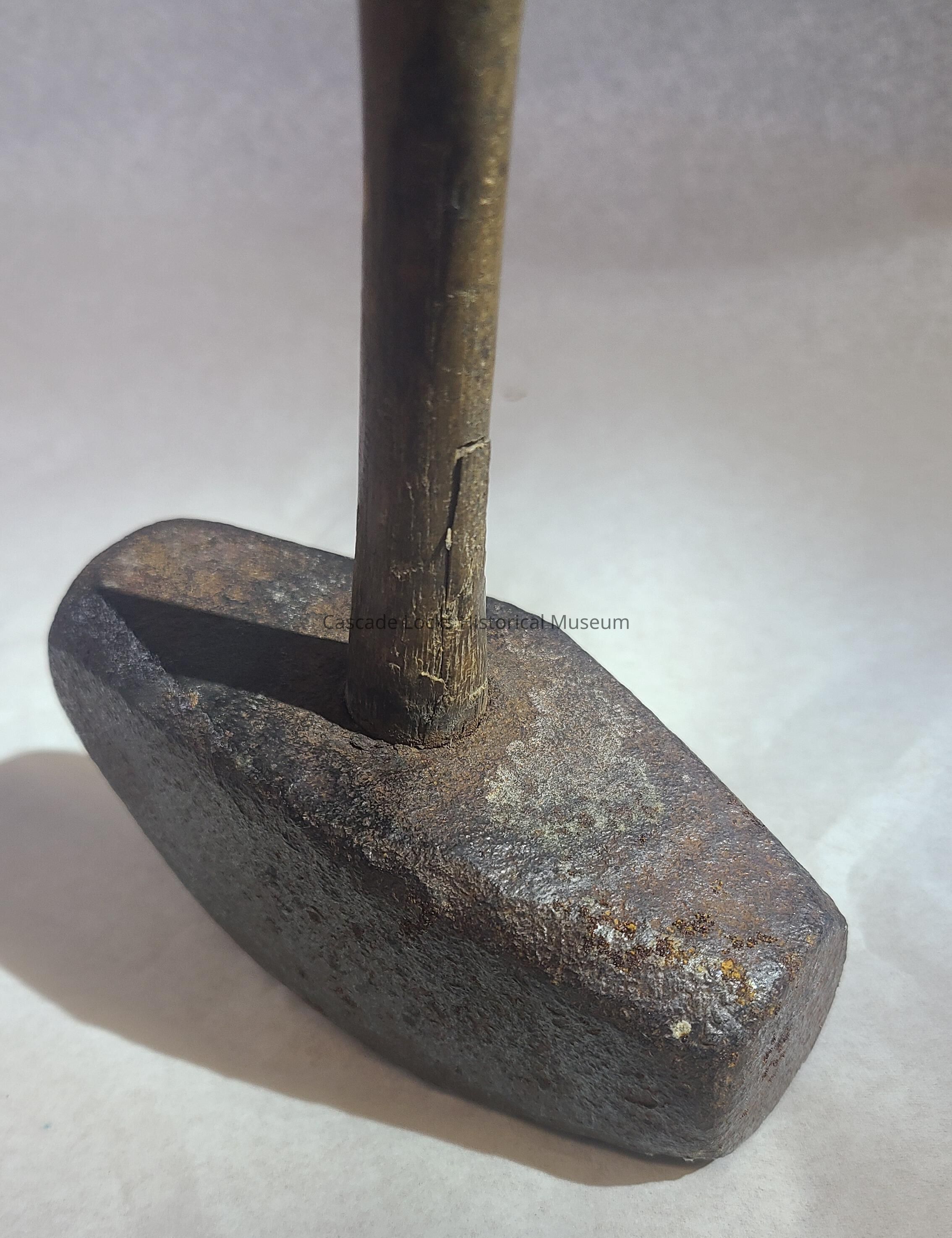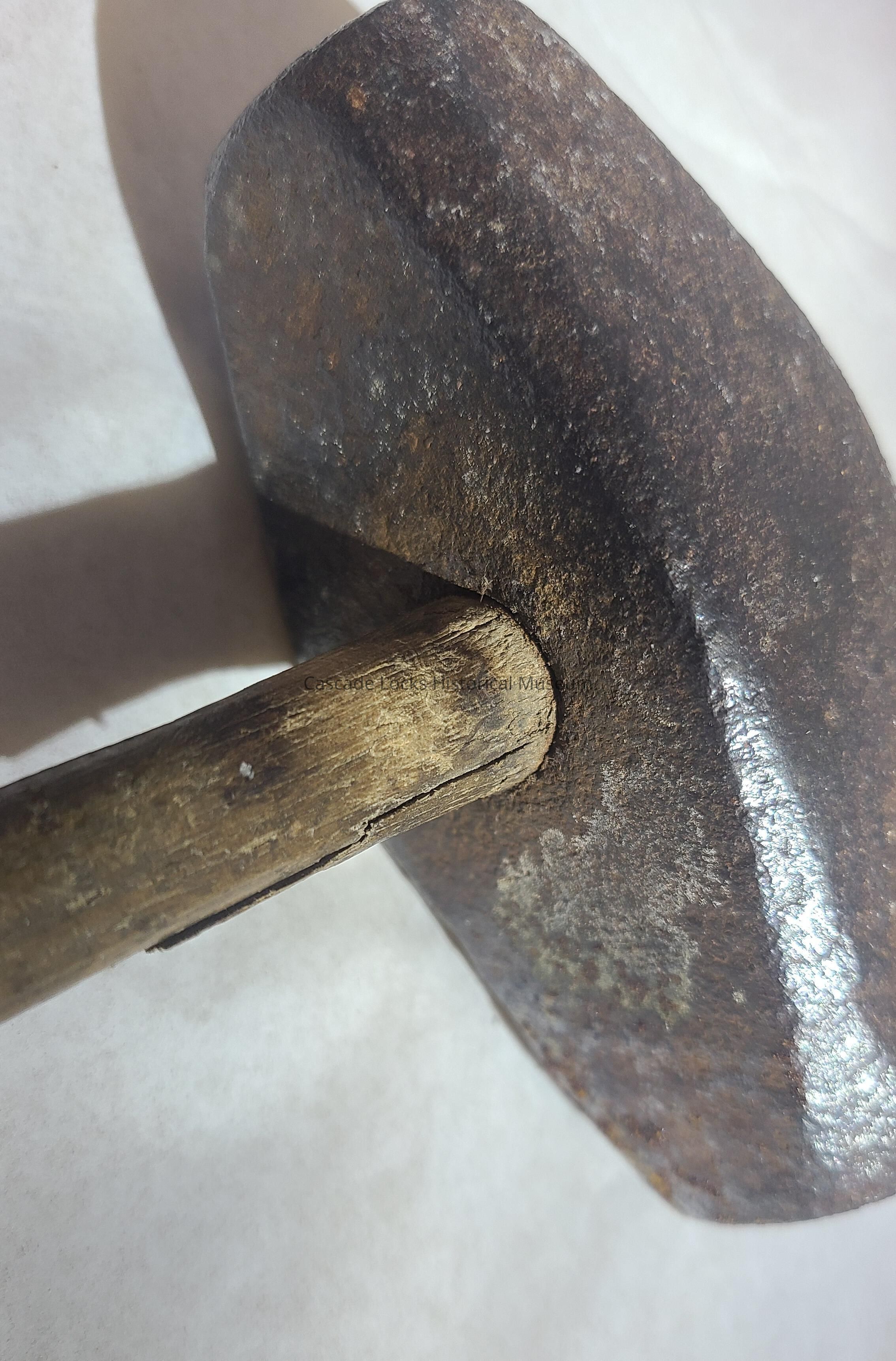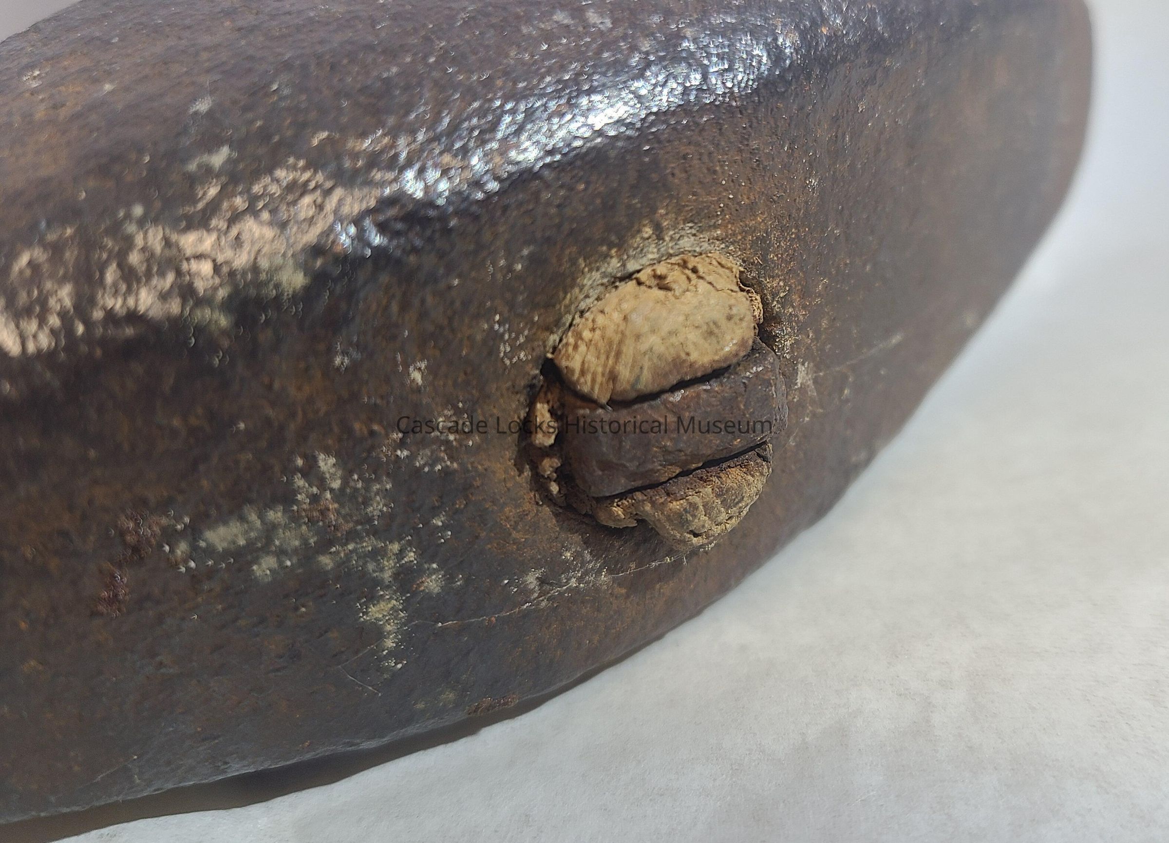 Stone is dark between a black and gray coloring varying in color over the surface of the stone. In the porous surface of the stone there is mineral build-up of off-white, tan, and yellow. Wooden handle is light tan with darker brown wear from use.