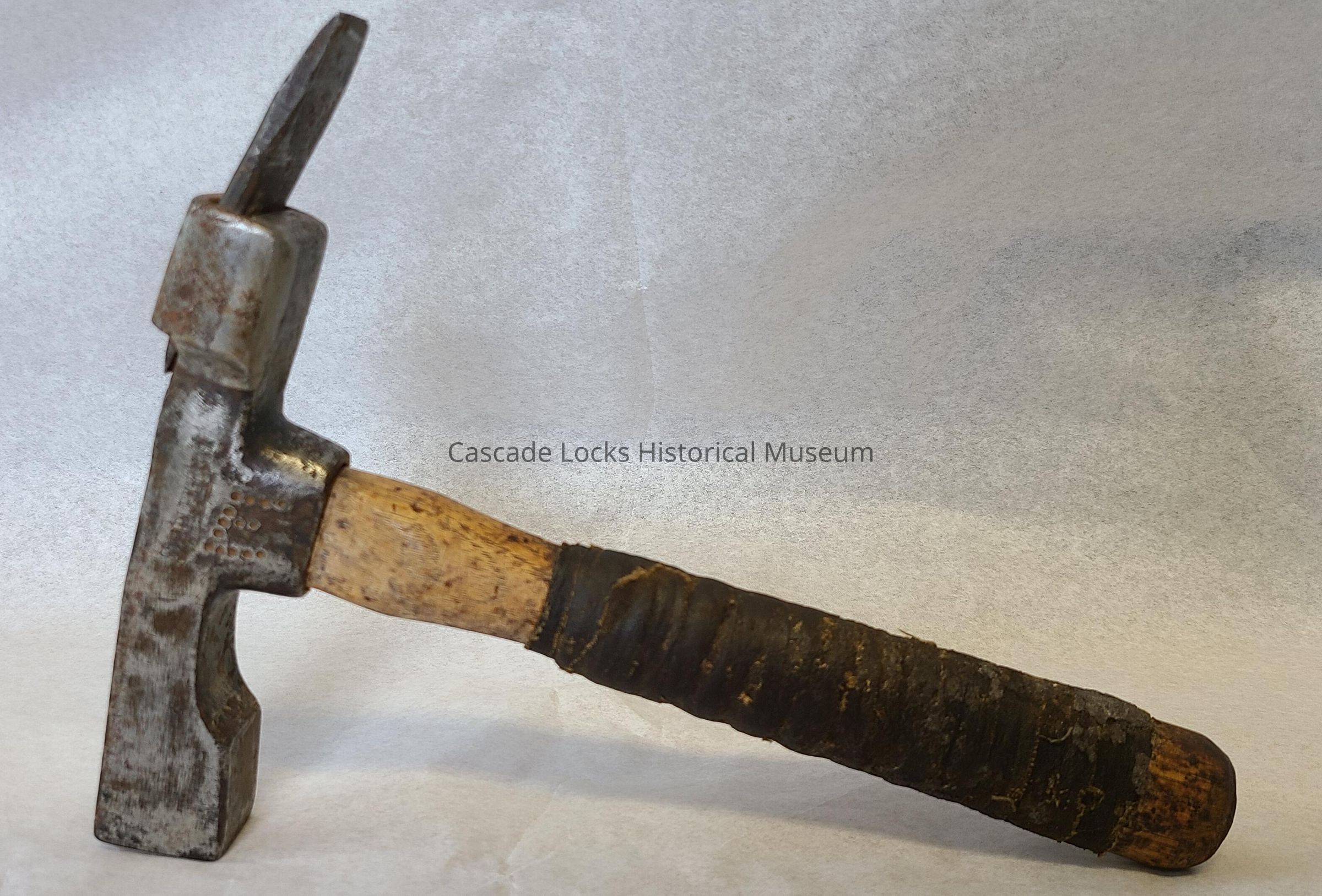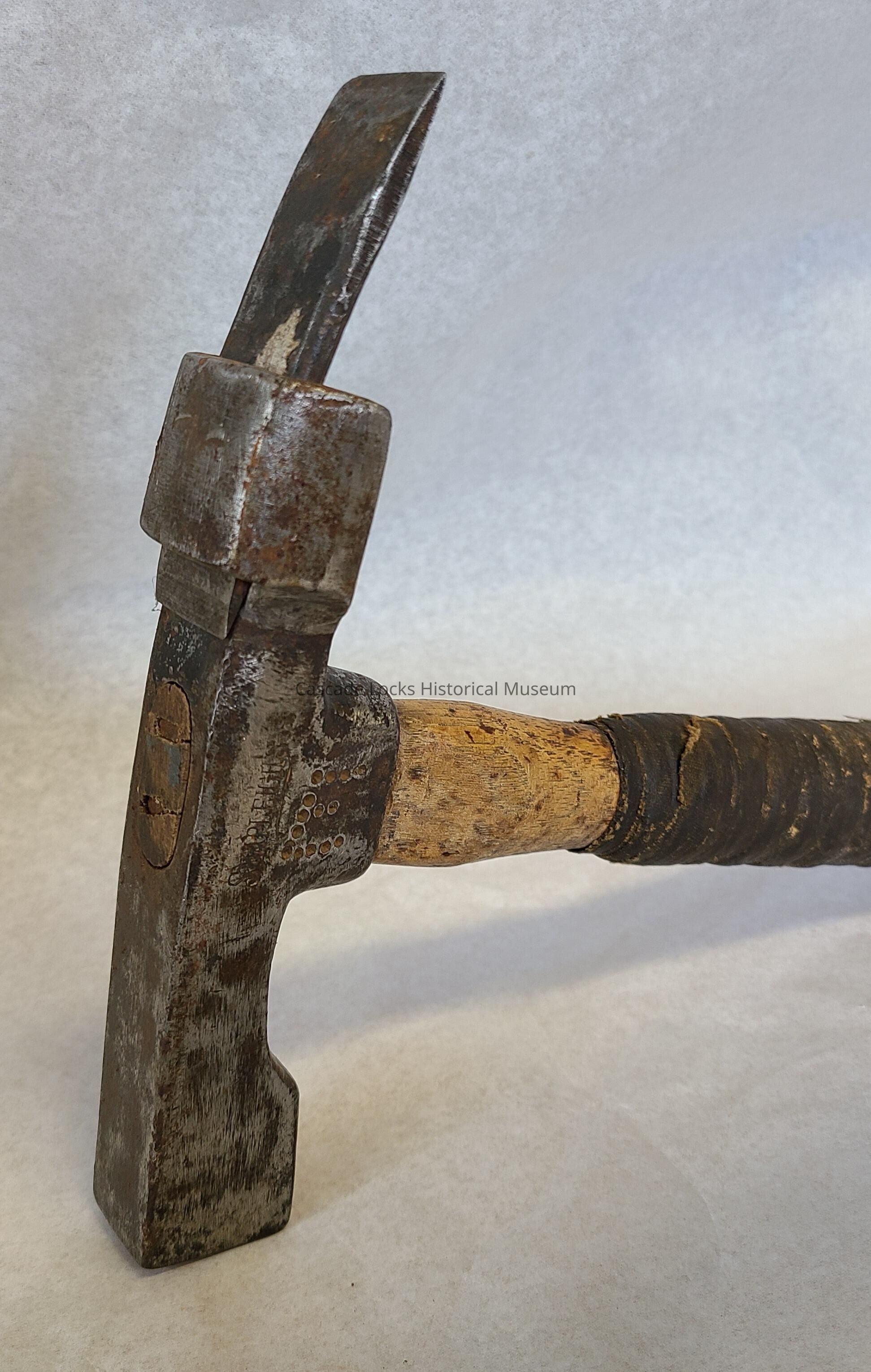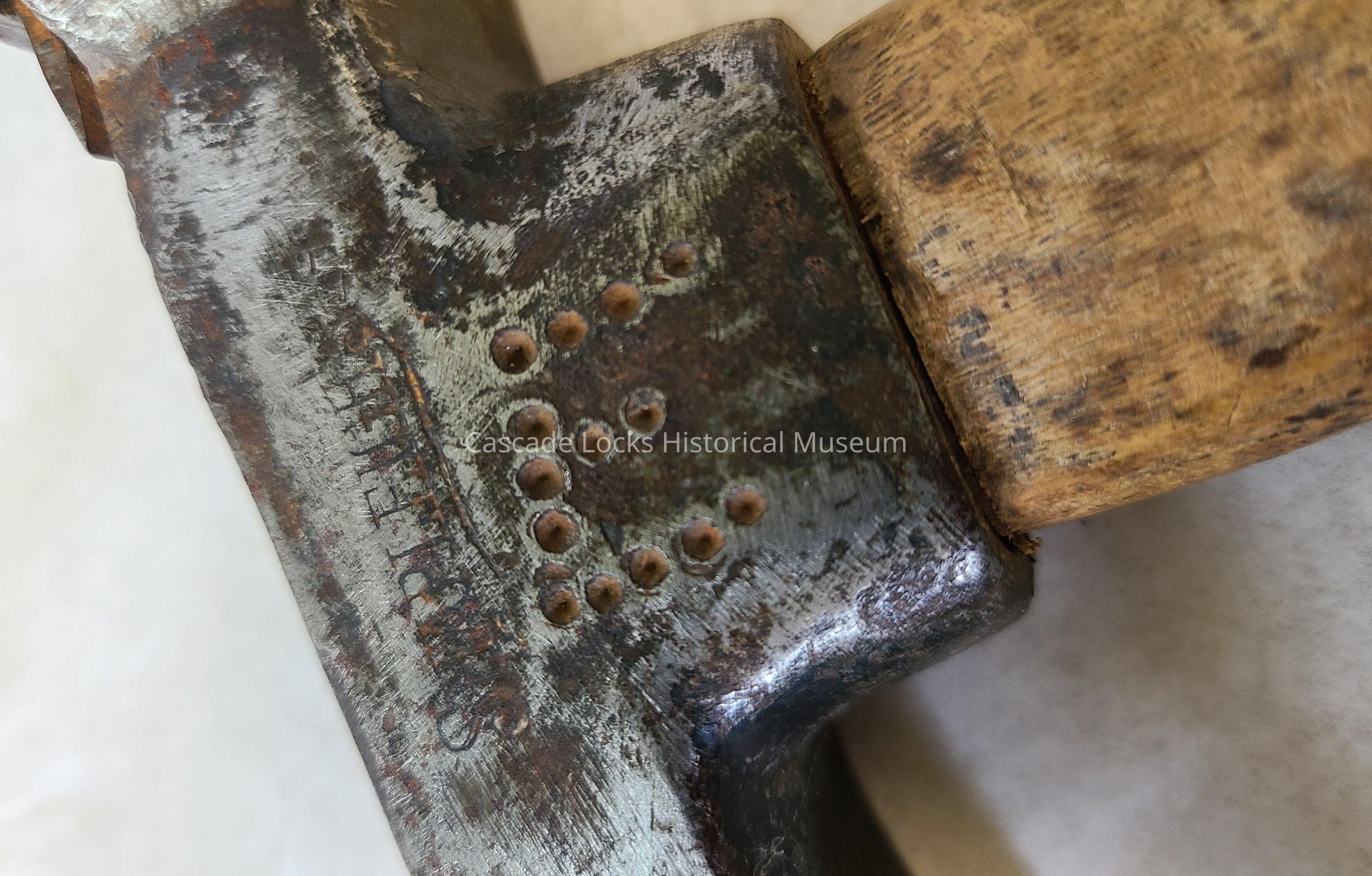 The metal head is silver with with dark areas in concave areas of dark, brown, and red rust and dirt.
