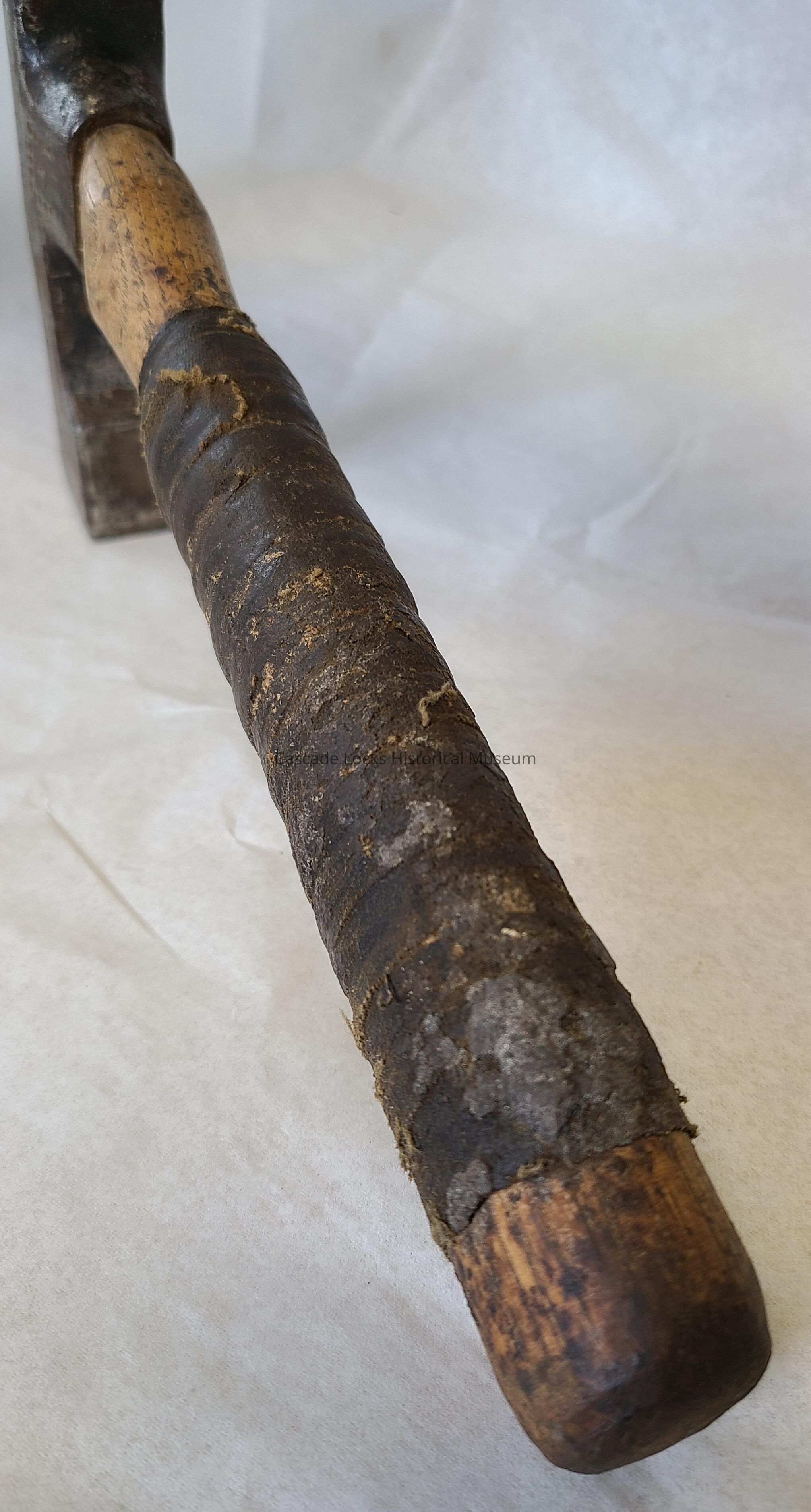 Fabric wrap is dark in color with tan around the fraying edges. There is residue of a coating on the wrap that is dark in color with a white and gray bloom to it.