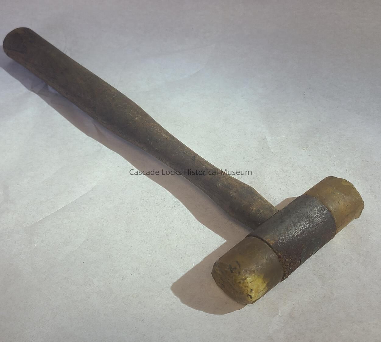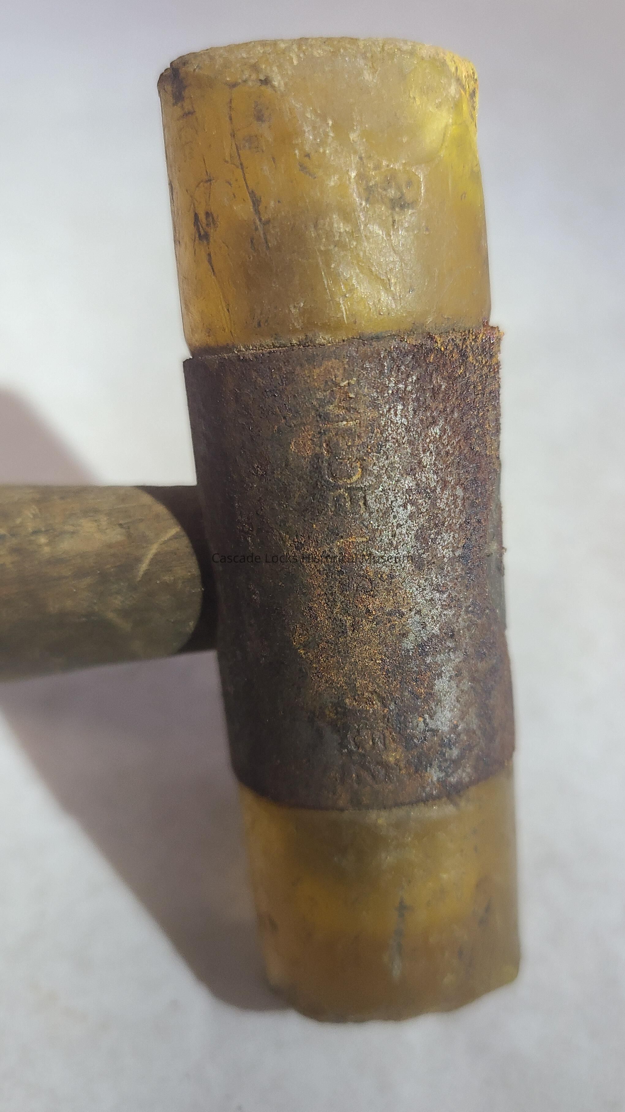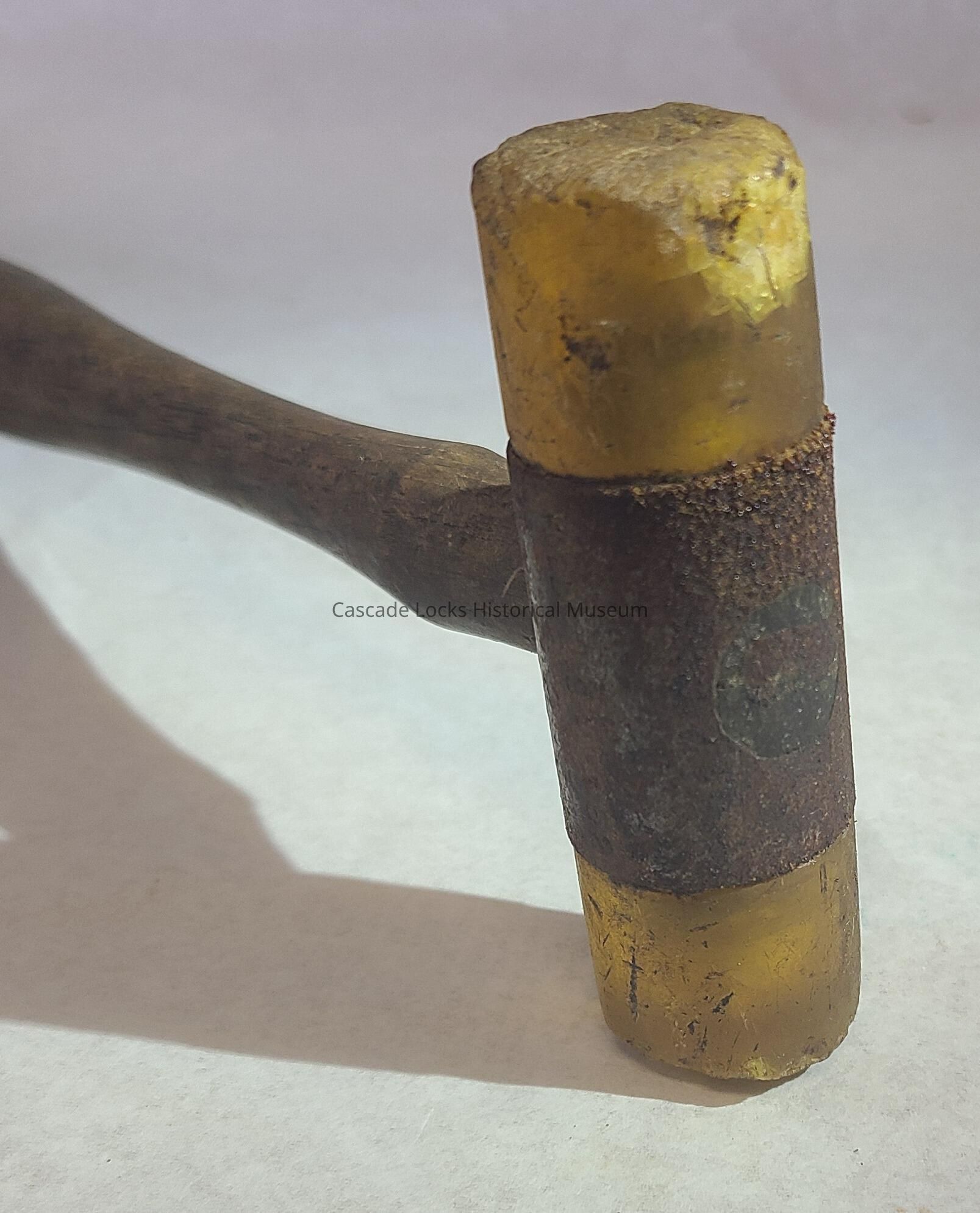 Wooden handle is tan wood that has darken from use. Head is made of gray metal with two inserted yellow nylon rubber heads.