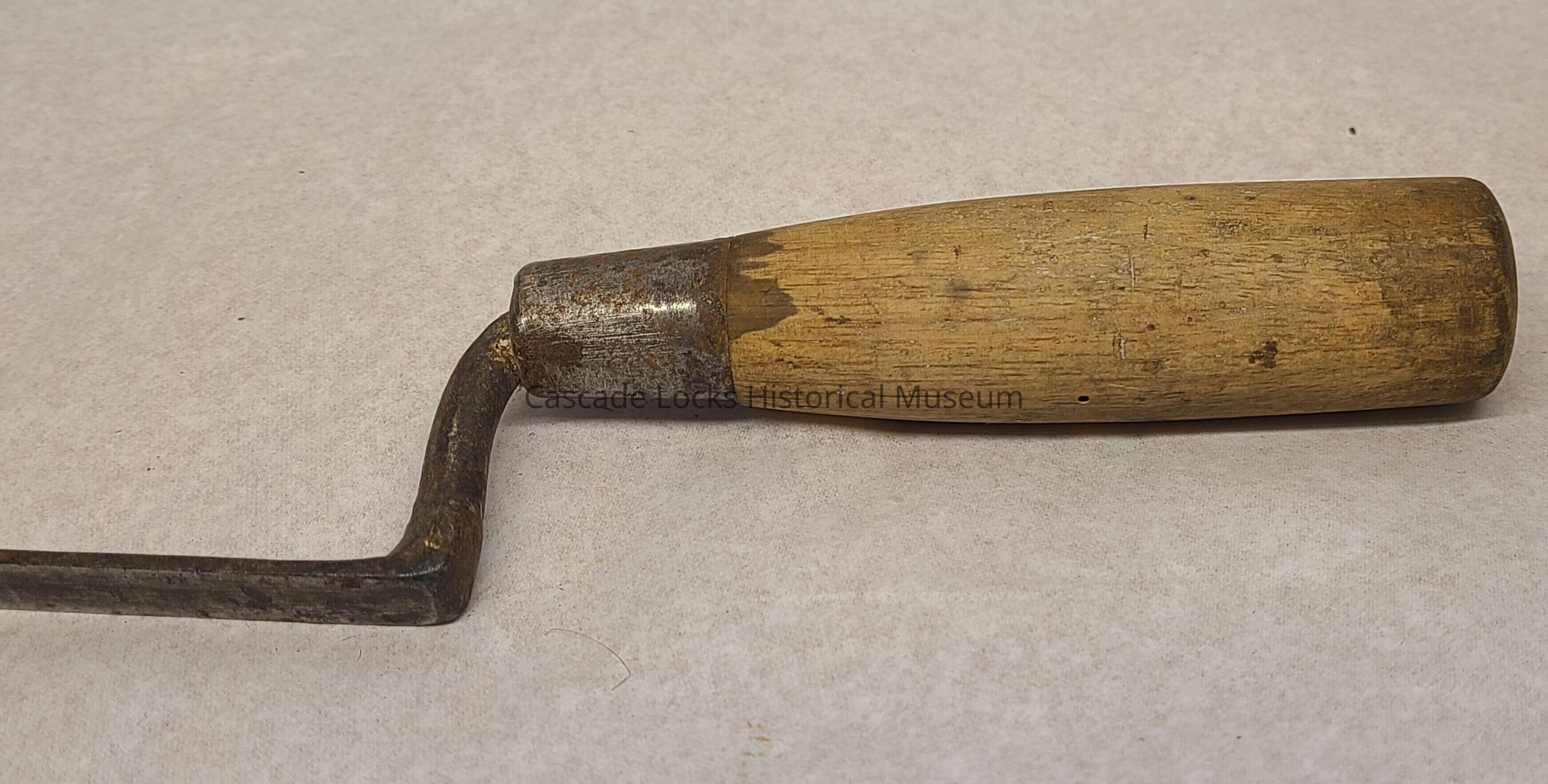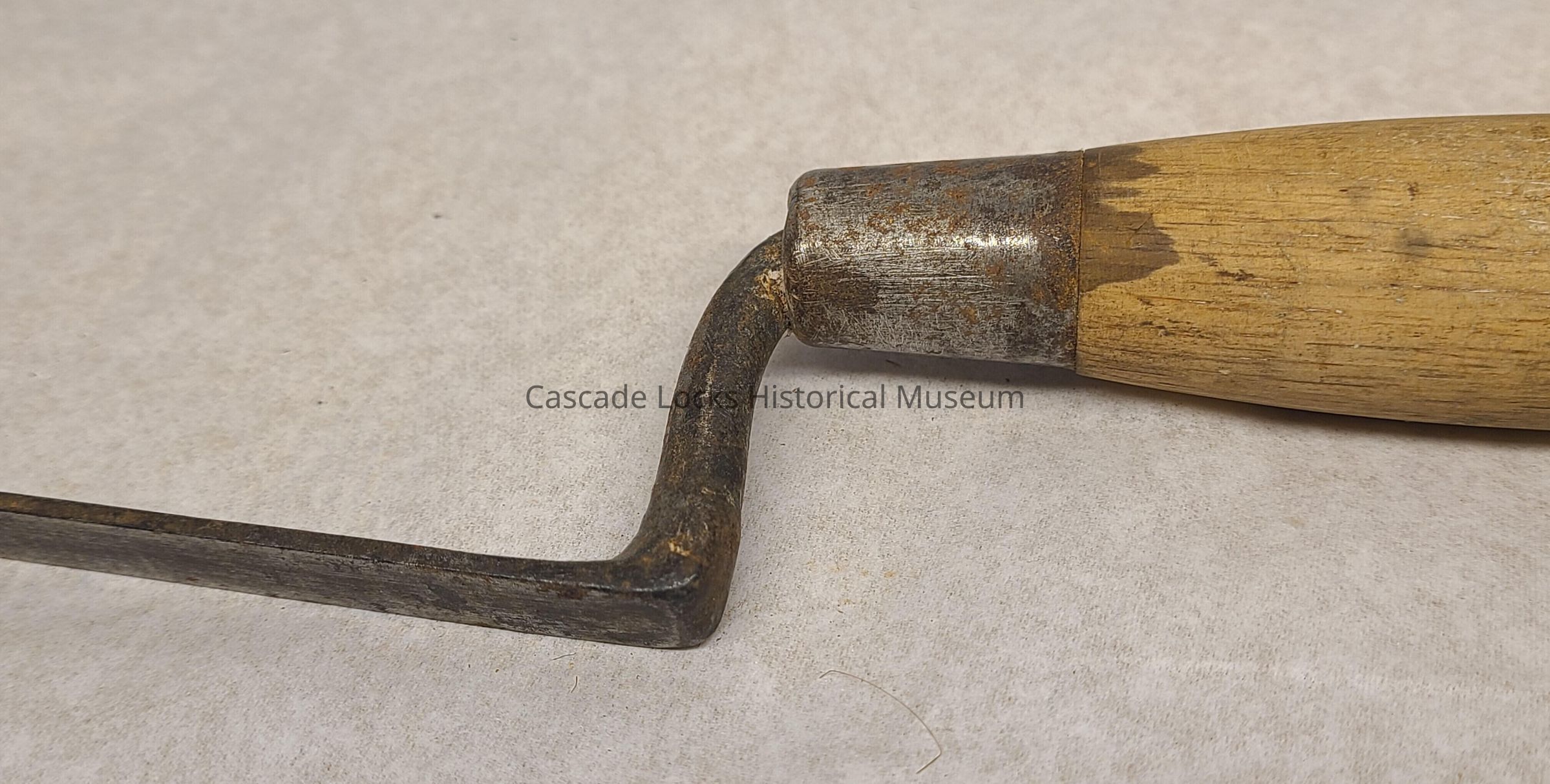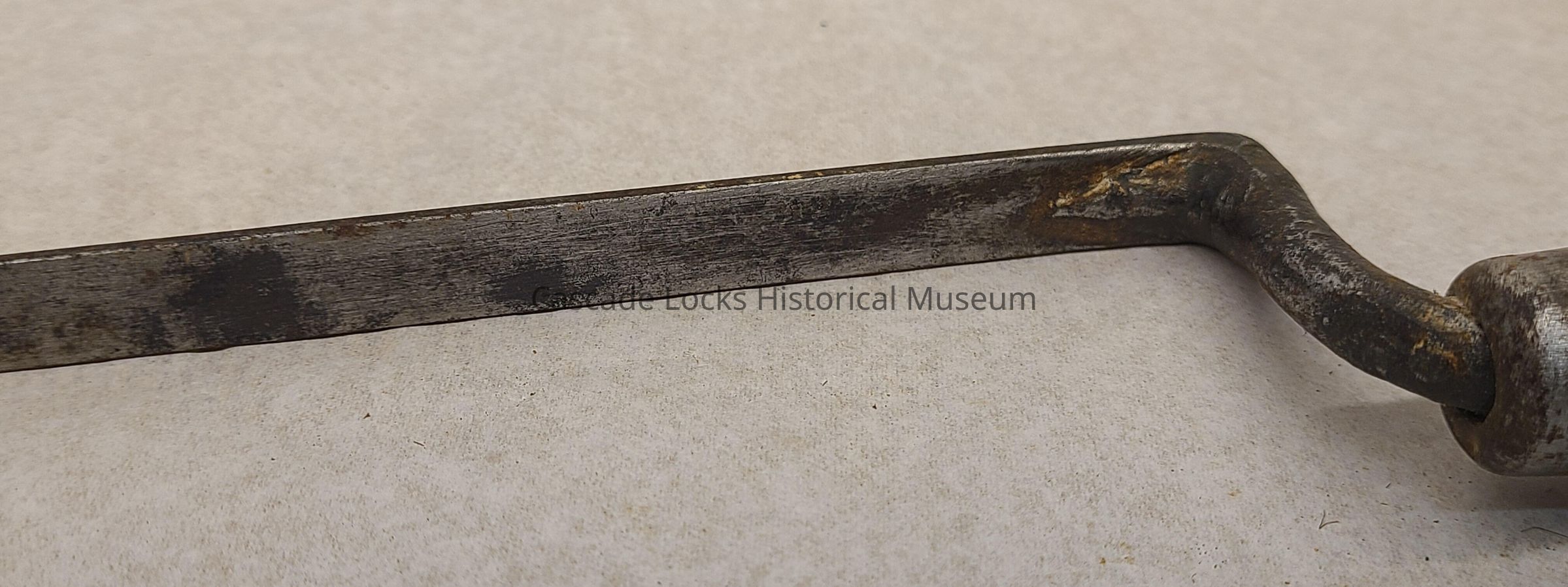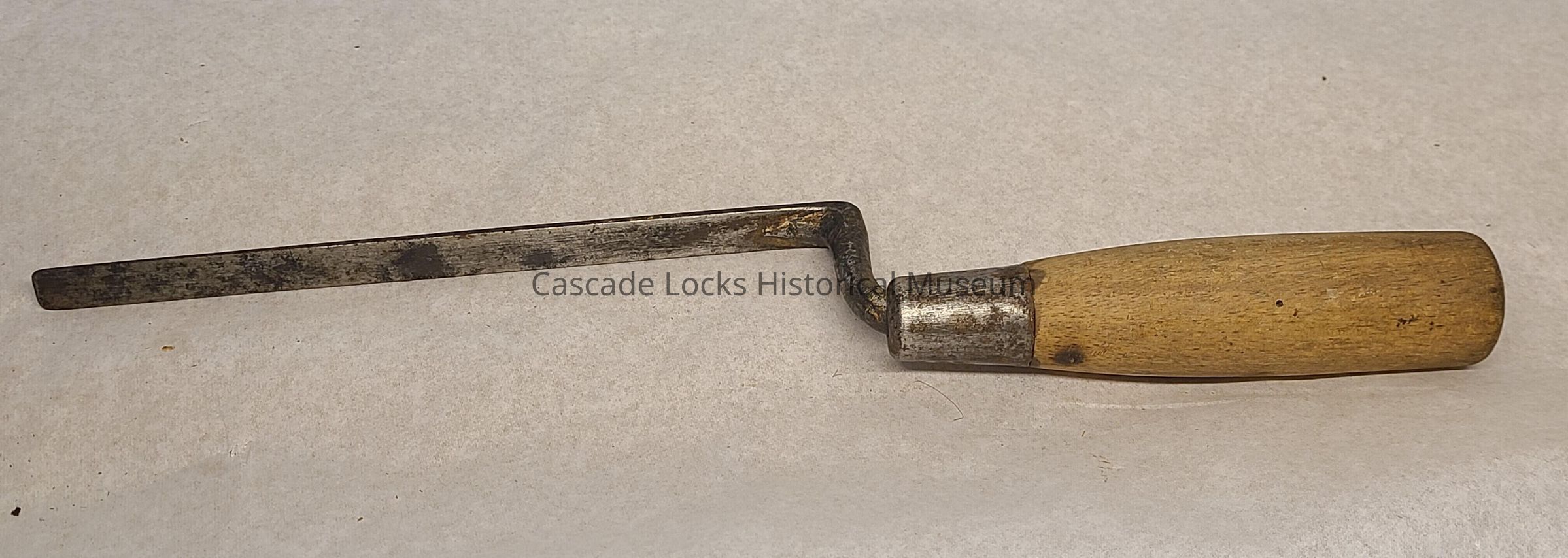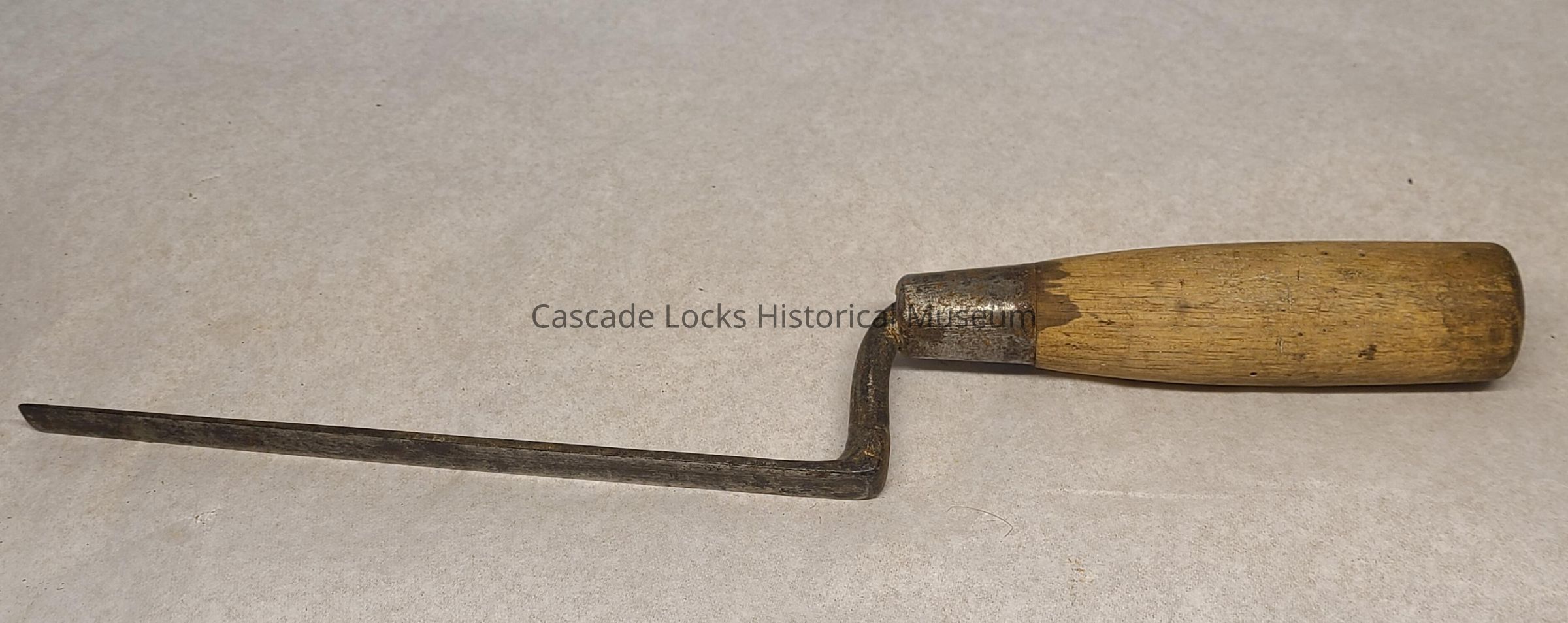 Wooden handle is tan with dark wear and residue spots. The metal head of the tuck pointer is overall silver in color with with dark tarnish. There is red/brown rust on and around the blade with white bloom.