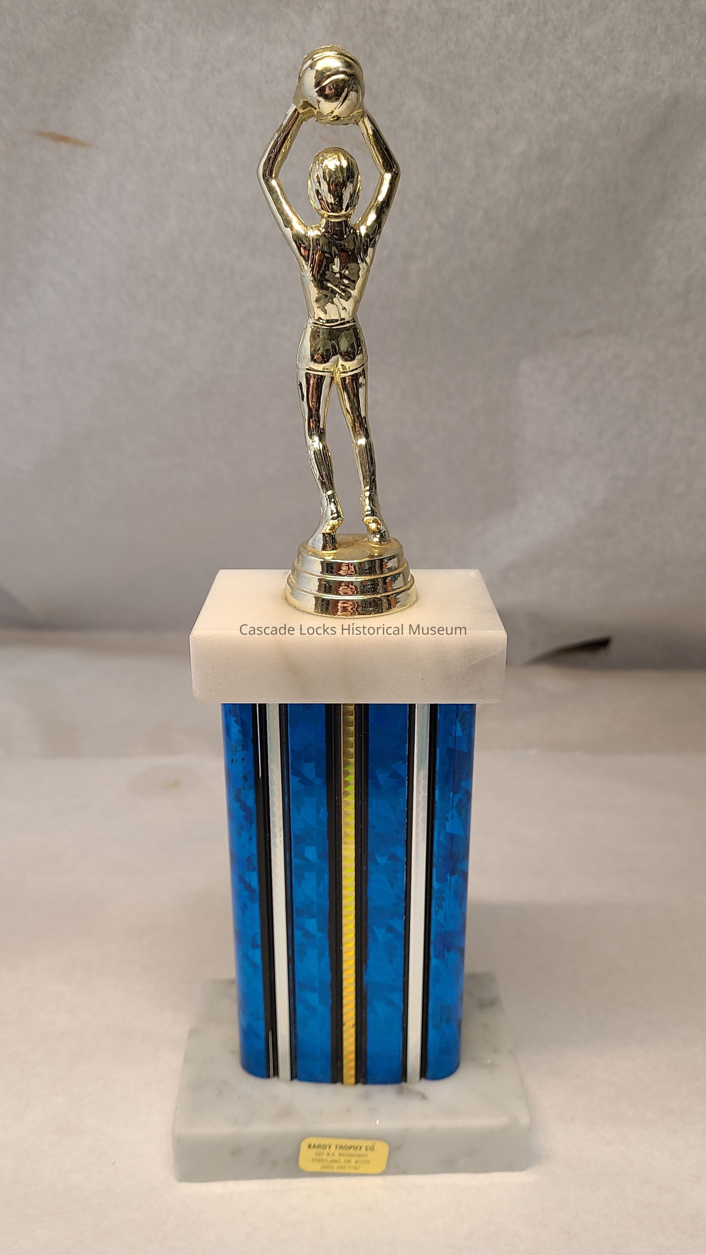 Trophy awarded to Rhianna Wimberley, 1999. Trophy is 11-1/2 inches tall with an female basketball player on top.