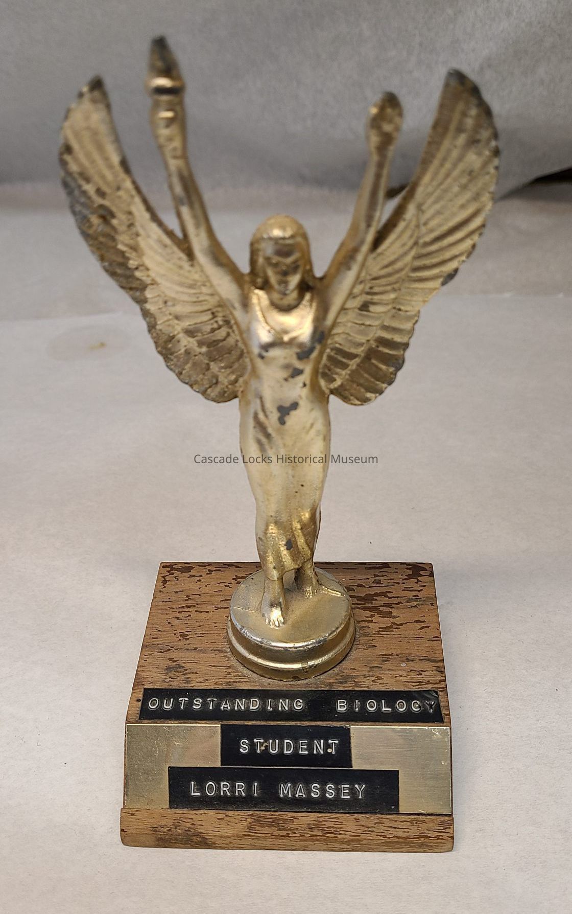 Trophy awarded to Lorraine Massey. Trophy is 6-1/2 inches tall with an angel-winged figured holding a torch on top.