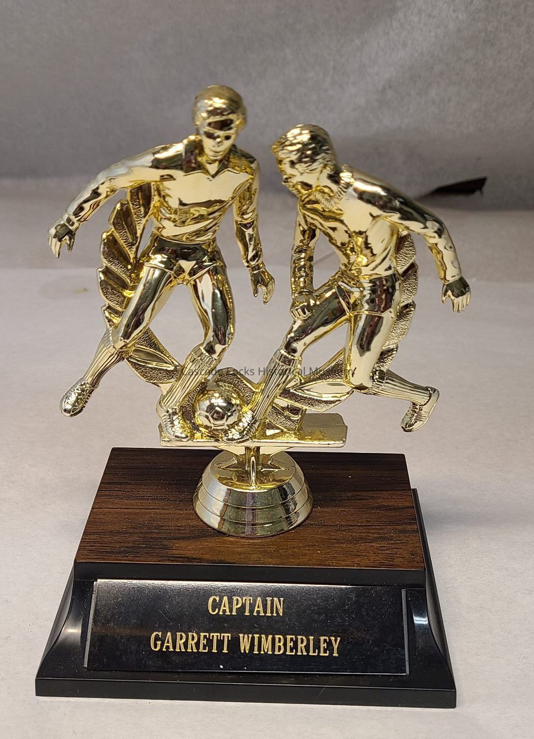 Trophy awarded to Garrett Wimberley. Trophy is 11-1/2 inches tall with two soccer players on top. Award states, "Captain Garrett Wimberley."