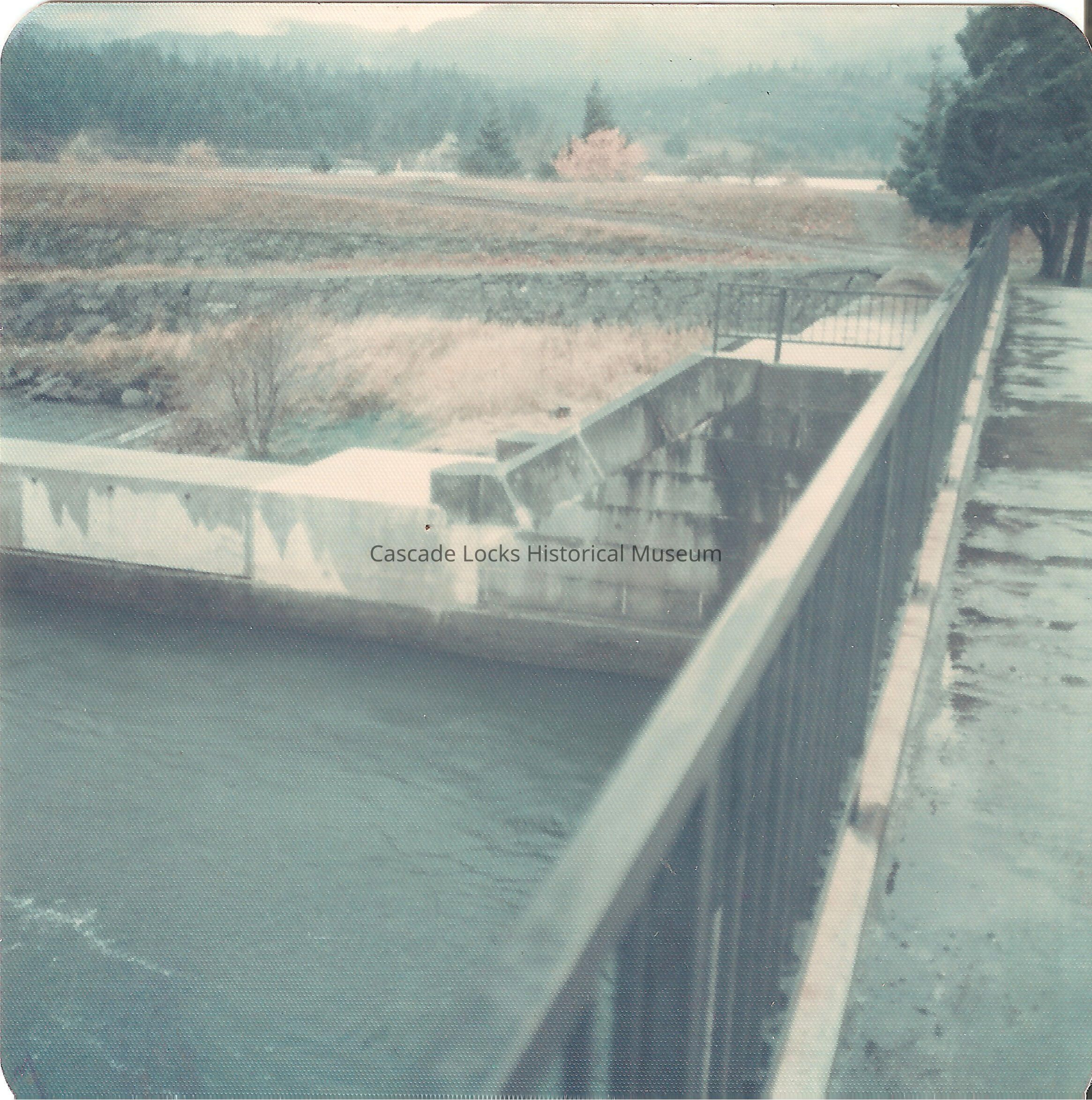 Image of the new updates to the Cascade Locks canal after the construction around 1978-79 when the new powerhouse at Bonneville dam was installed and raised the water.