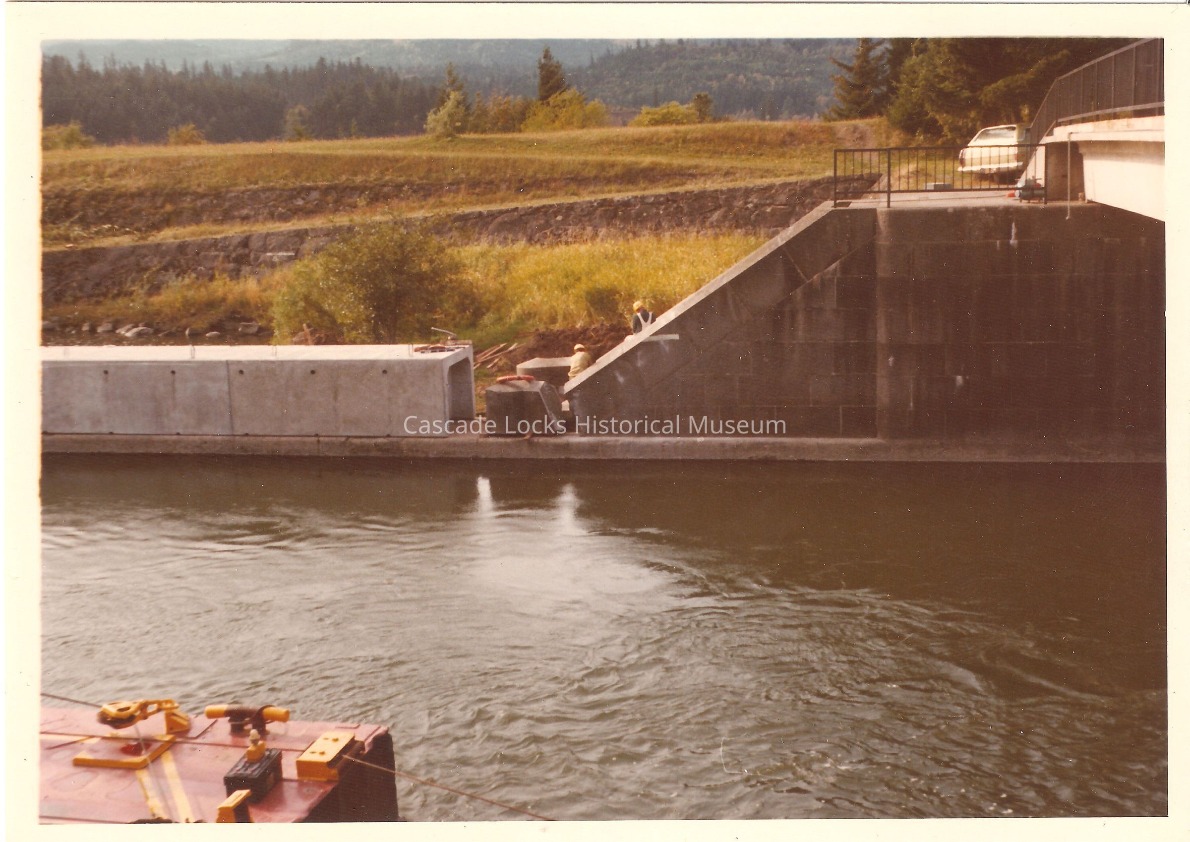 Image of the Cascade Locks canal during the updates and construction around 1971 when the new powerhouse at Bonneville dam was installed and raised the water. In the image two construction workers removing the base of the staircase railing to move it upward and shorten the staircase.