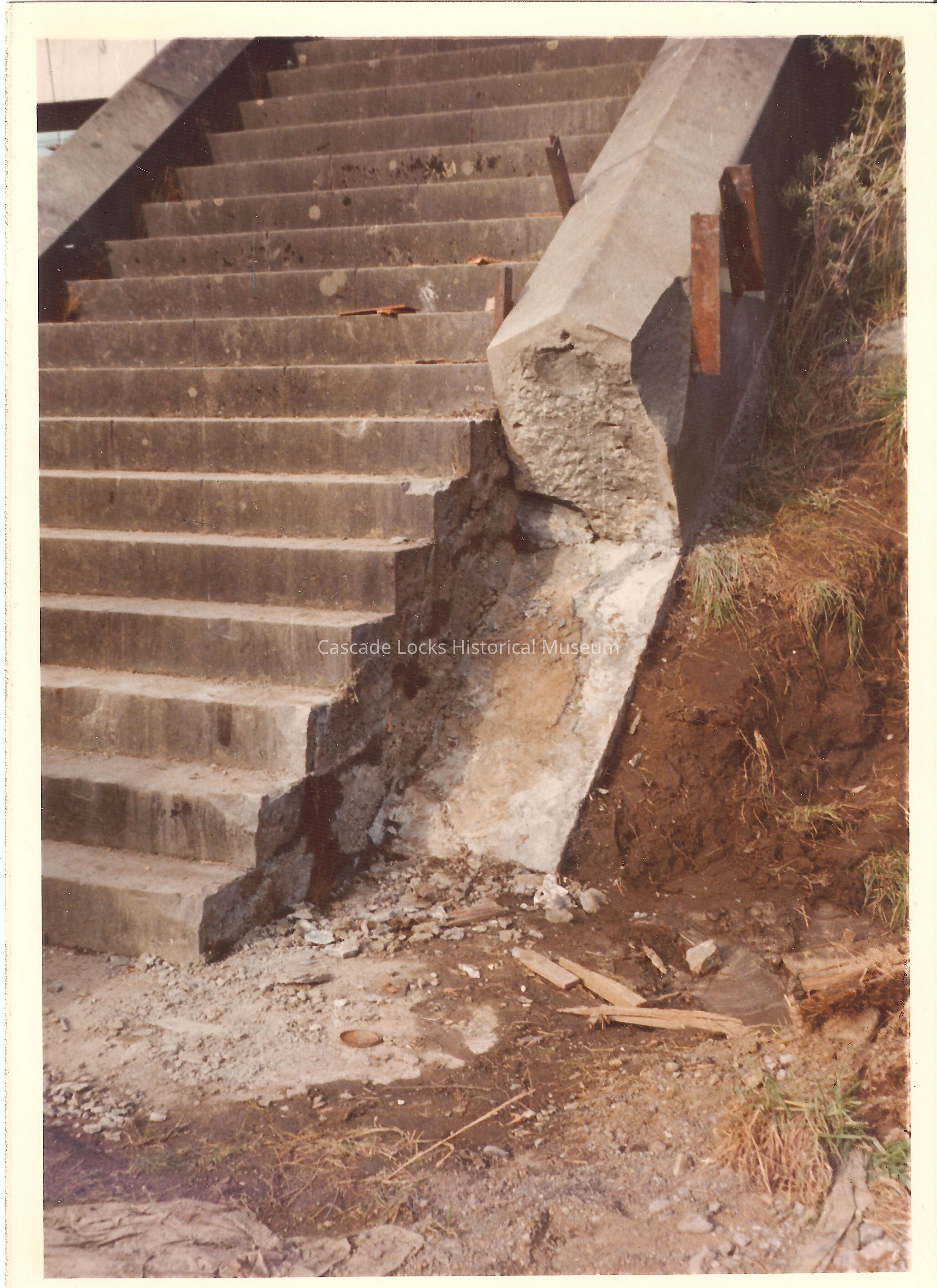 Photograph of the removal of the base of the stone staircase on the Cascade Lock canal so the staircase can be shortened.