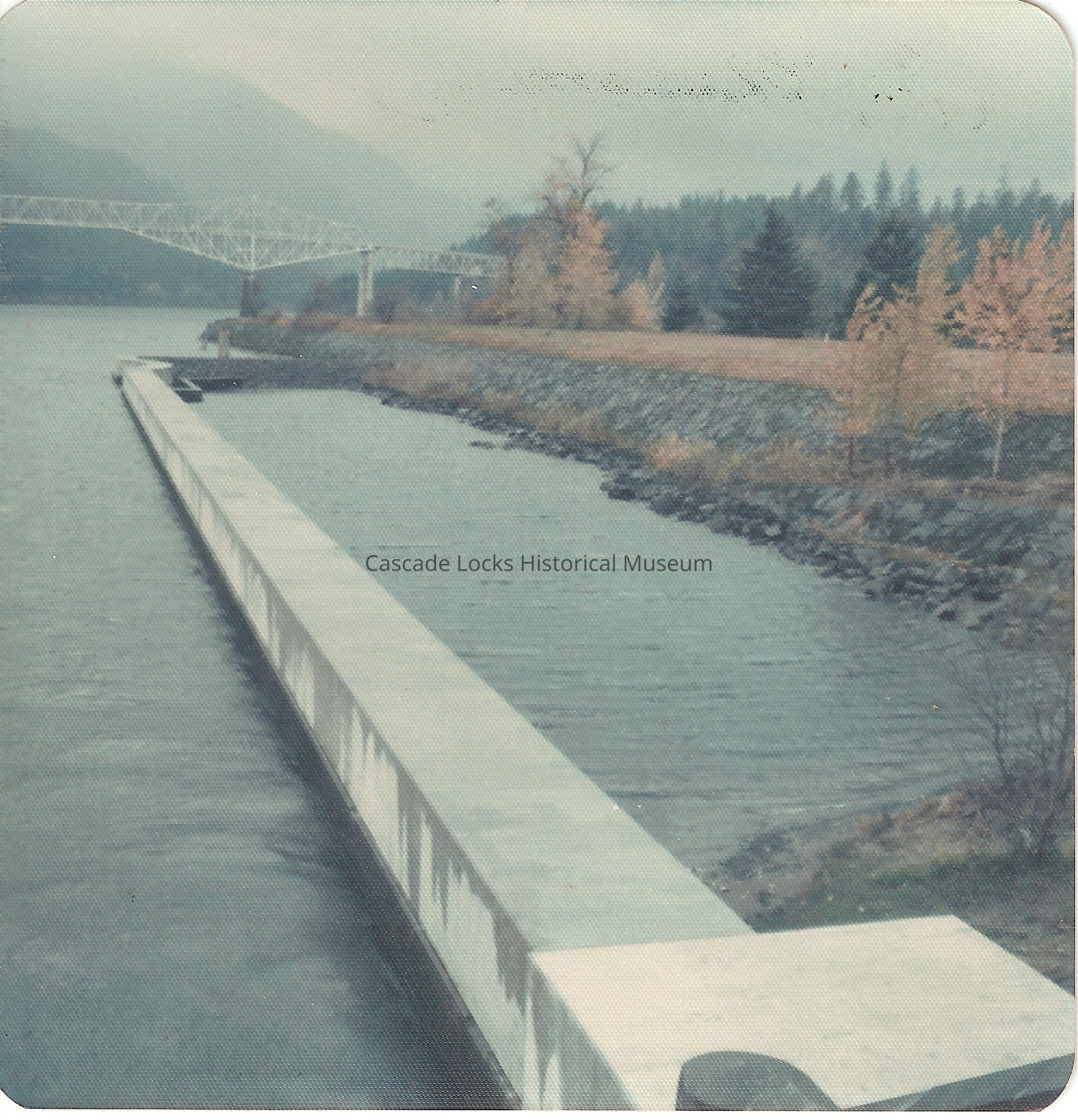 Photograph of the Cascade Locks Canal with the Bridge of the Gods and Thunder Island in the background.