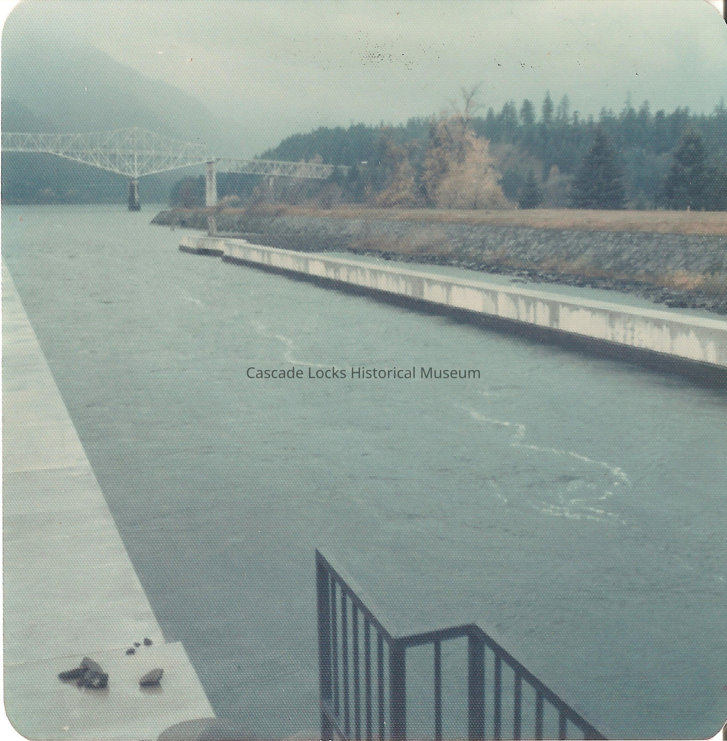 Photograph of the Cascade Locks Canal with the Bridge of the Gods and Thunder Island in the background. Back of card reads, "C. L. Canal."