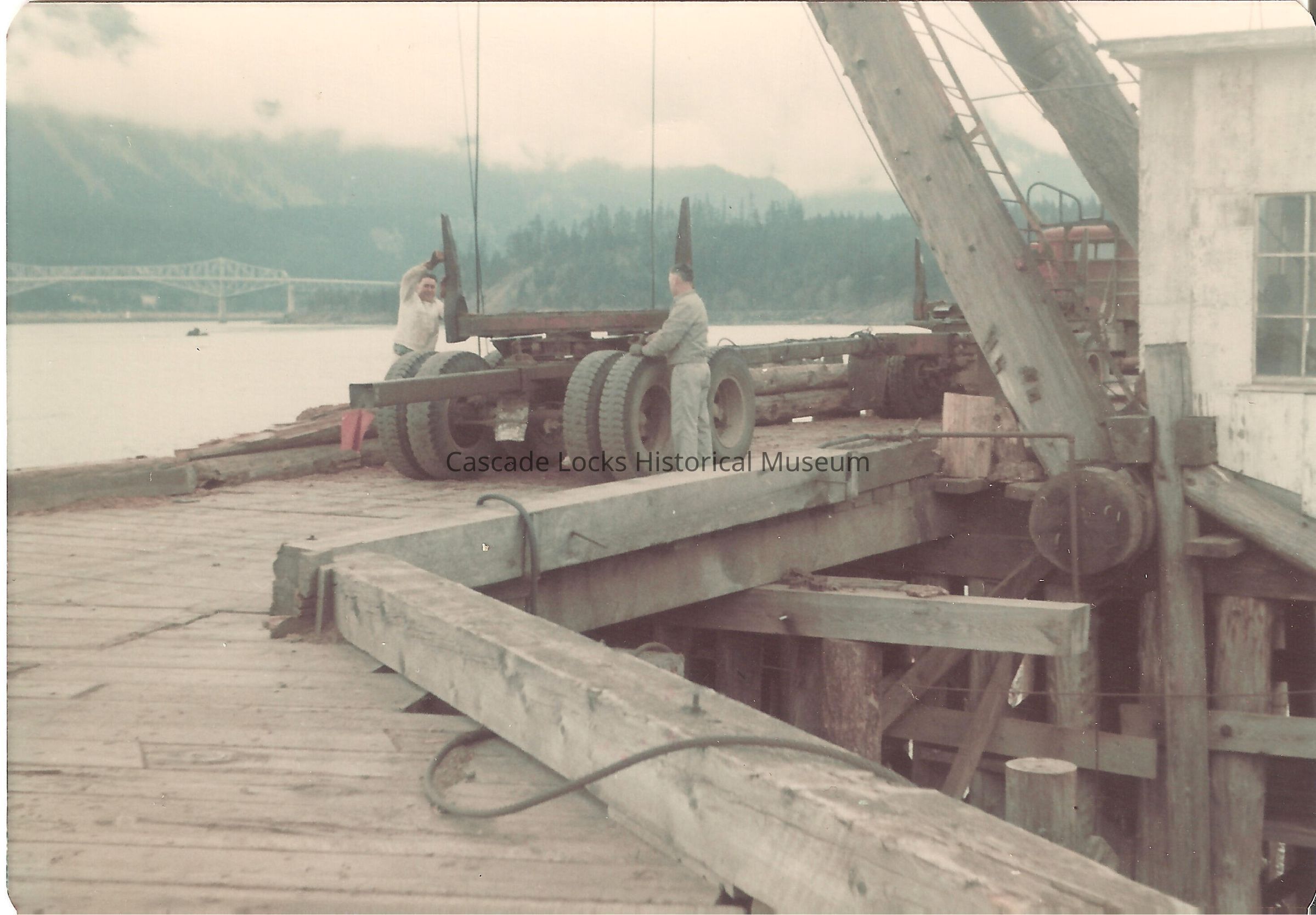 Two men preparing a logging truck at the saw mill. In the background the Columbia River and the Bridge of the Gods are visible.
