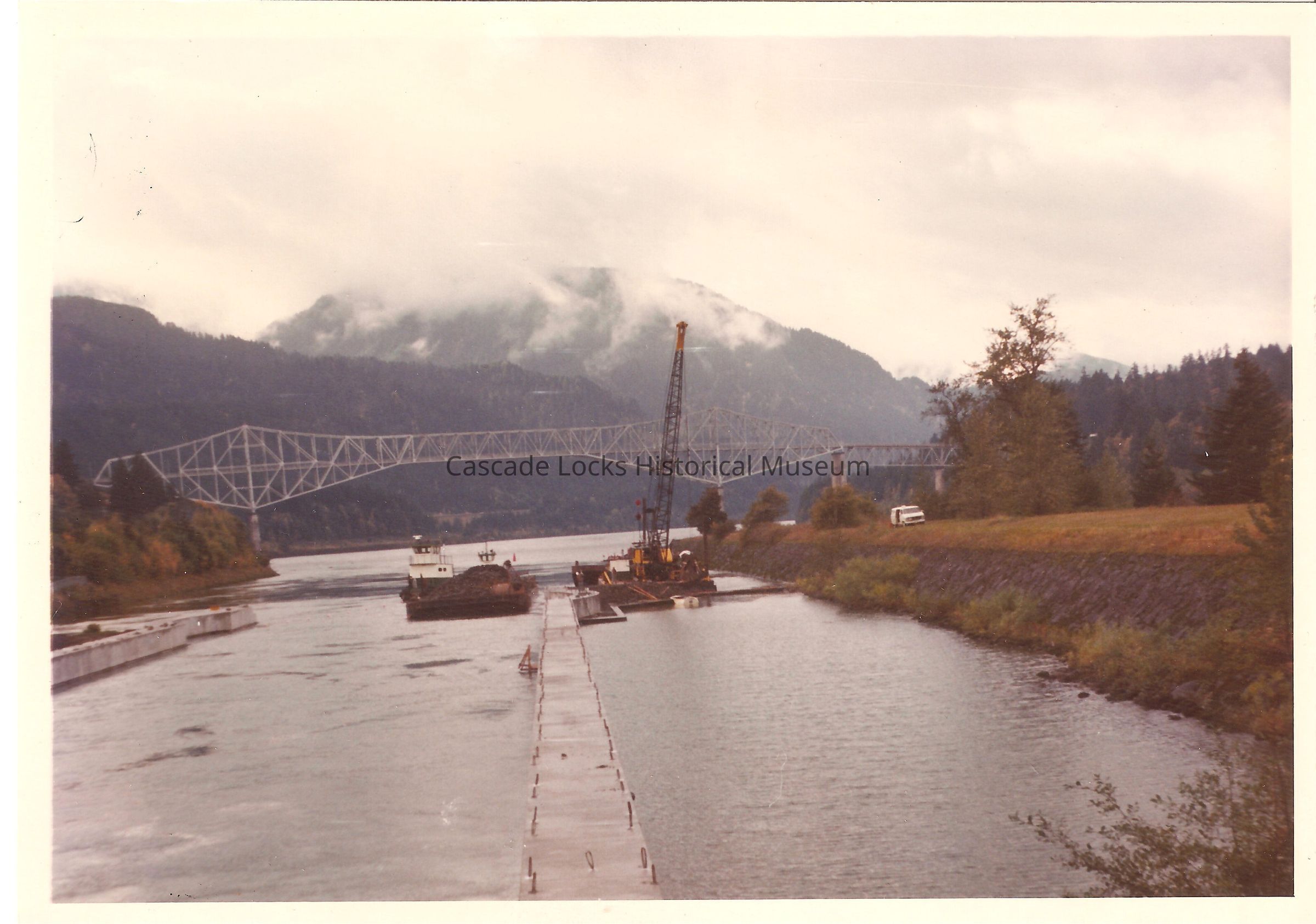 Image of the Cascade Locks canal before the walkway was raised around 1978-79. In the image a large crane on a barge is seen in the water while. In the background the bridge of the gods is visible.