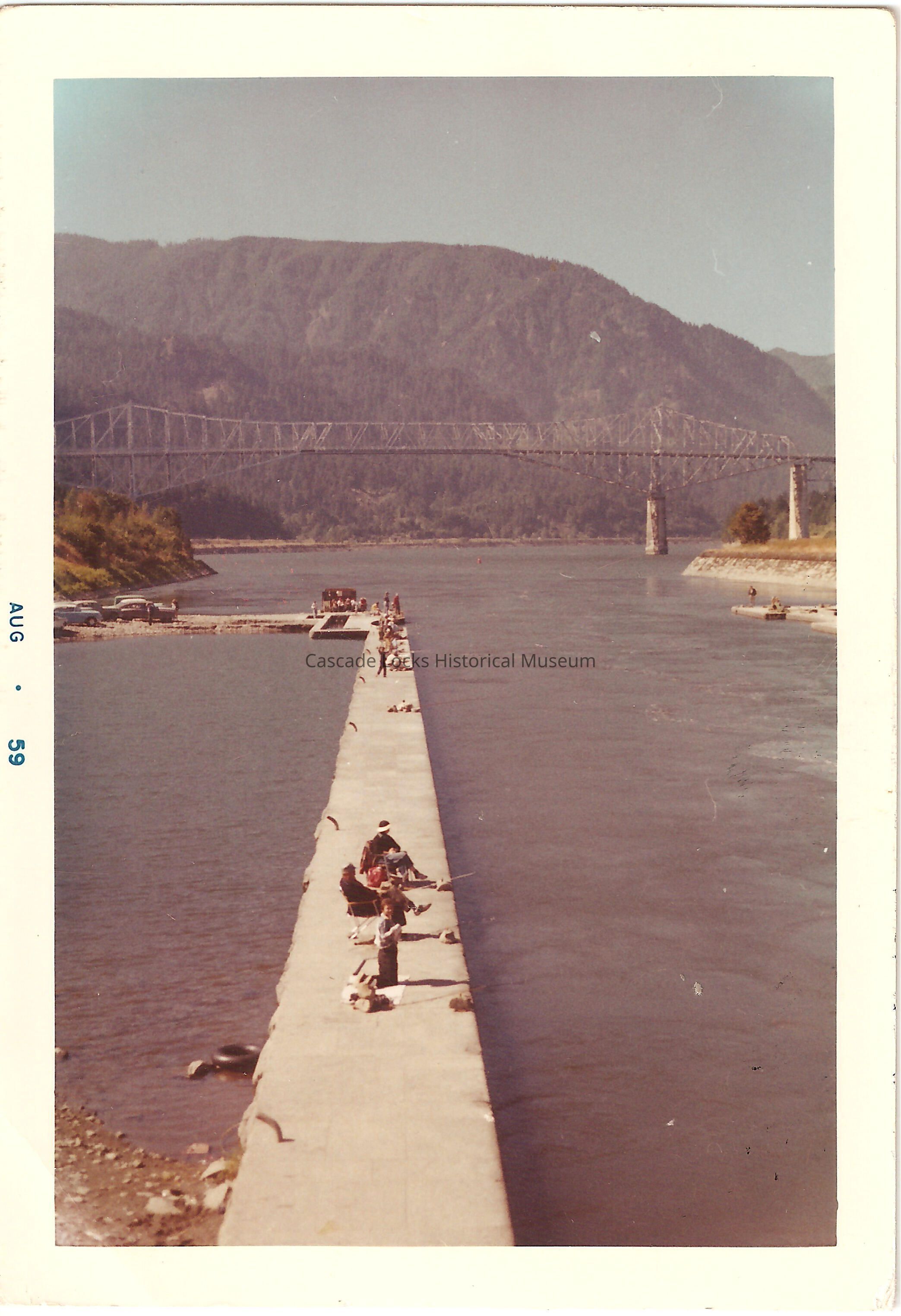 Photograph of a group of people fishing off the edge of the Cascade Locks canal. In the image the lock gate is visible towards the end of the dock. Sid of image reads, "Aug 59."