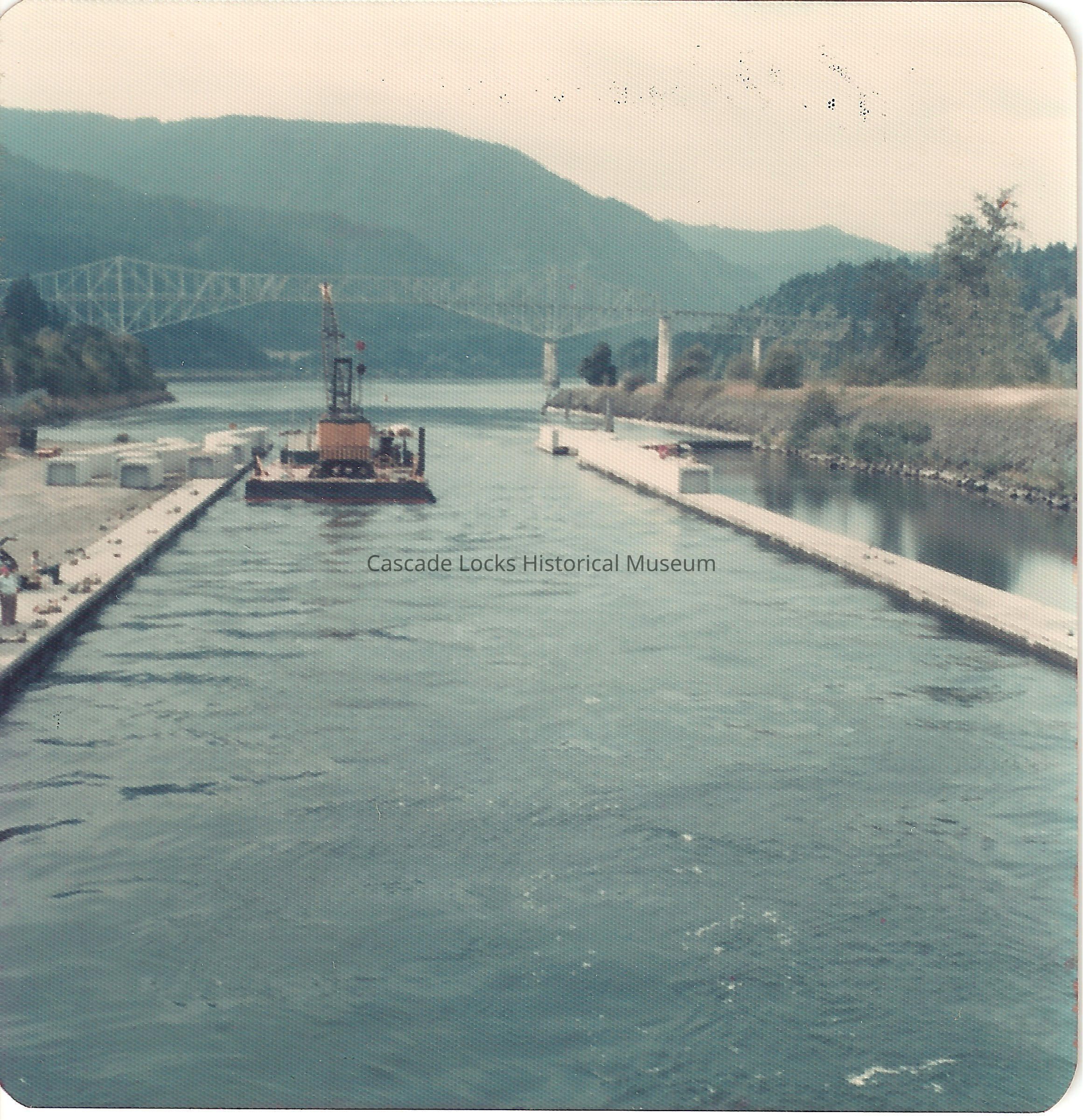 Photograph of the Cascade Locks Canal with the Bridge of the Gods and Thunder Island in the background. In the image there is a crane on a barge in the river. Image is from around 1978-79 when the sides of the locks where raised when the second powerhouse was built at Bonneville dam.