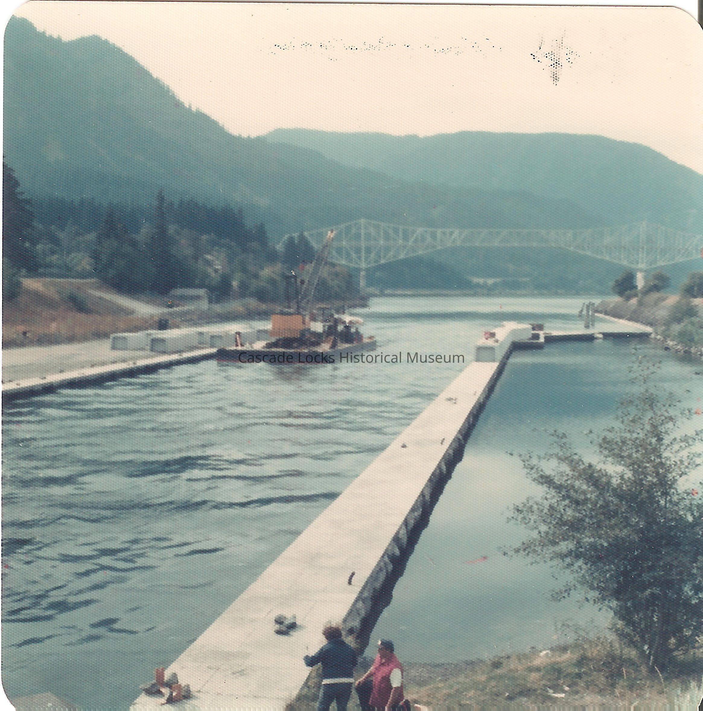Image of two people fishing on the walkway of the Cascade Locks canal before the walkway was raised around 1978-79. In the image a large crane on a barge is seen in the water while. In the background the bridge of the gods is visible.