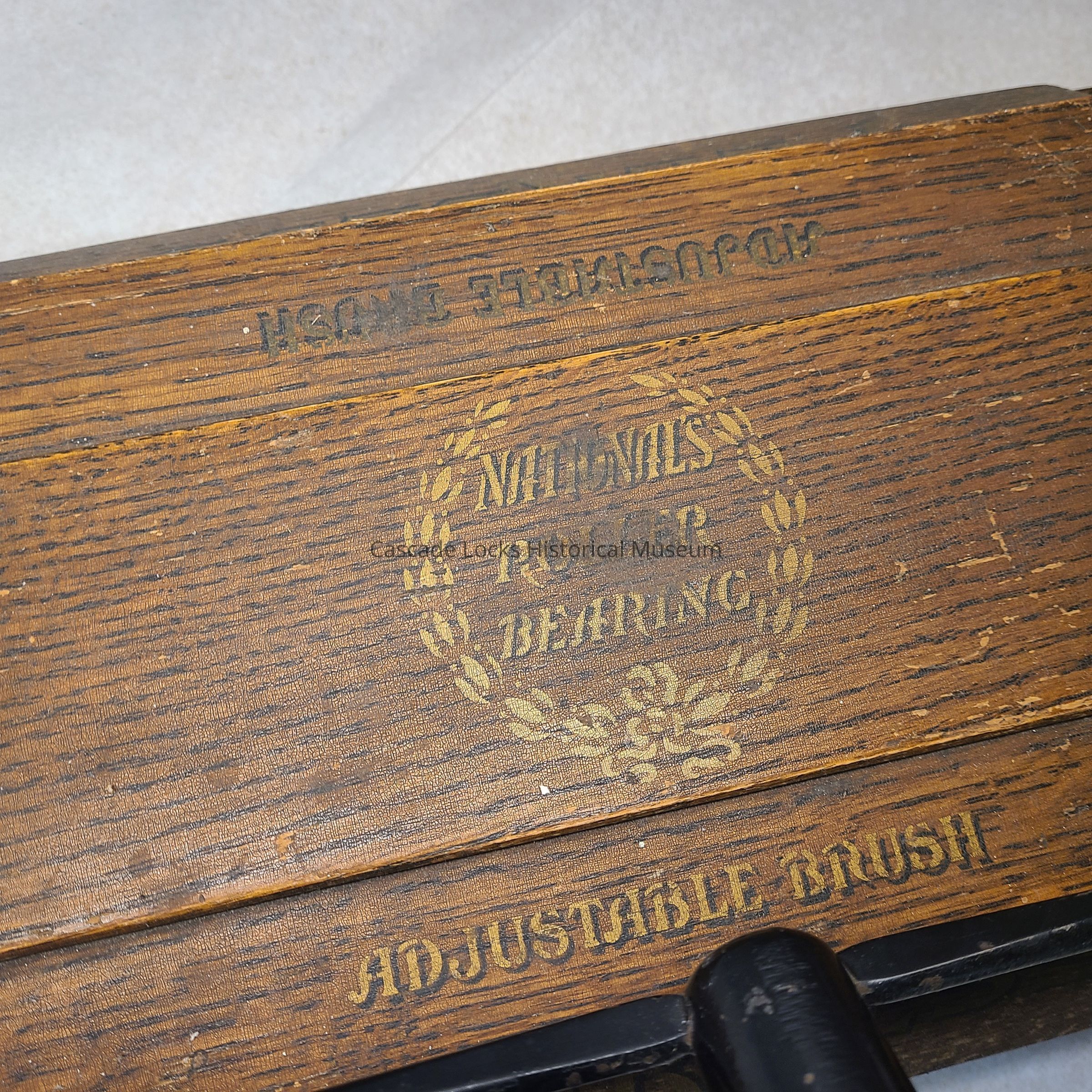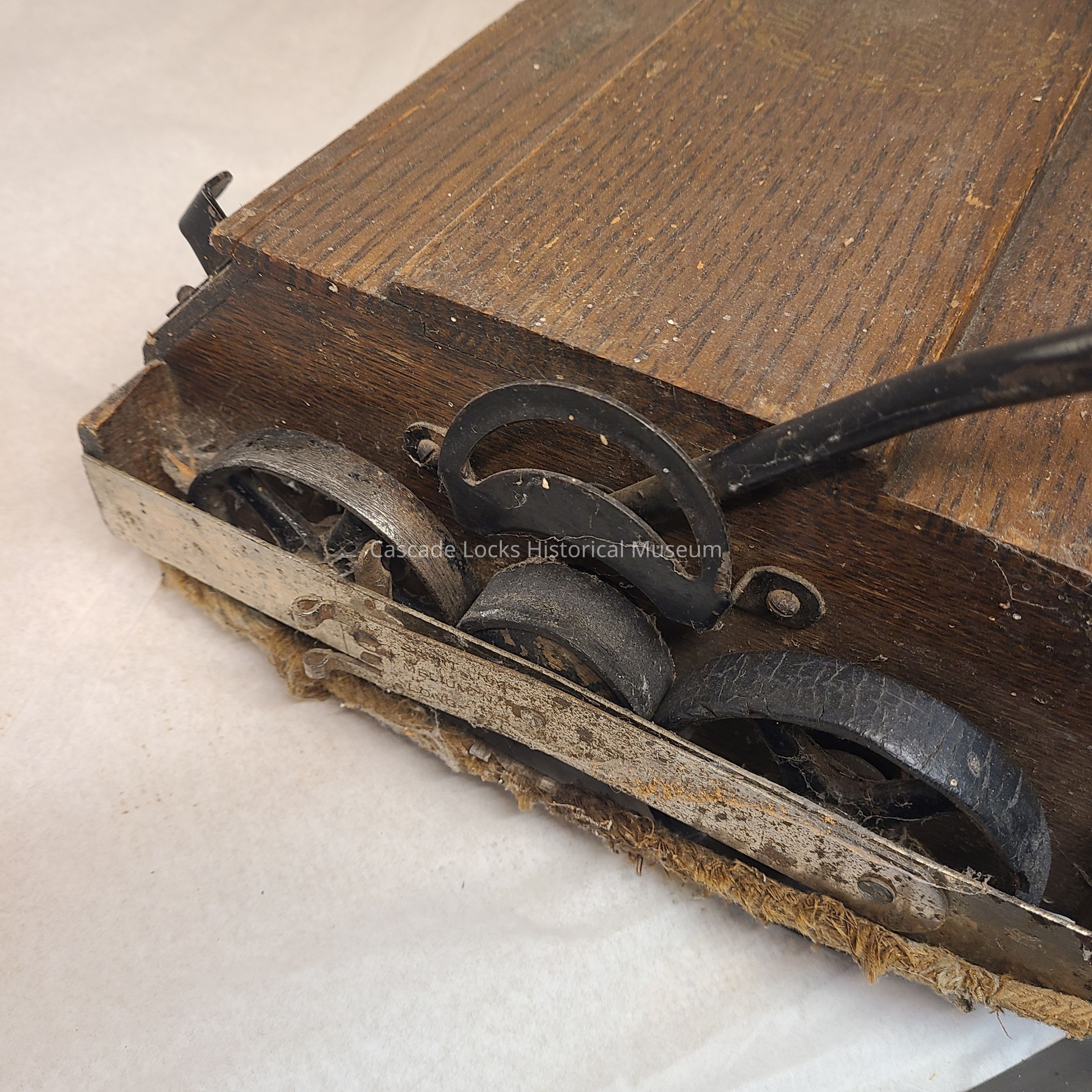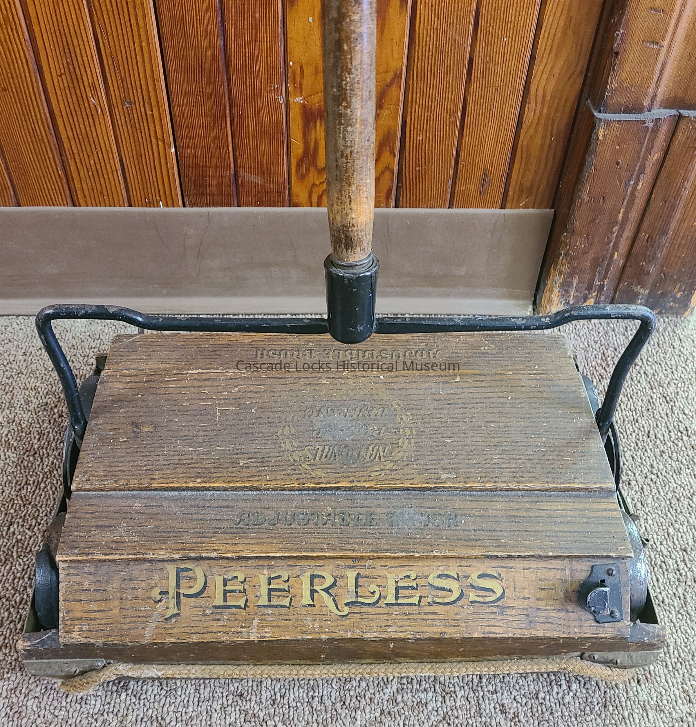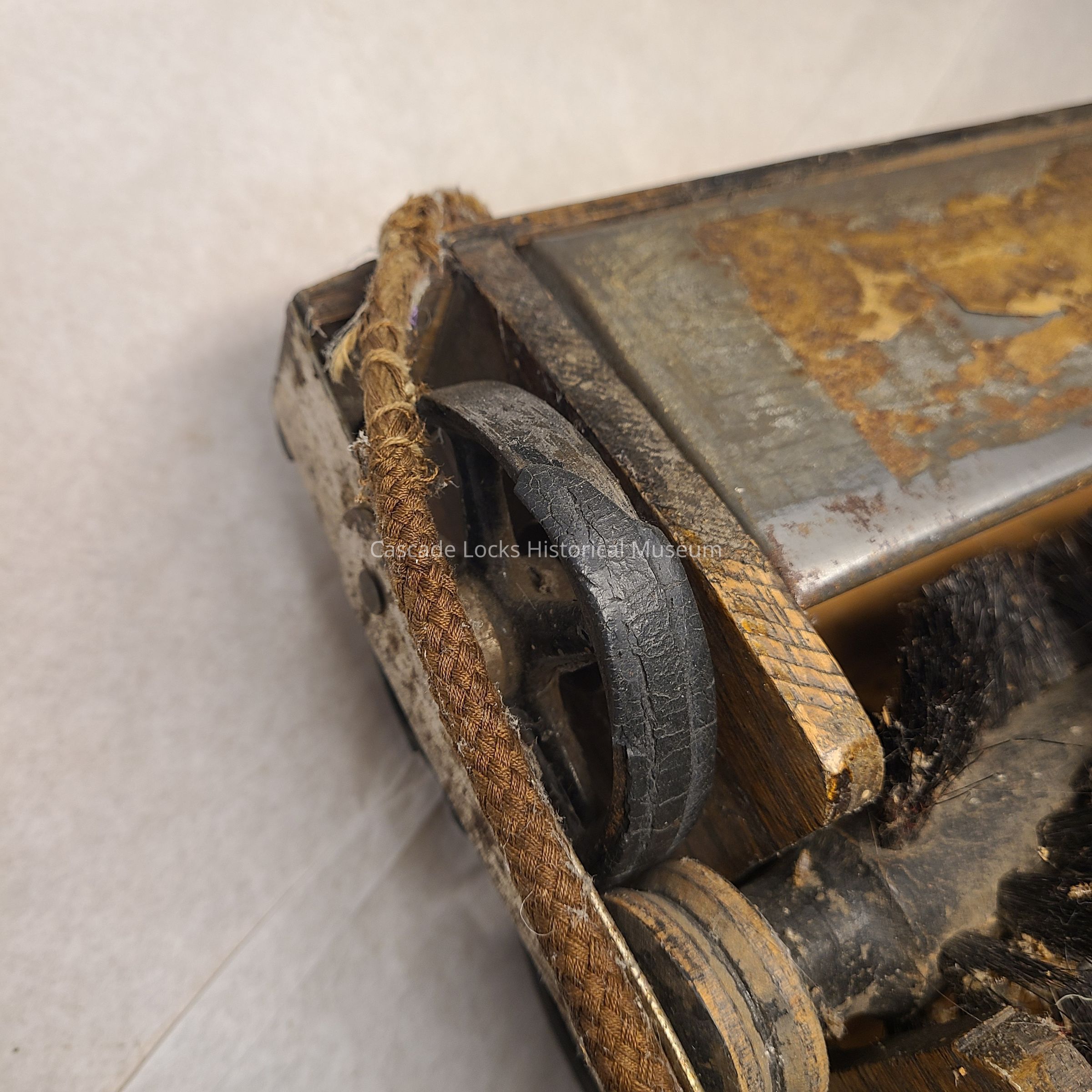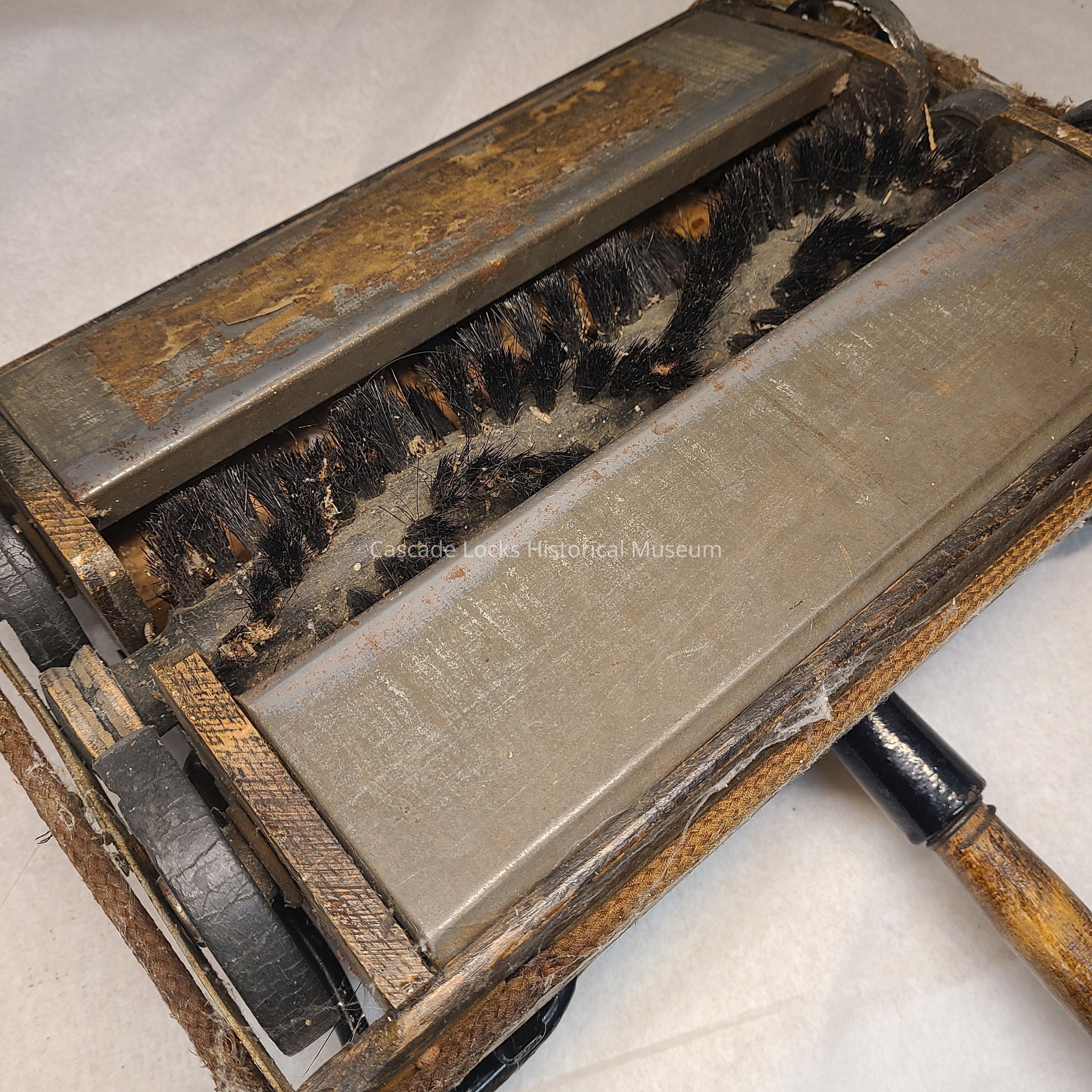 The top and handle of the vacuum is made of wood attached together with a metal. The two bottom trays and side wheels are made of metal. The edging around the base of the vacuum is made of fabric.