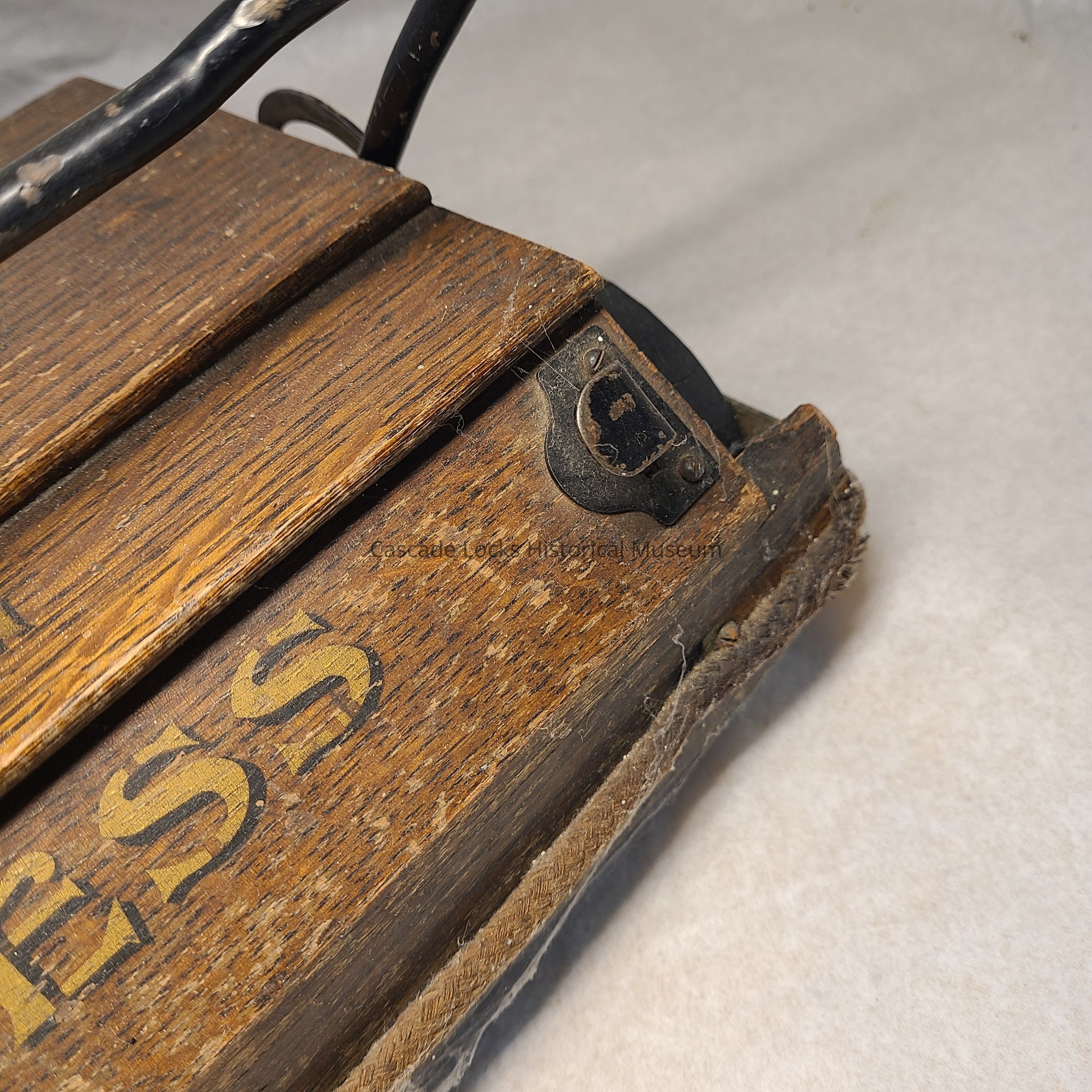 The wood is tan and brown. Metal is painted black. Wheels are silver. The fabric rope around the base is yellow/tan. The font on the wood is gold and black.
