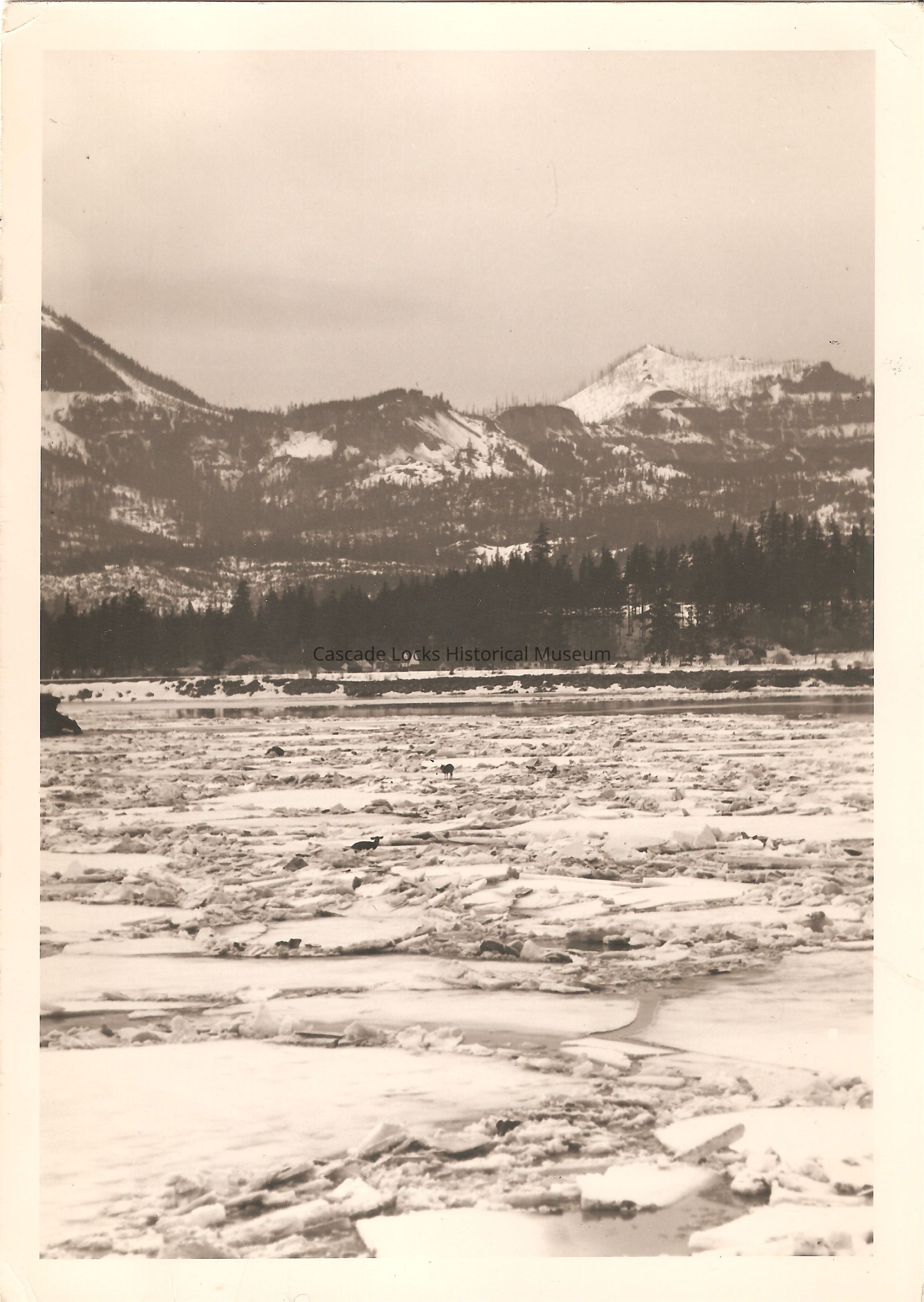 Image of the frozen Columbia River. Chunks of ice have been broken and refroze creating rifts of sharp chucks of ice. There are pockets of open water where the ice has broken and exposed the water below. In the distance two deer have made there was across the frozen ice a distance from the shore. One deer is laid down on the ice while the other one stands a ways behind it on the ice.