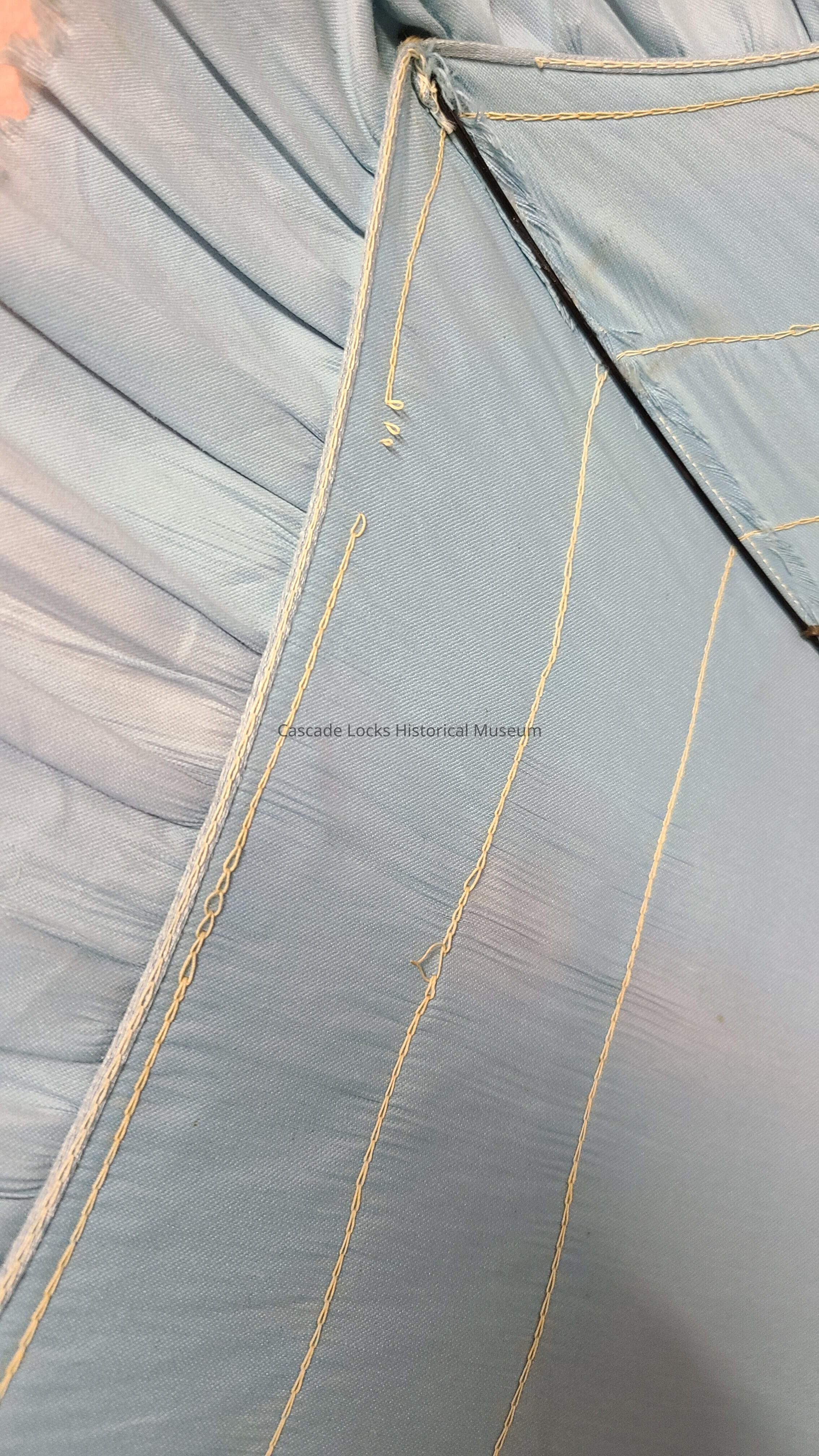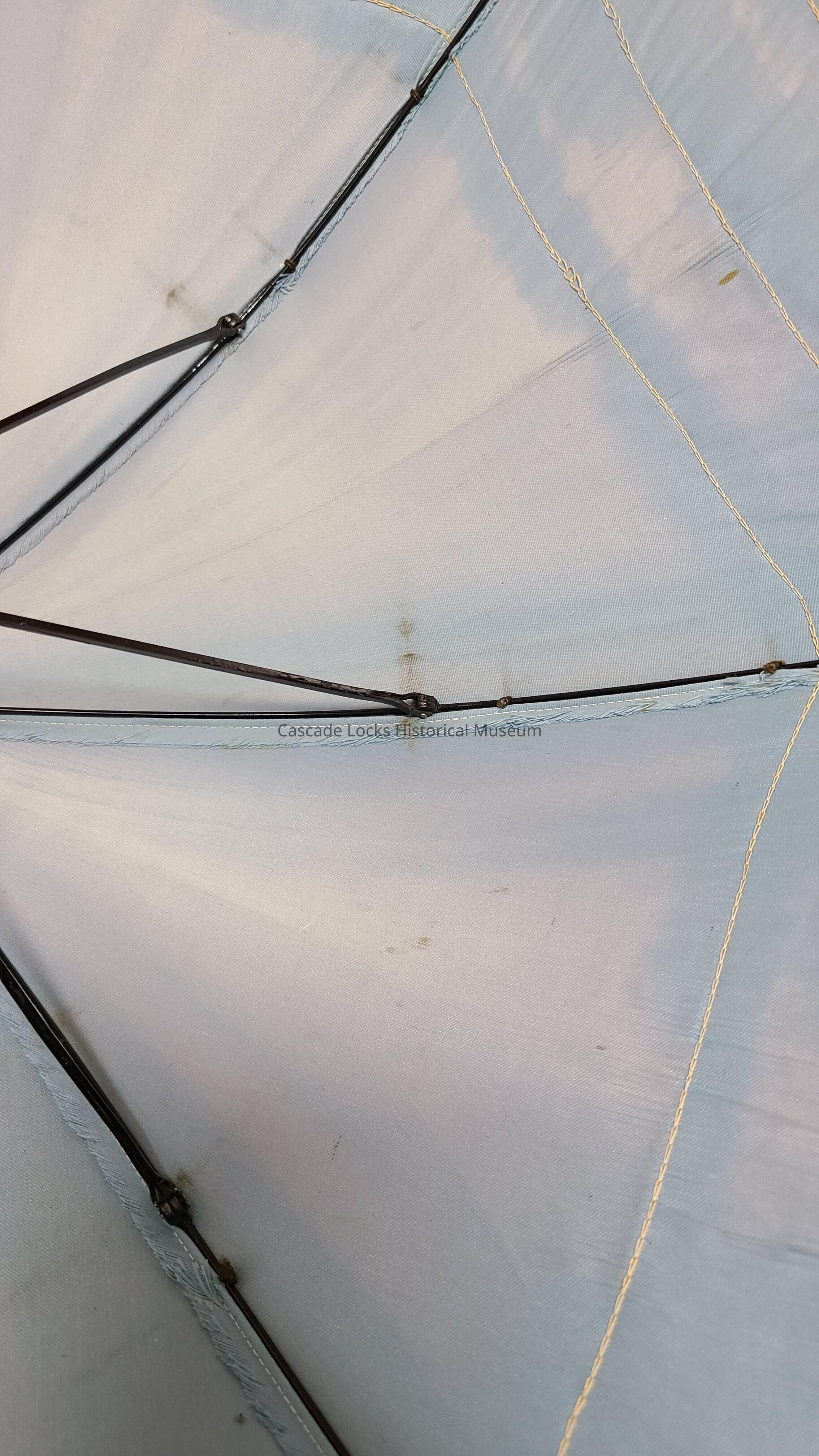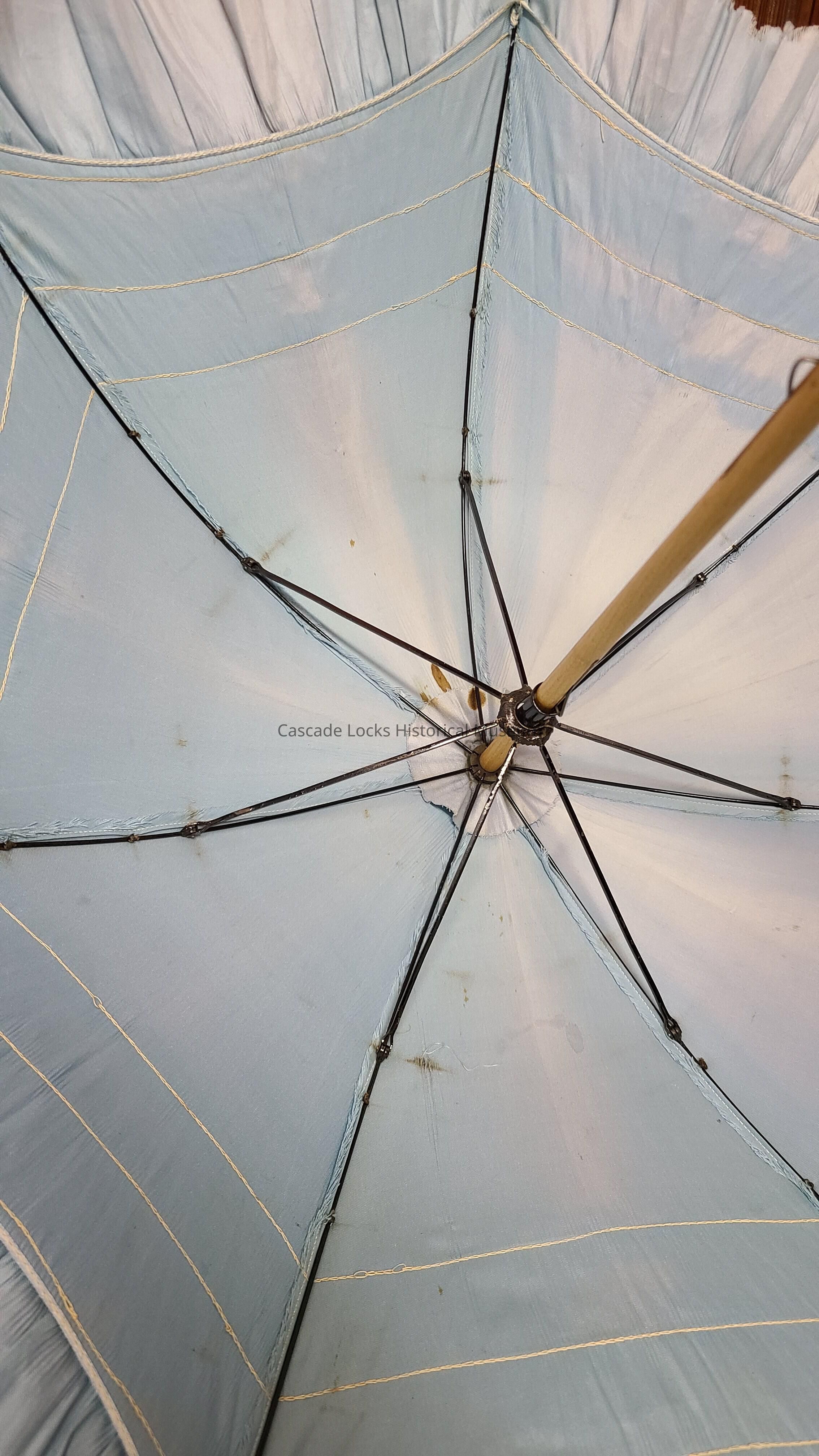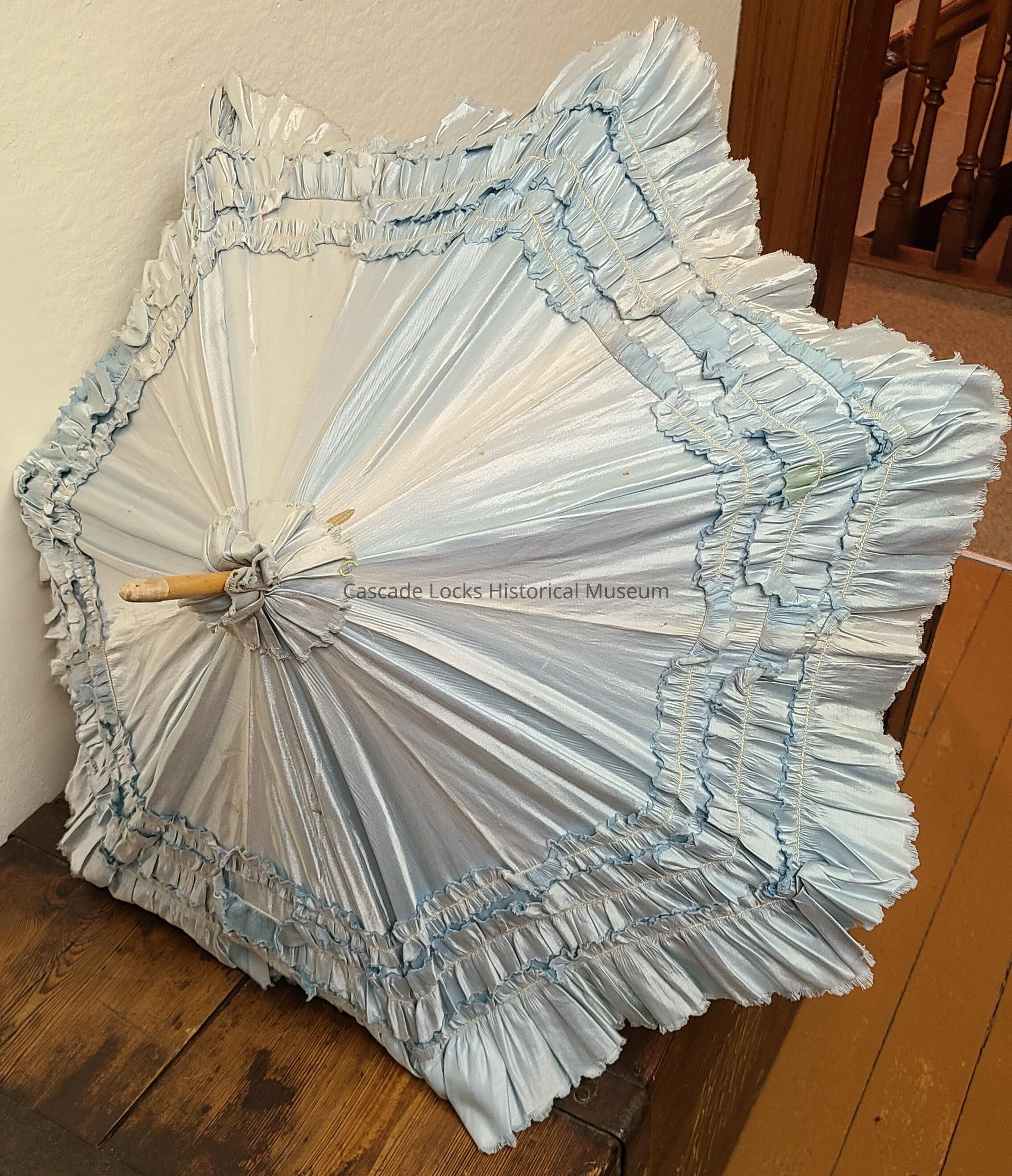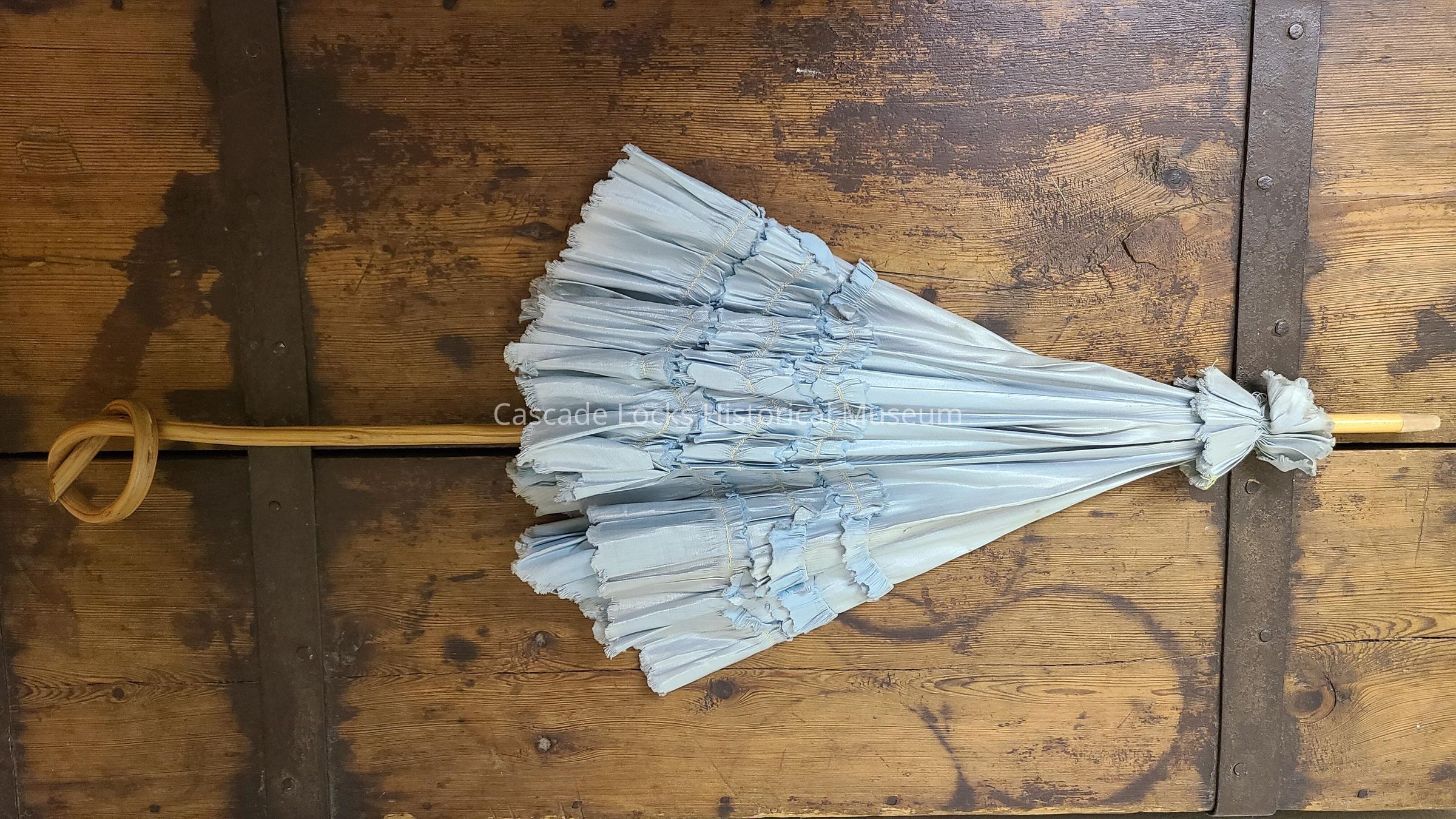 Victorian Parasol, Umbrella. Consistent with a 1840's carriage parasol. Made of blue silk chiffon with fringe bottom, wooden stick with tied handle, and metal ribs. Given to Julia Bender 1897.Lexicon