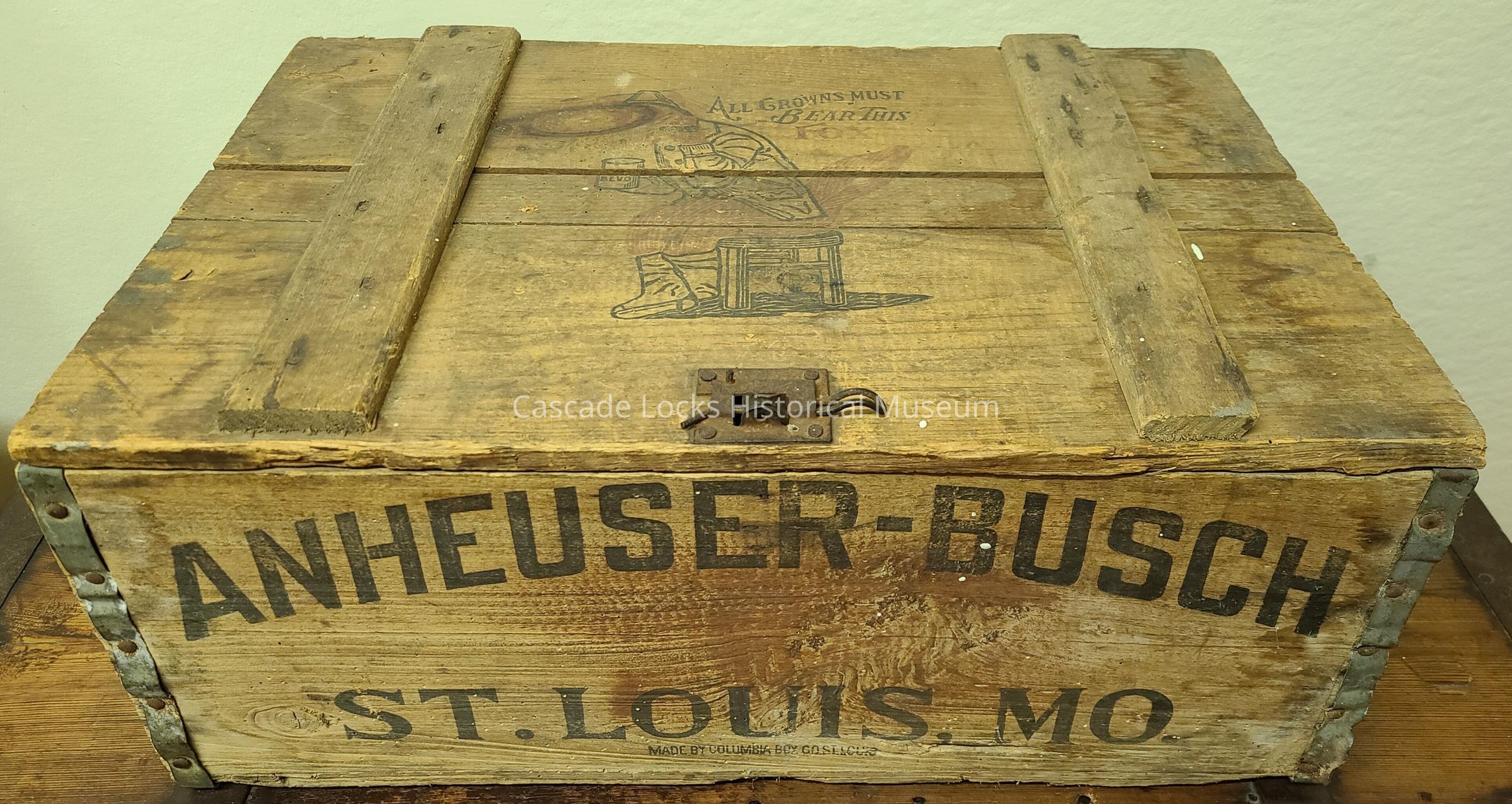 Wooden box for Anheuser-Busch Bevo beverage. Box is light wood with metal corner edging, metal hinges and a top metal latch.