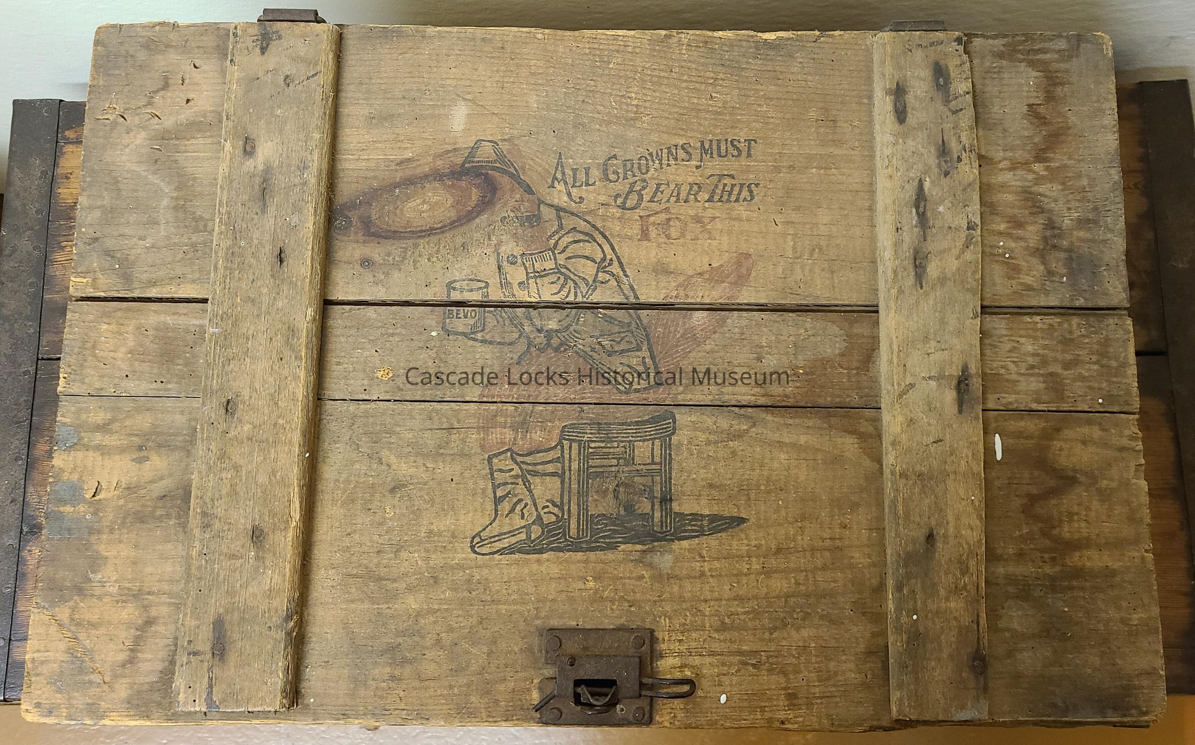 Front of box has picture of a fox sitting on a box drinking a Bevo Beverage. Next to the fox it says, "All growns must bear this fox." Front of box says, "Anheuser-Busch St. Louis, Mo." Sides of box say, "1917 BEVO," with small makers stamp that says, "District of Missouri, Union Made, St. Louis, __ 26", and a freemasons symbol in the middle.Made/Created