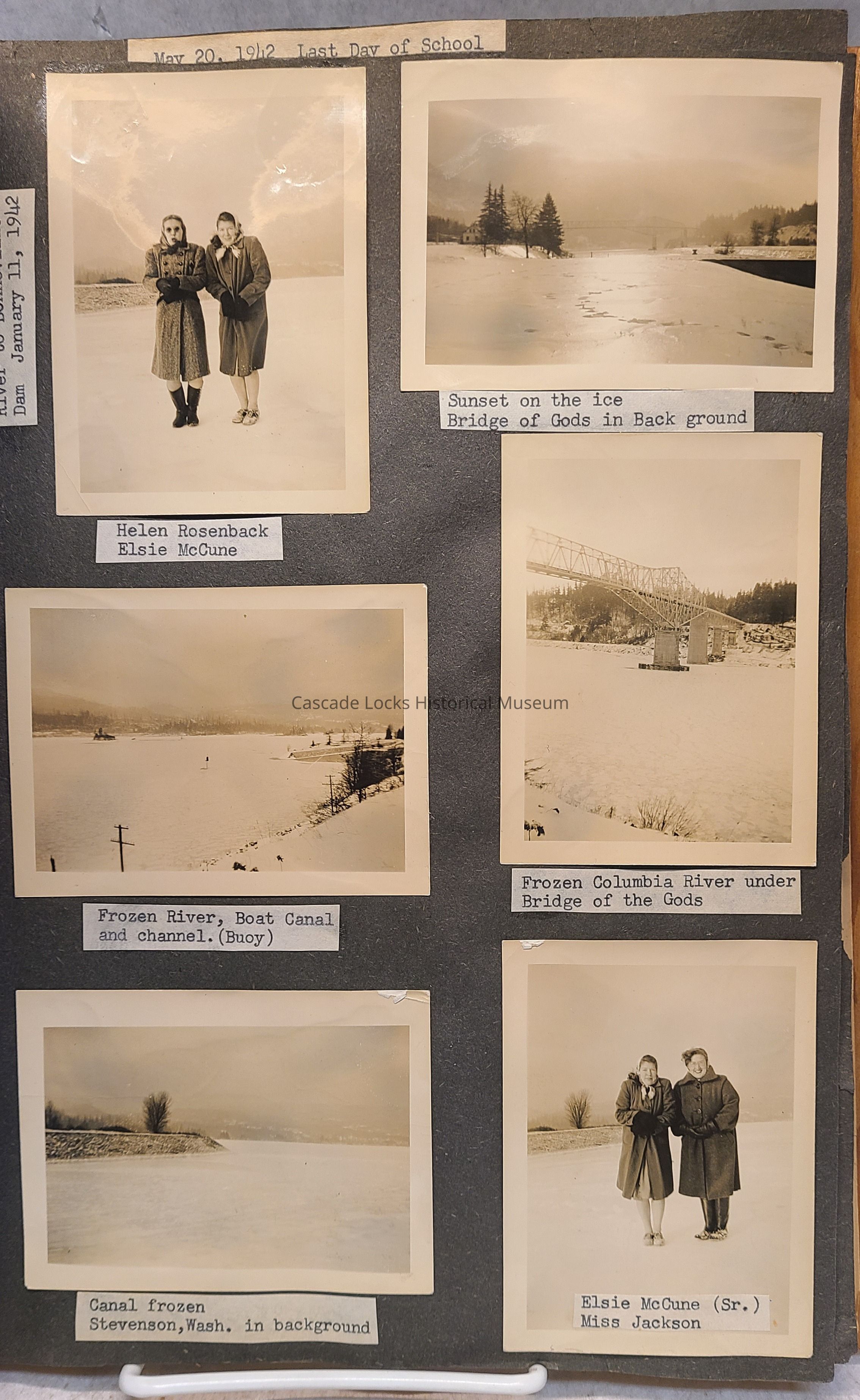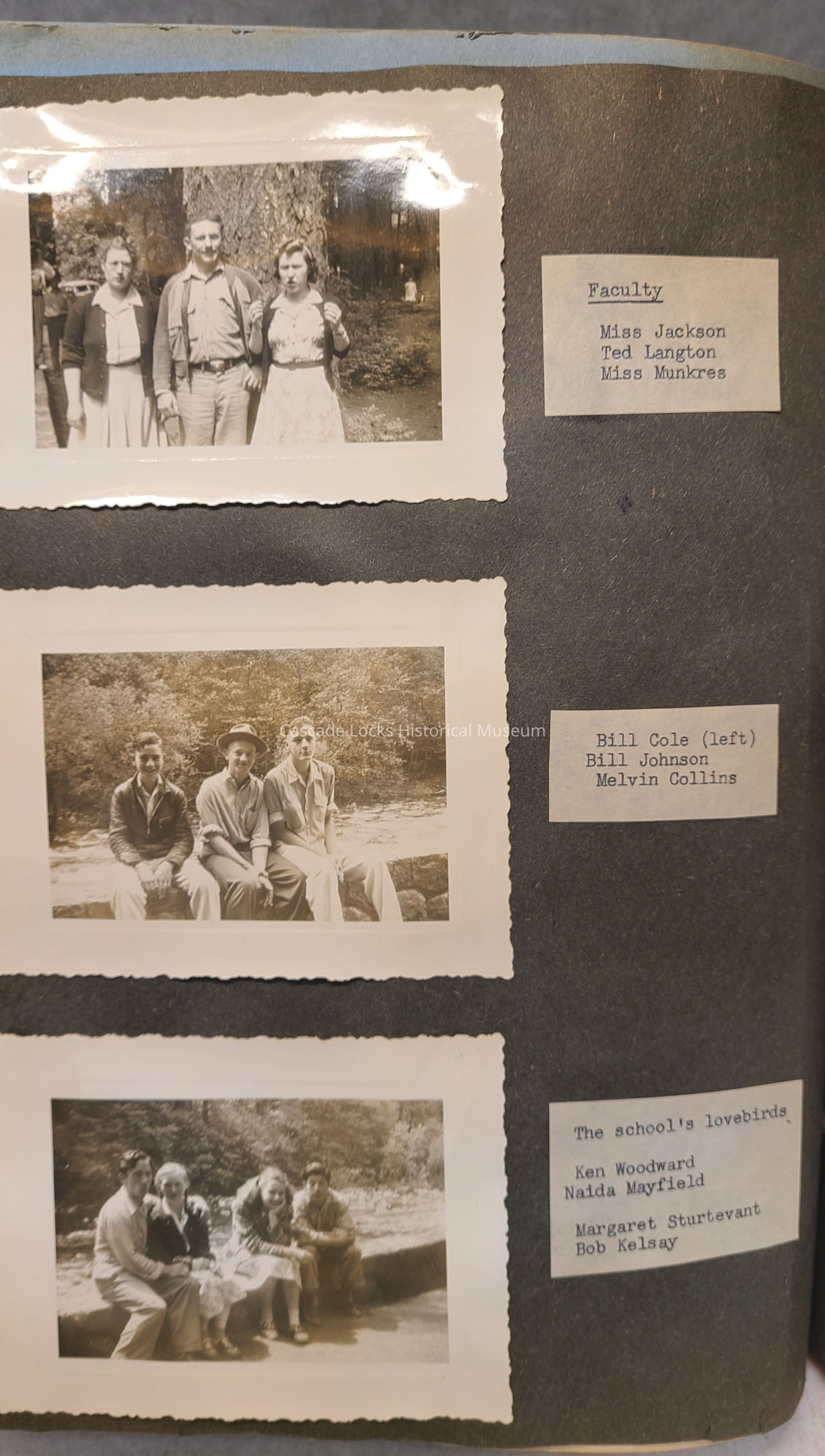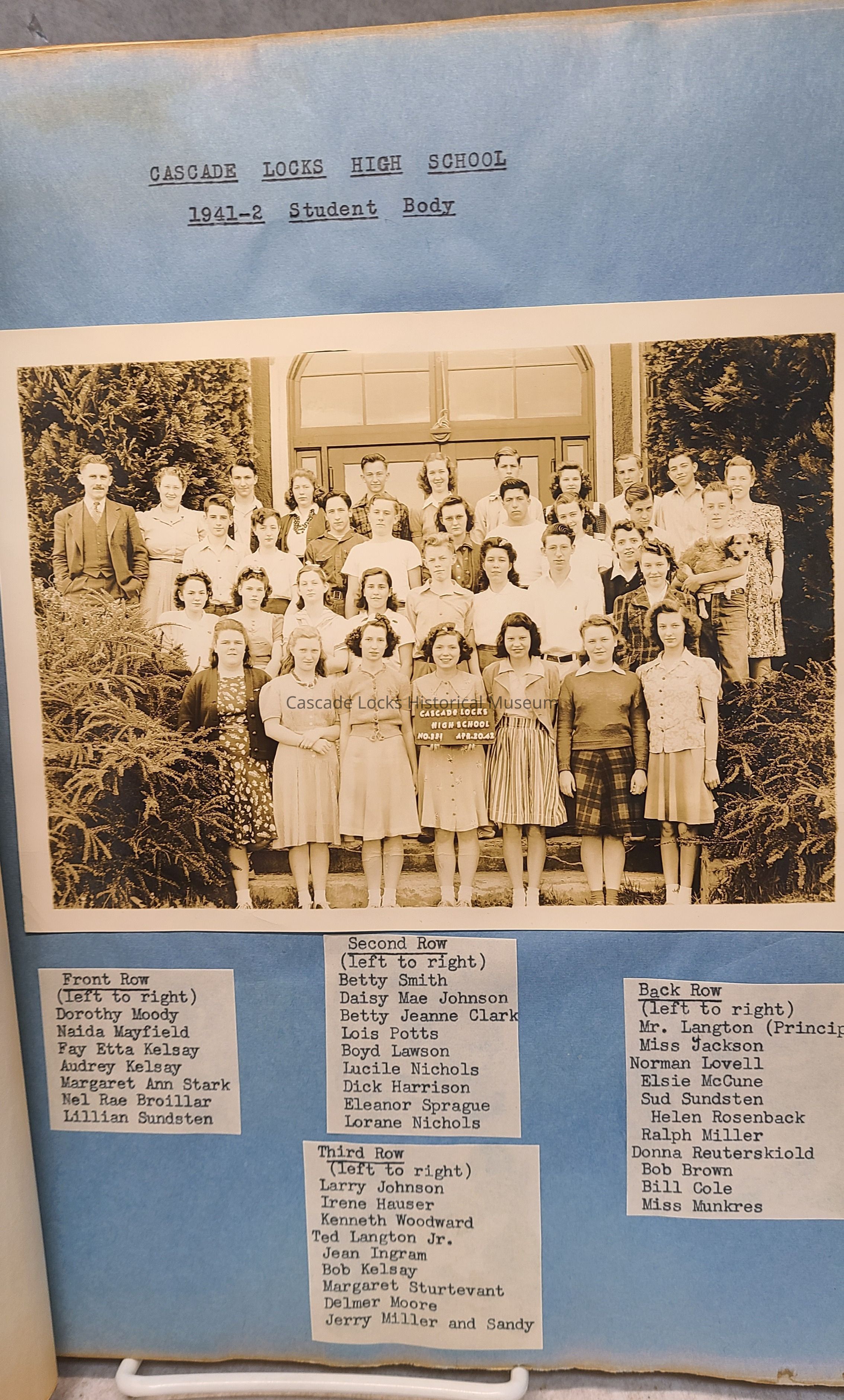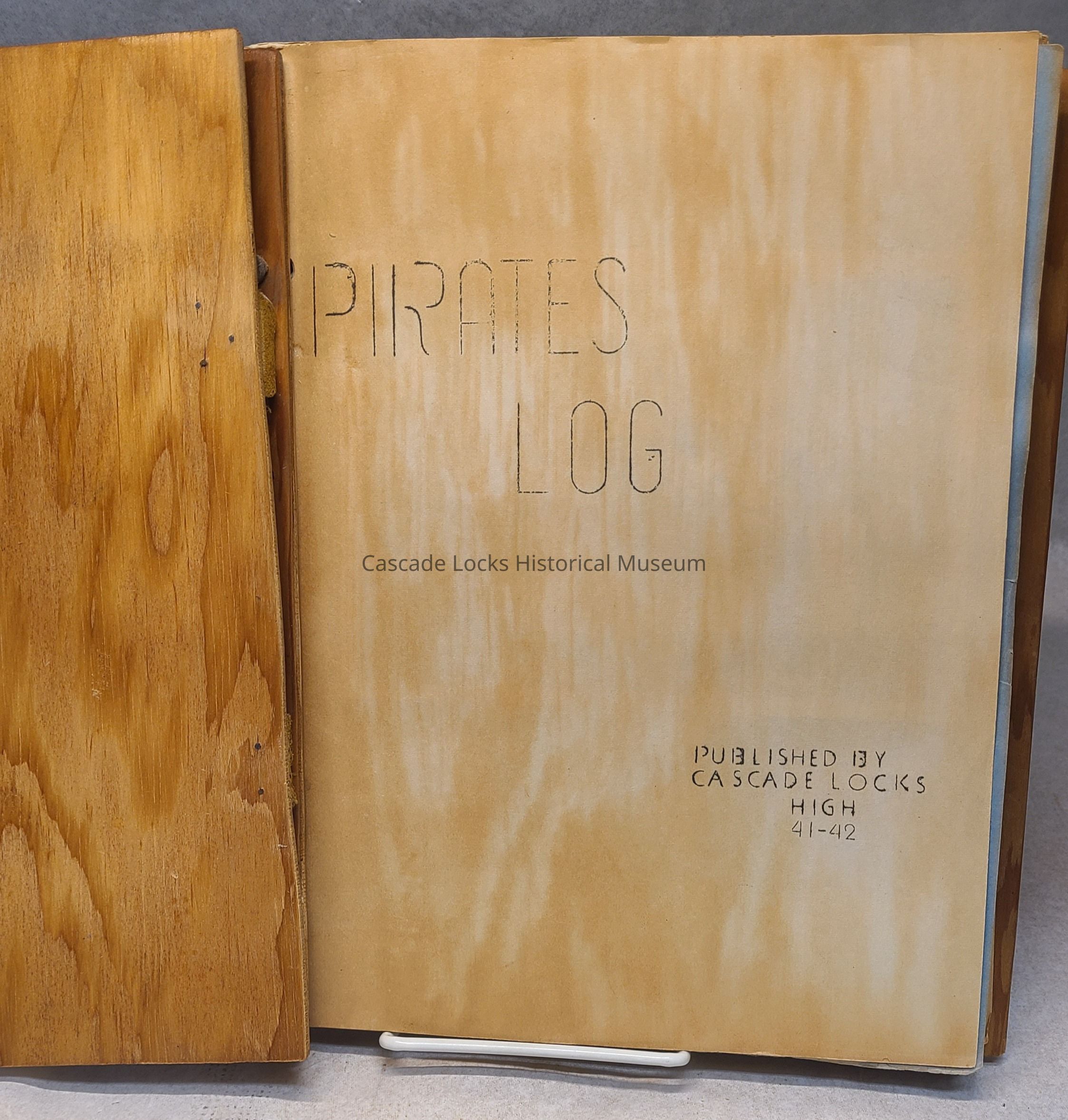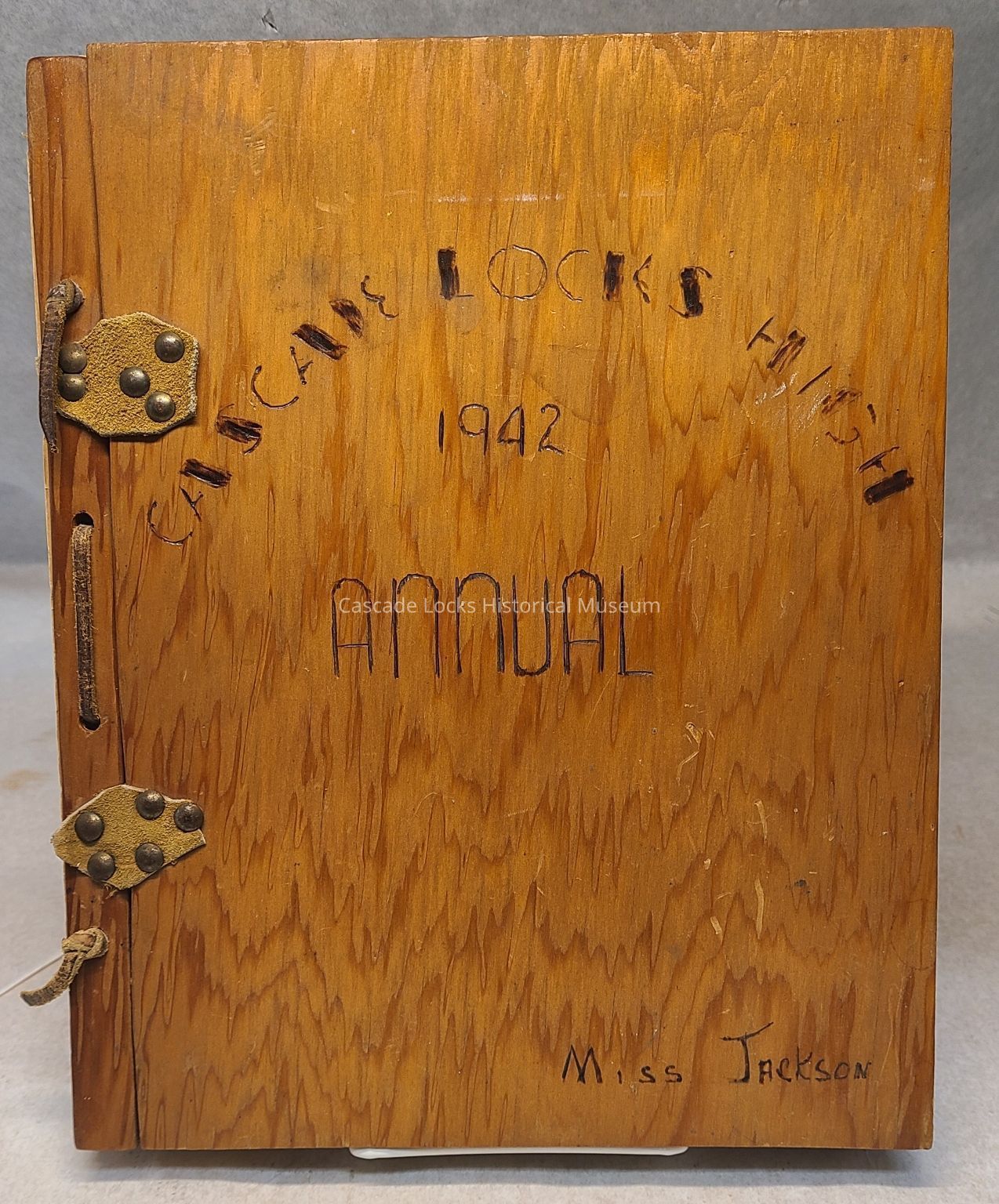 Yearbook, Cascade Locks High School 1941-1942. Front cover is made of wood. There are pictures adhered into the pages of the book.
