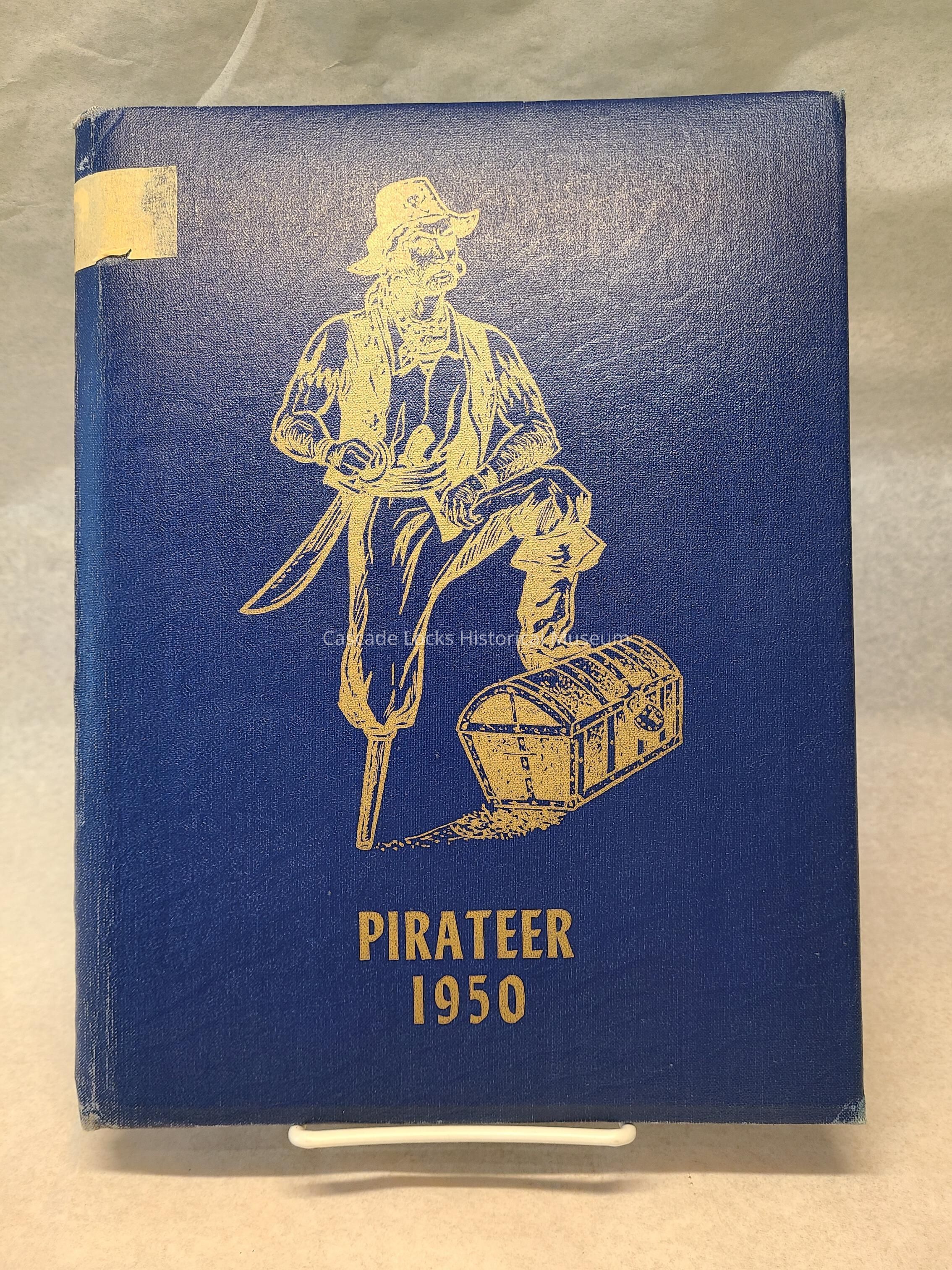 Yearbook, Cascade Locks High School 1949-1950. Front cover is navy blue with gold illustration of a pirate and gold font.
