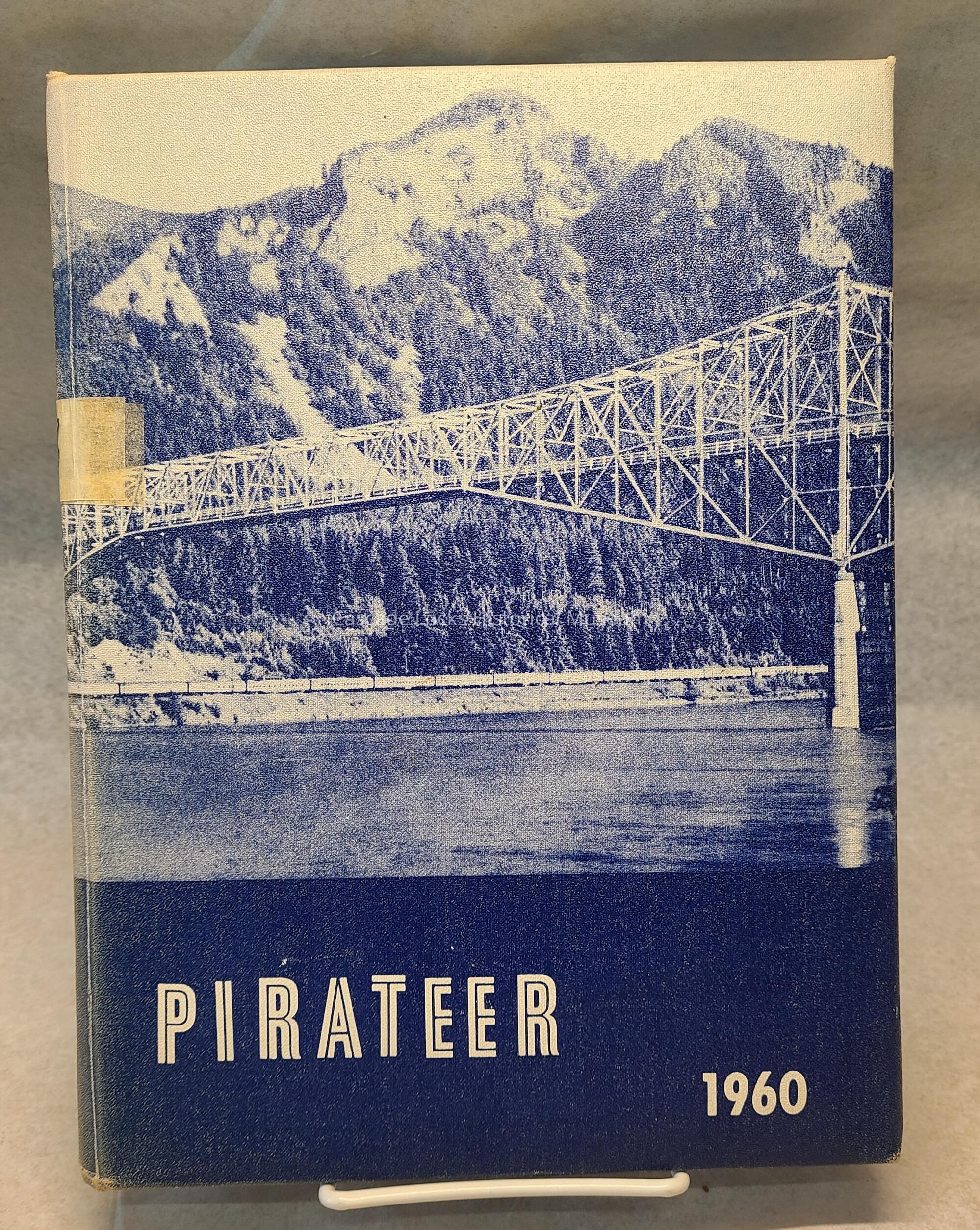 Yearbook, Cascade Locks High School 1959-1960. Front cover is blue with image of the Bridge of the Gods in white detail and white font.