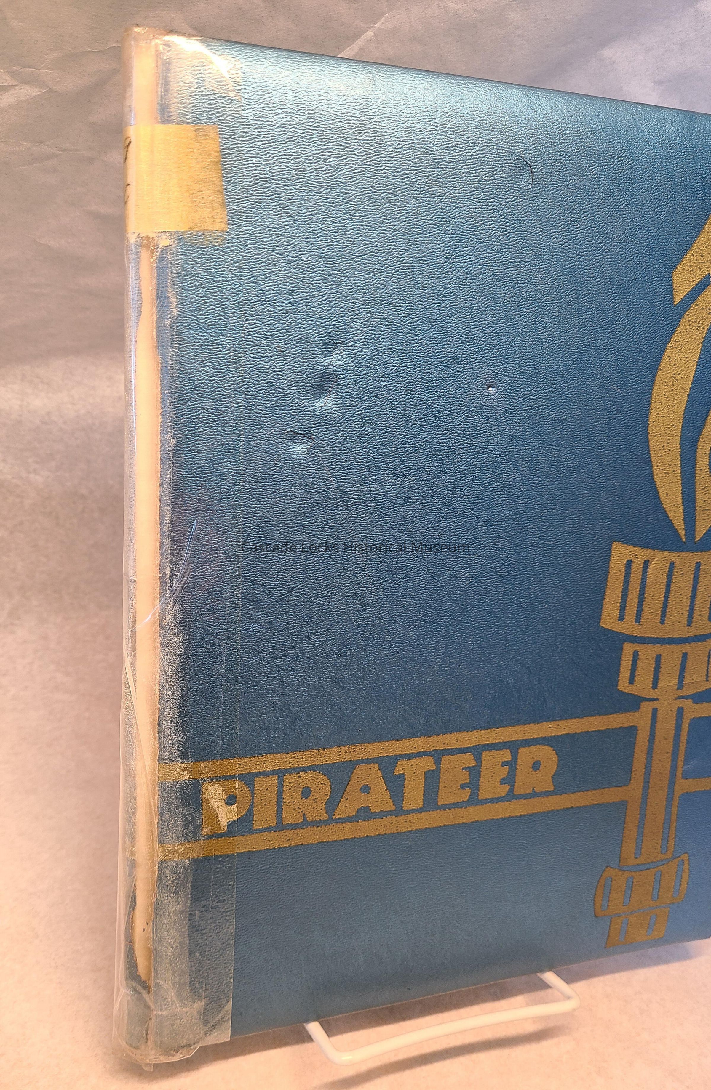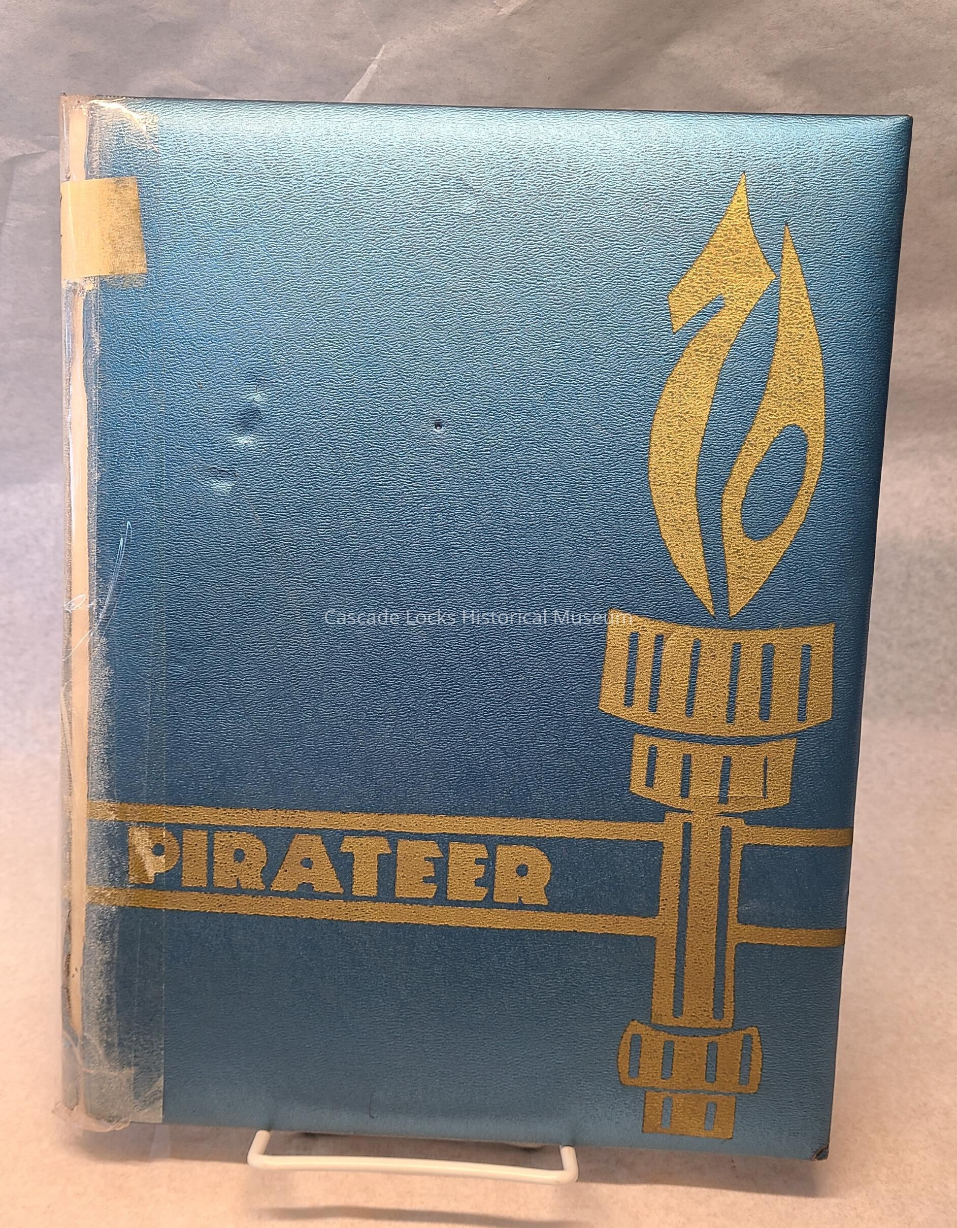 Yearbook, Cascade Locks High School 1969-1970. Front cover is royal blue with gold image of a torch with gold font.