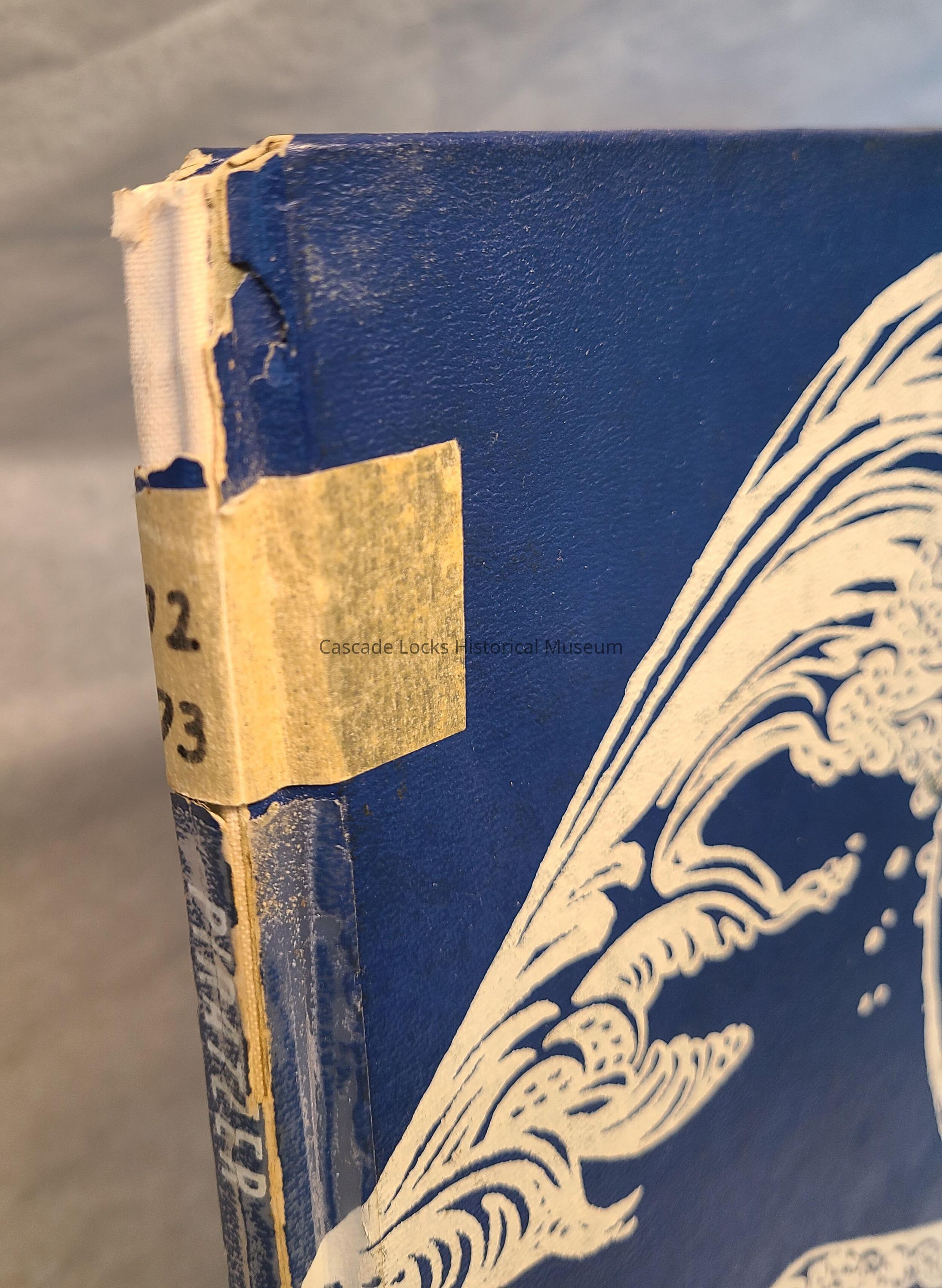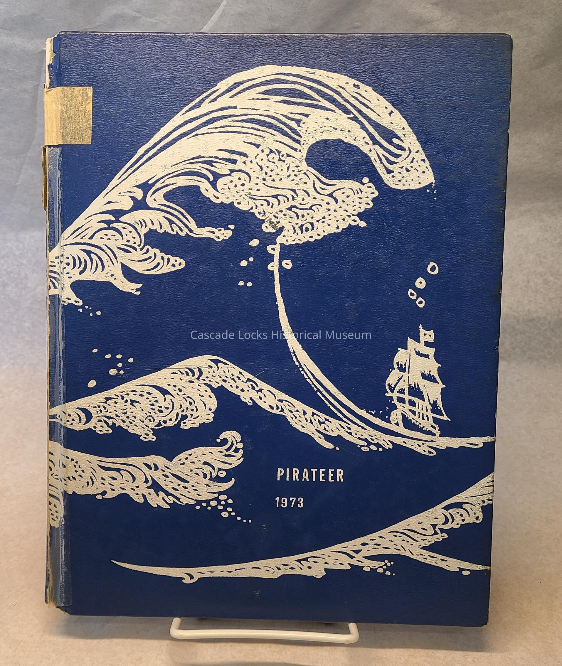 Yearbook, Cascade Locks High School 1972-1973. Front cover is blue with a white illustration of a tidal wave and pirate ship.