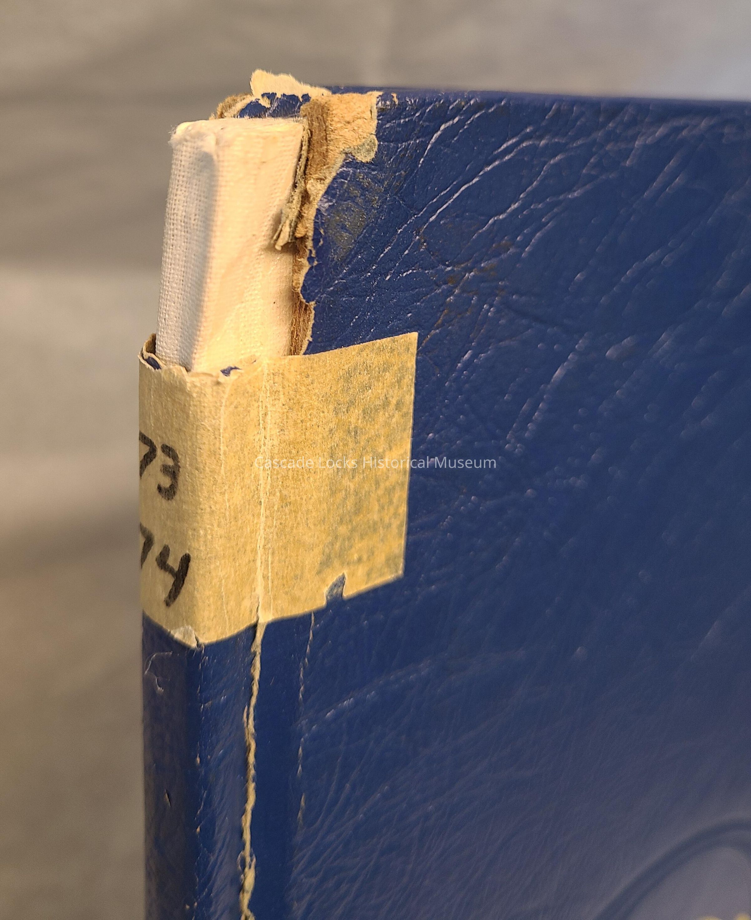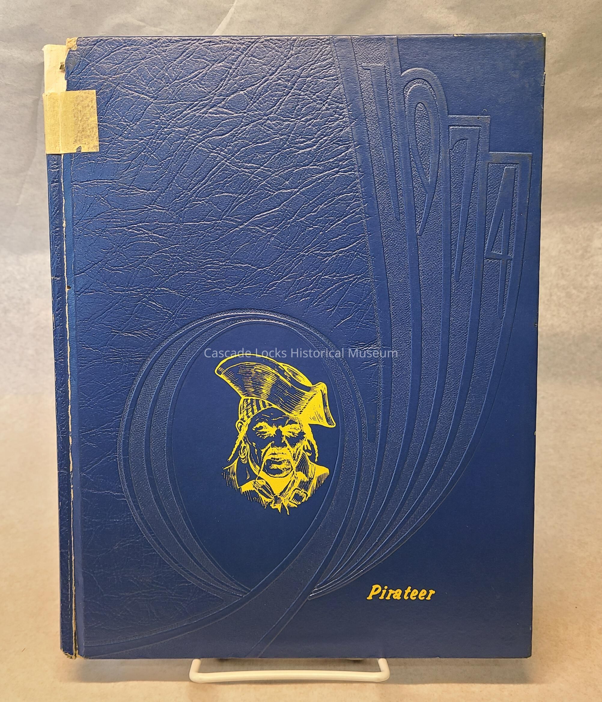 Yearbook, Cascade Locks High School 1973-1974. Front cover is royal blue with a yellow illustration of a pirate and yellow font.