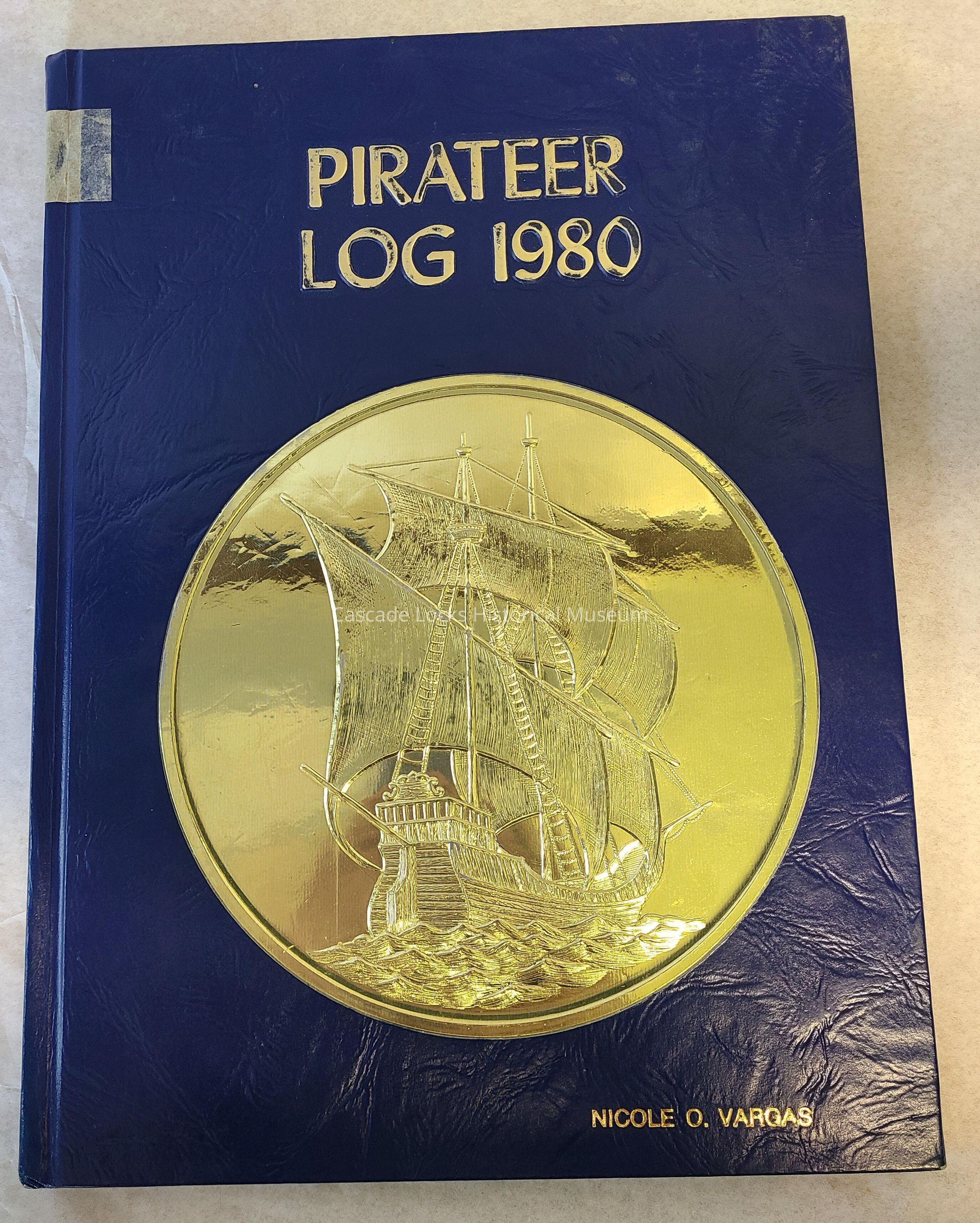 Yearbook, Cascade Locks High School 1979-1980. Front cover is a textured navy blue with large gold medallion with a embossed pirate ship and gold font.