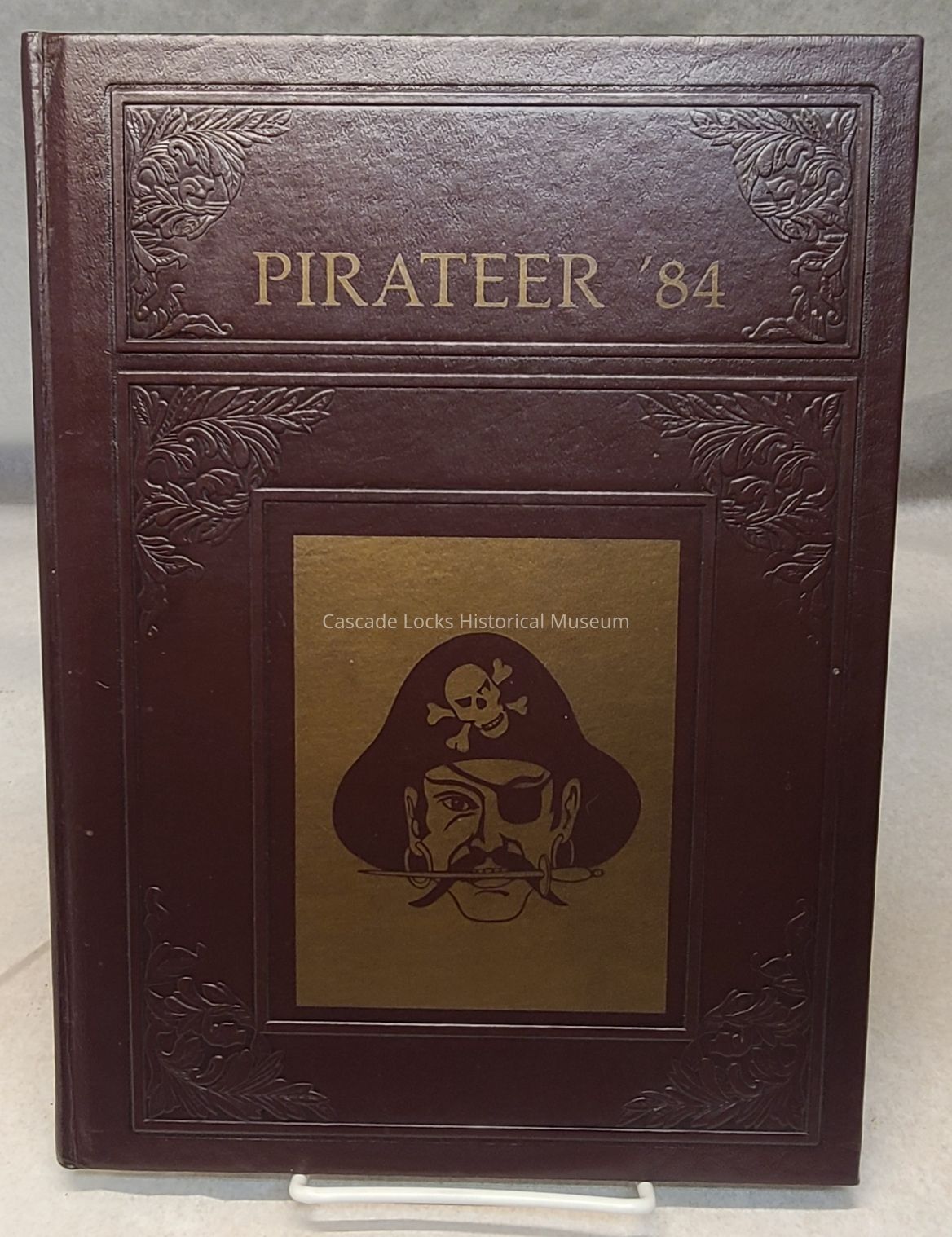 Yearbook, Cascade Locks High School 1983-1984. Cover is textured brownish red with embossed leafs and a picture of a pirate color blocked in gold with gold font.