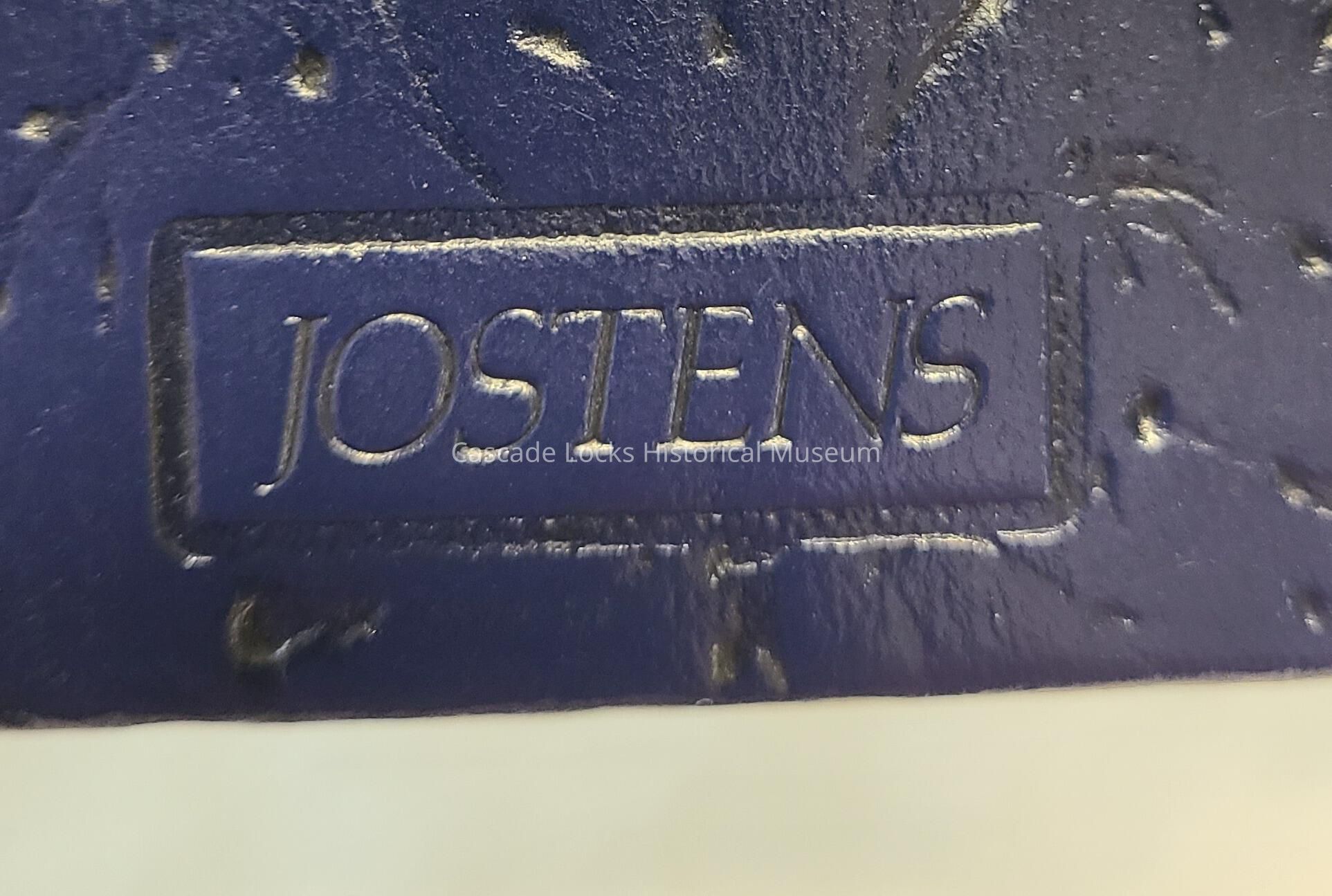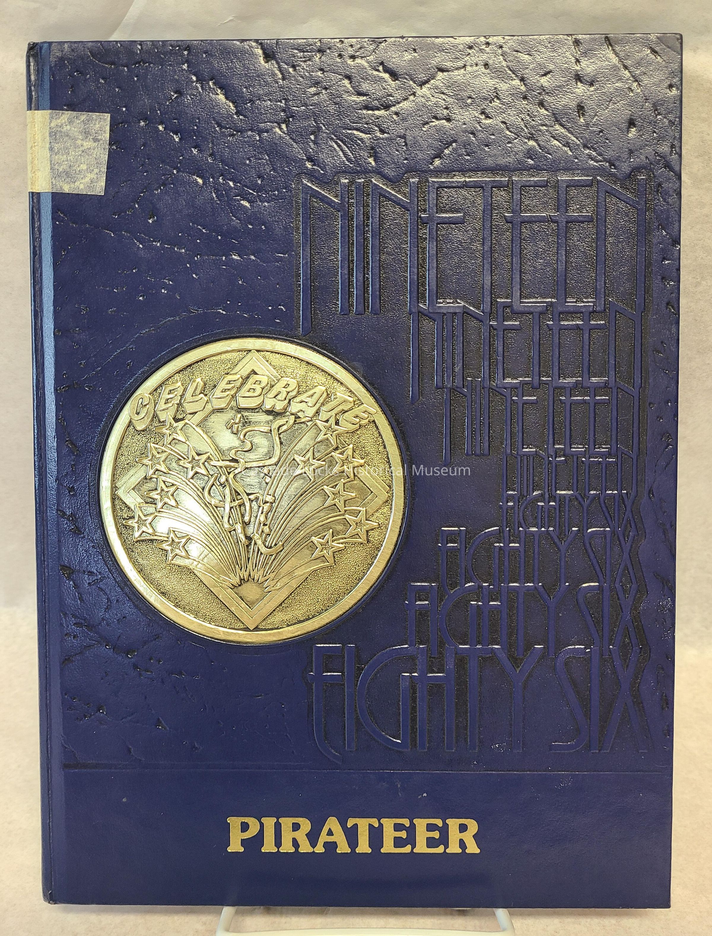 Yearbook, Cascade Locks High School 1985-1986. Cover is textured navy blue with embossed writing and gold medallion.