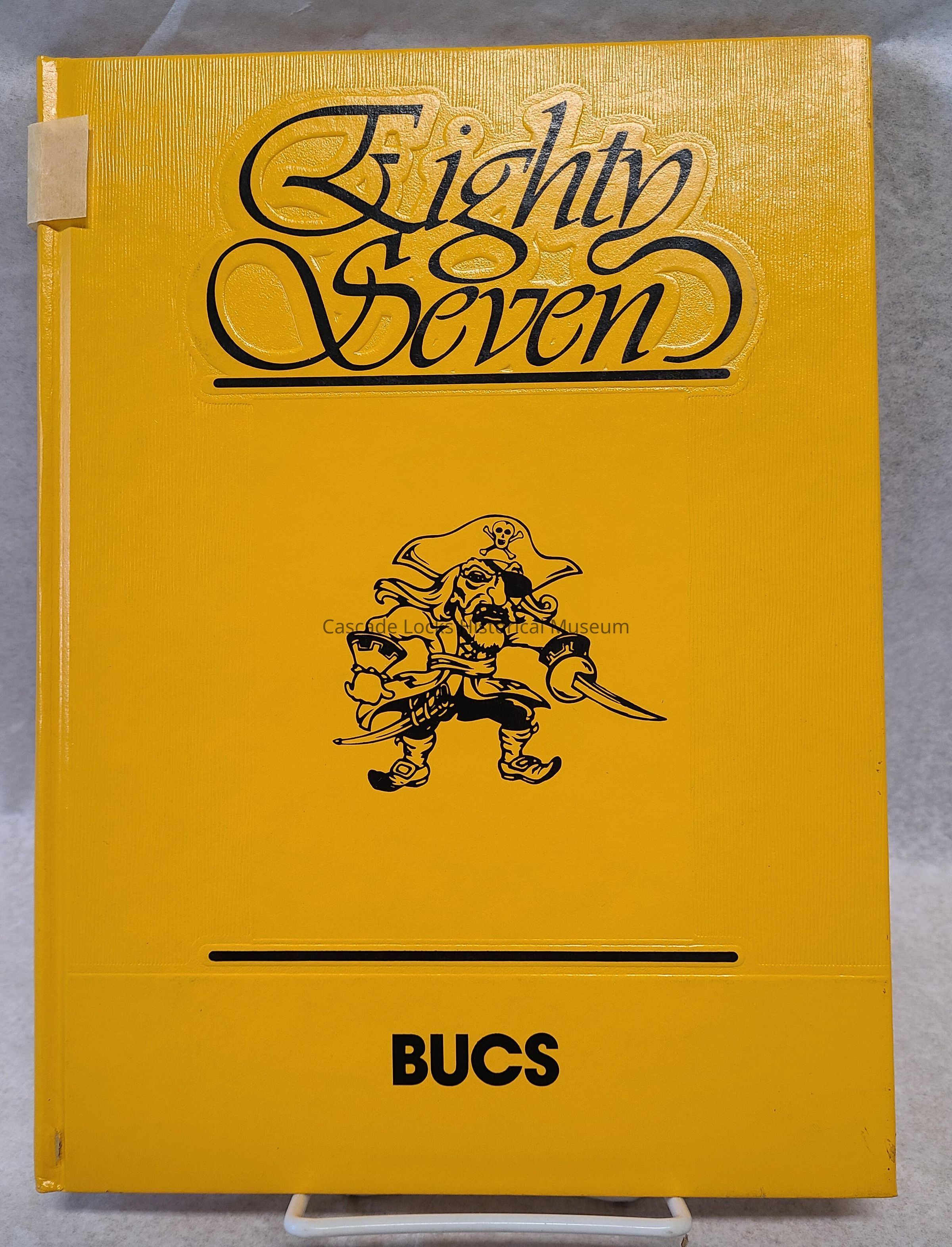 Yearbook, Cascade Locks High School 1986-1987. Cover is yellow with black image of a pirate and black font.