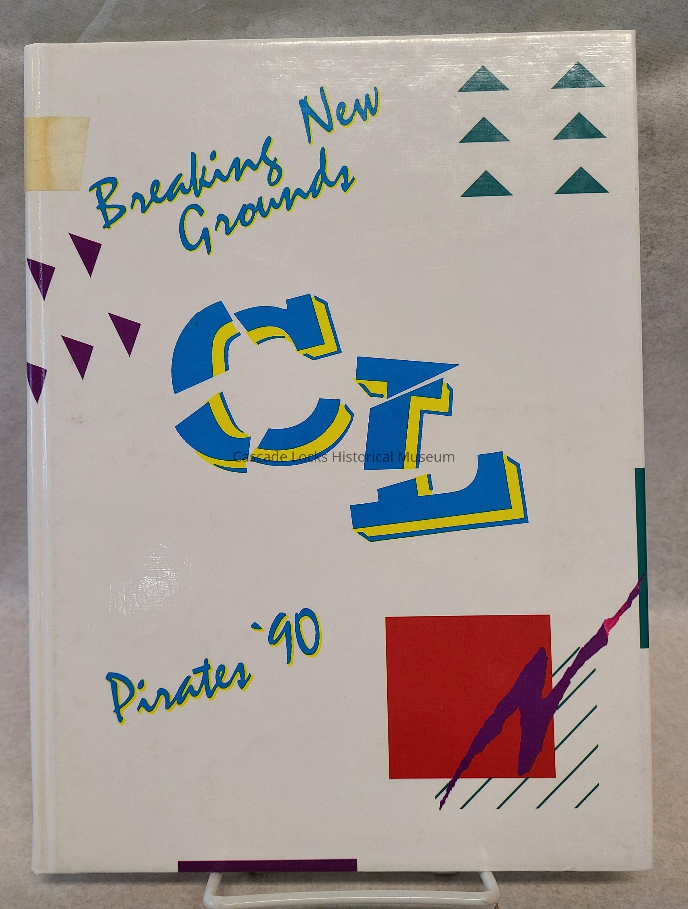 Yearbook, Cascade Locks High School, 1989-1990. Cover is white with varying shapes and colors font is teal blue with yellow outline.