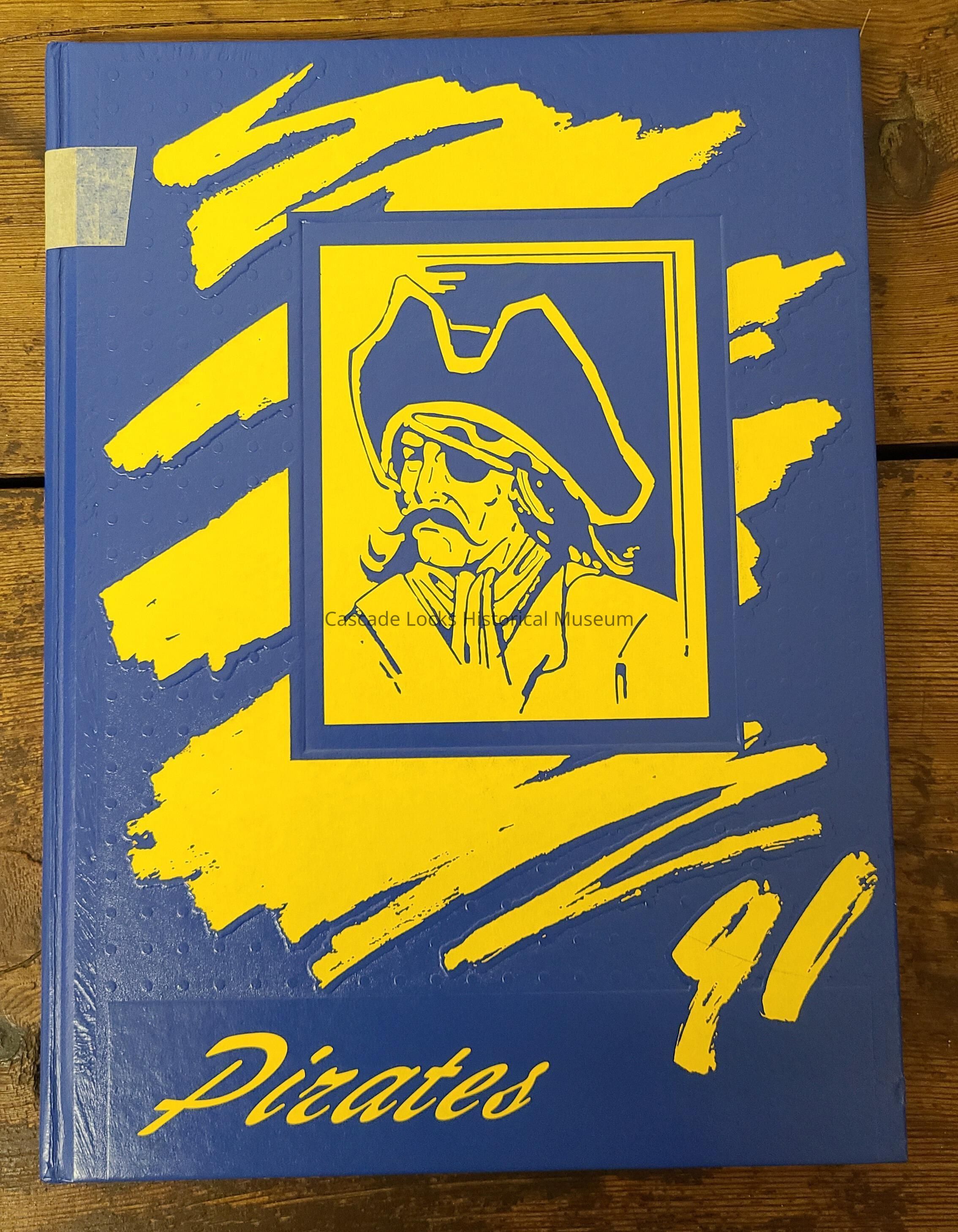 Yearbook Cascade Locks High School 1991. Blue cover with yellow picture of Pirate.