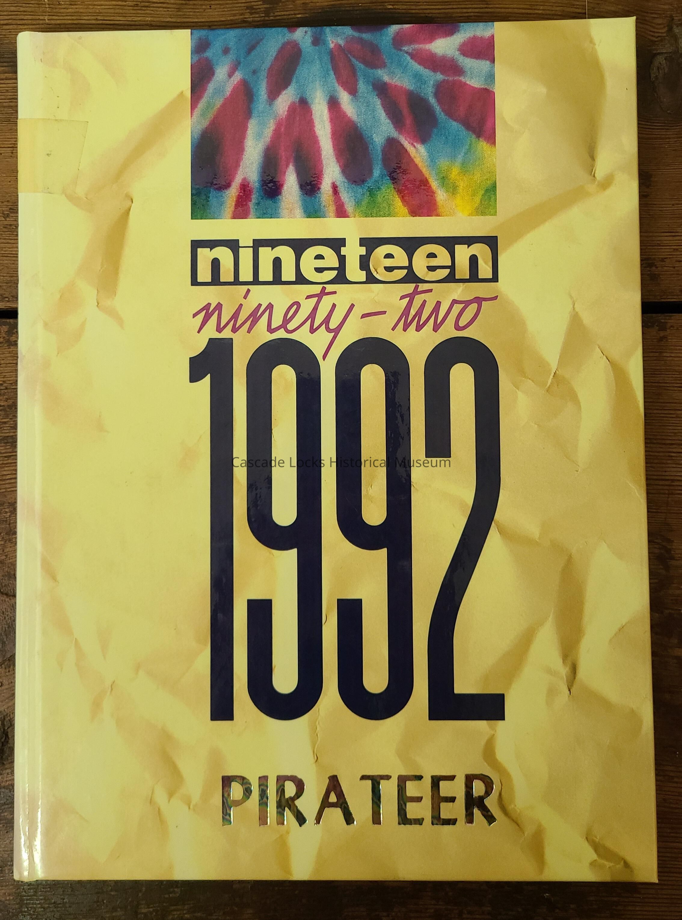Yearbook, Cascade Locks High School, 1992. Cover is meant to look like crumpled yellow paper. There is a image on the cover of ti-dye. Cover says nineteen ninety-two 1992 Pirateer in navy, pink and metallic fonts.