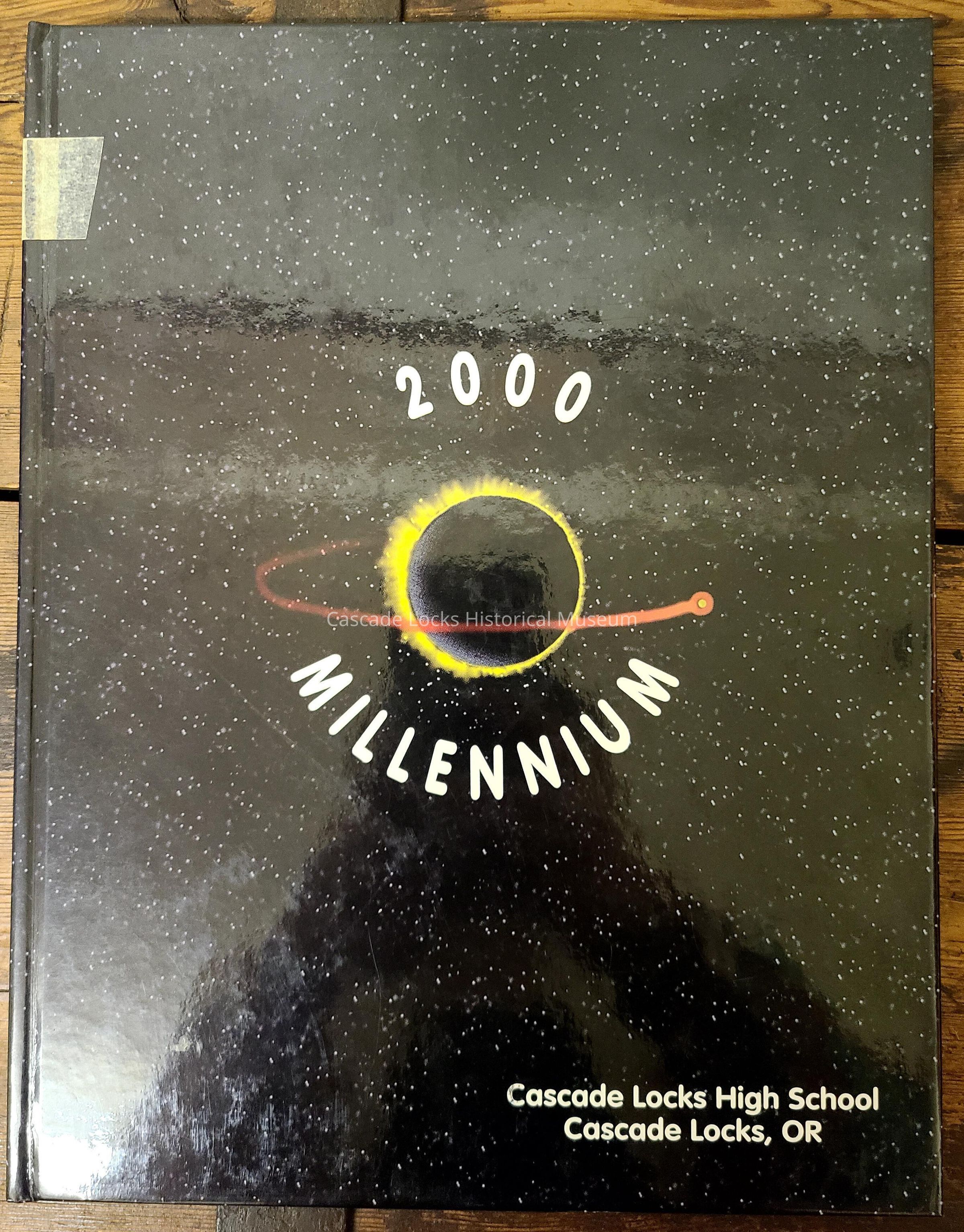 Yearbook, Cascade Locks High school 2000. Black with stars and en eclipse with a red streaming planet moving around the eclipse. Title is "2000 Millennium, Cascade Locks High School, Cascade Locks Oregon."