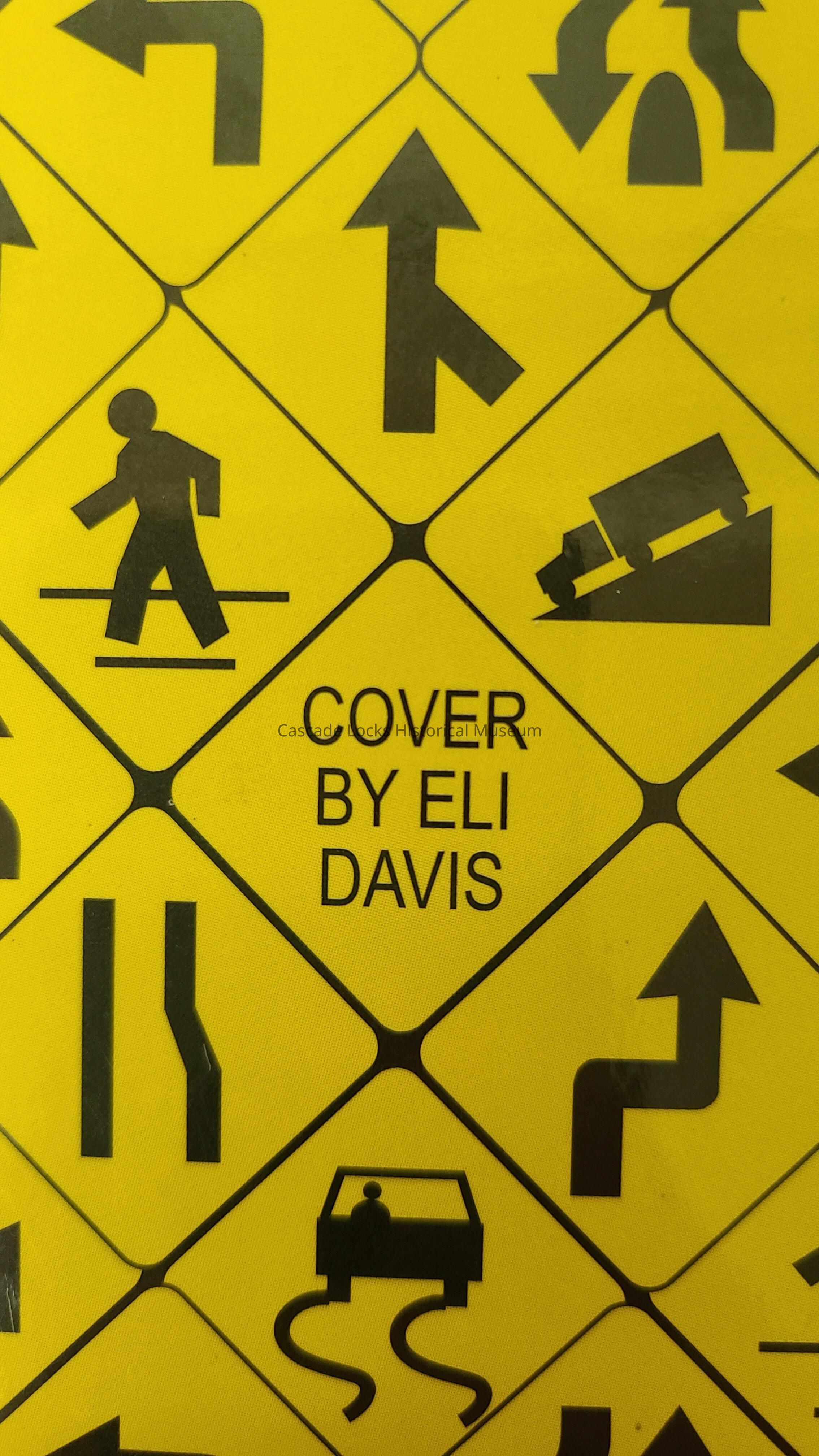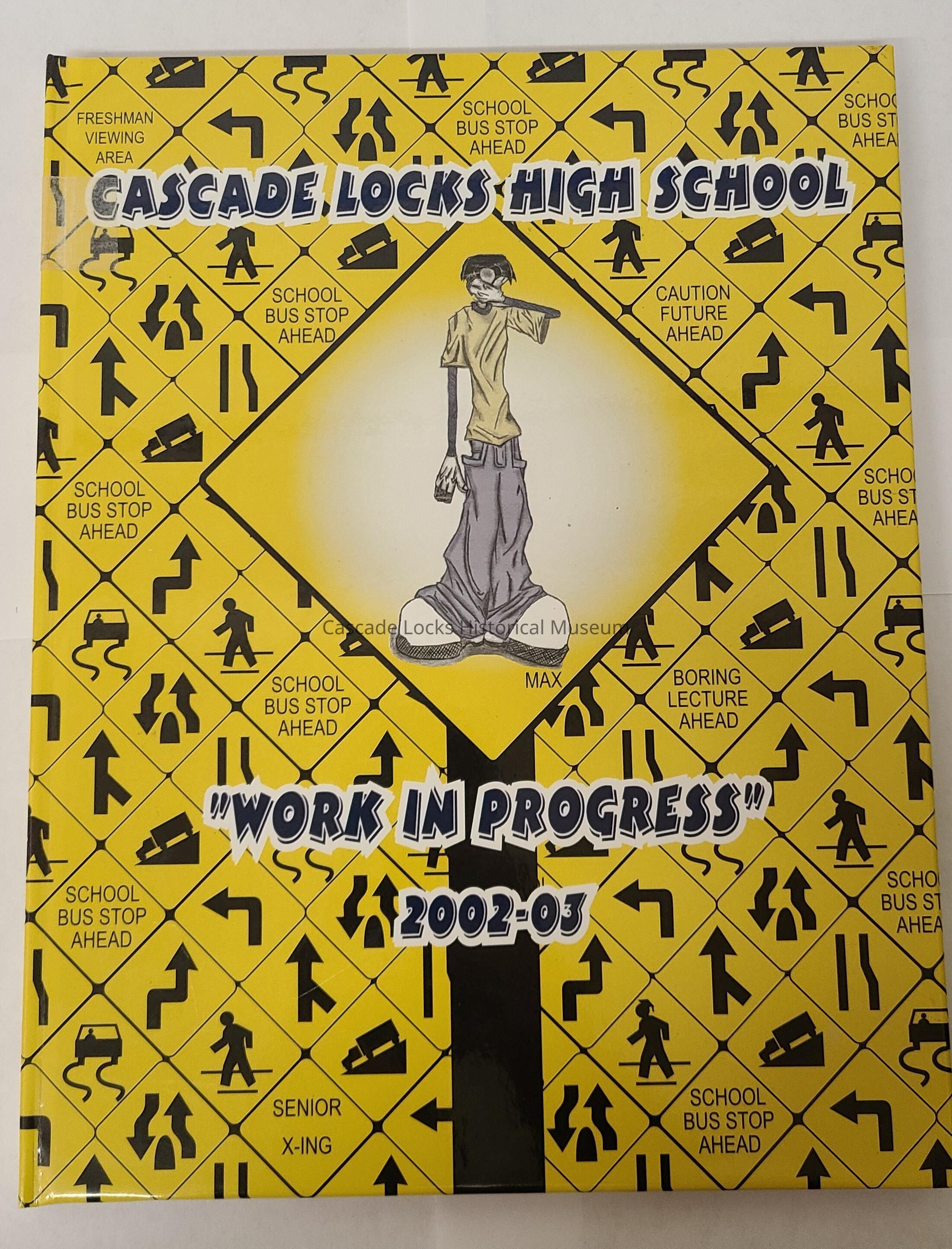 Yearbook, Cascade Locks High School 2003. Yellow cover with lots of turn signals and traffic signals as well as a shape directly in the middle with a cartoon graphic alien with a hand scratching or hiding its face wearing baggy blue jeans and a loose yellow shirt.