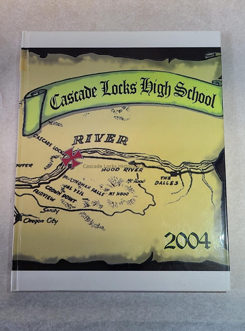 Yearbook, Cascade Locks High School 2003-2004. Front cover is a map of the local area with an X over the location of Cascade Locks. The x is meant to look like a spot on the treasure map. Using a classic Iron Cross in their rendition of a treasure map. The edges of the edge are meant to look like a rolled map. On the back left corner is a compass.