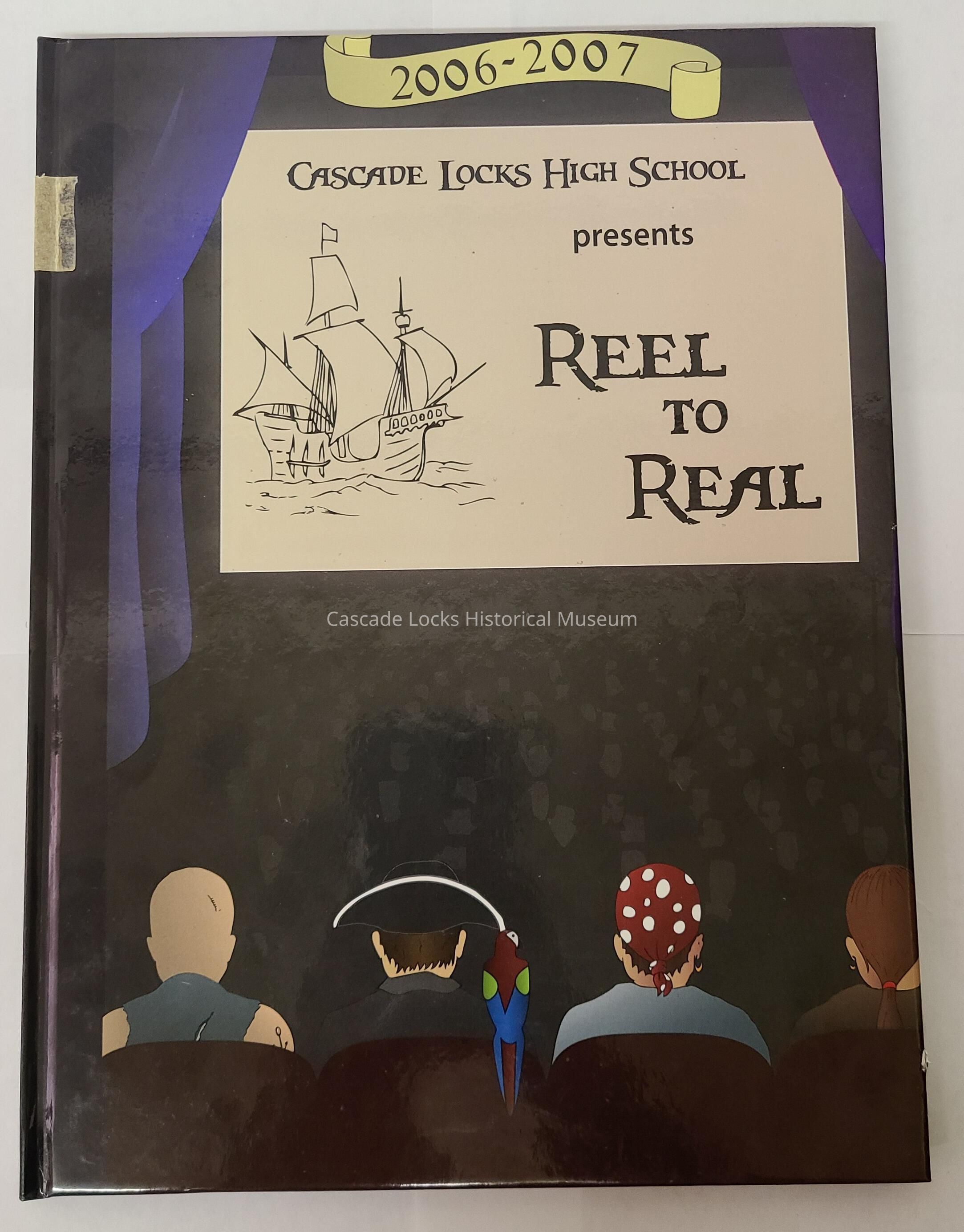 Yearbook, Cascade Locks High School 2007. Cover has a pirate ship and its sailing in water on a movie screen introduction. there are pirates sitting in movie theatre seats facing the sailing ship as if watching a movie.