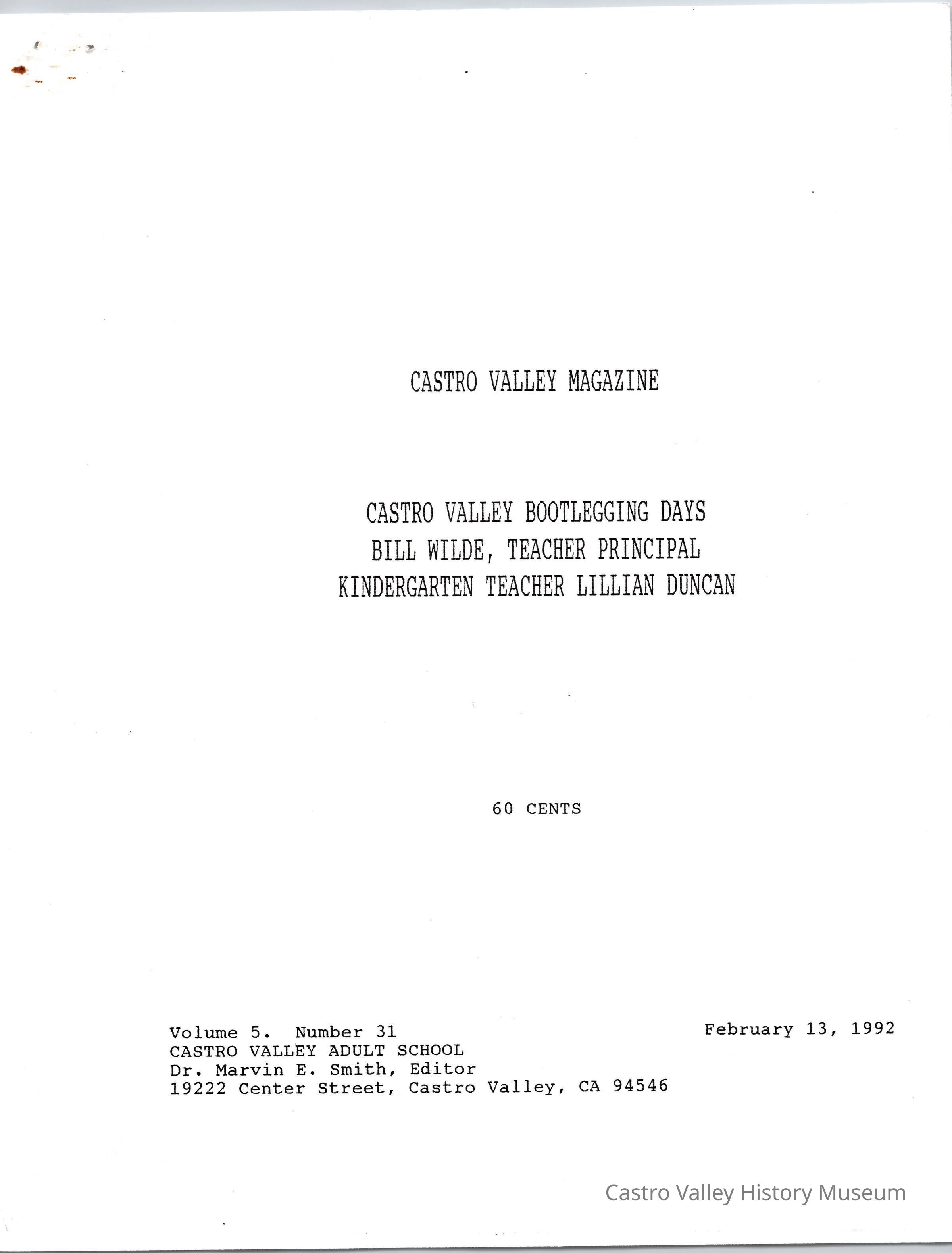 Volume 5 number 31 of Castro Valley magazine edited by Dr. Marvin E. Smith. Articles on Castro Valley bootlegging days, Bill Wilde and Lillian Duncan by Brian Marcotte, Maria Bogakos, Bill Wilde and Lillian Duncan.Collection