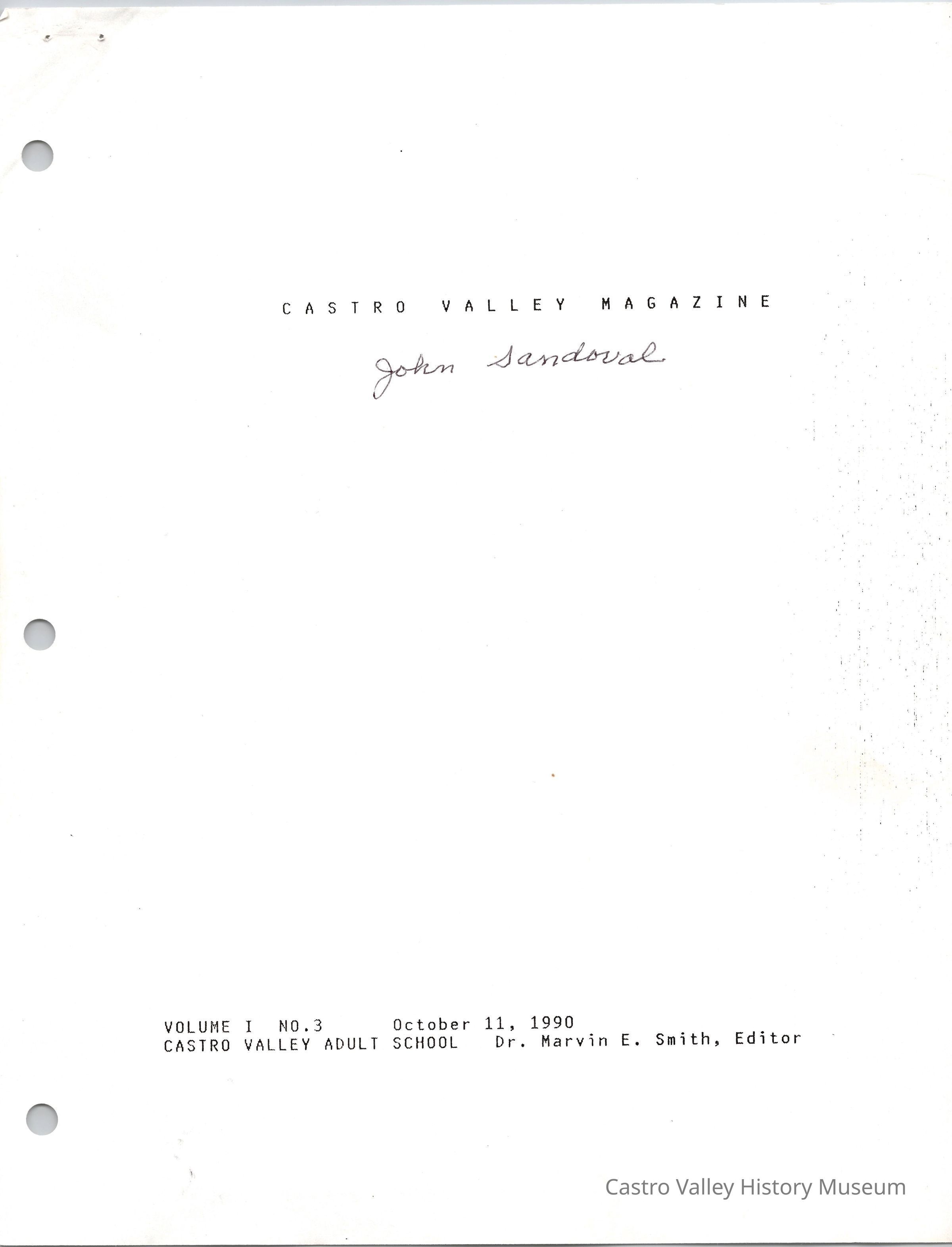 Volume 1 Number 3 of Castro Valley Magazine edited by Dr. Marvin E. Smith. John Sandoval tells the history of Castro Valley beginning in the 1700's. Includes a map and "The Castro Valley Story" by Betty Ray Lesch from Nov 12, 1975.Collection
