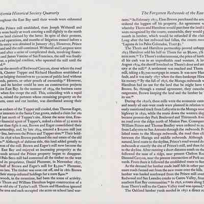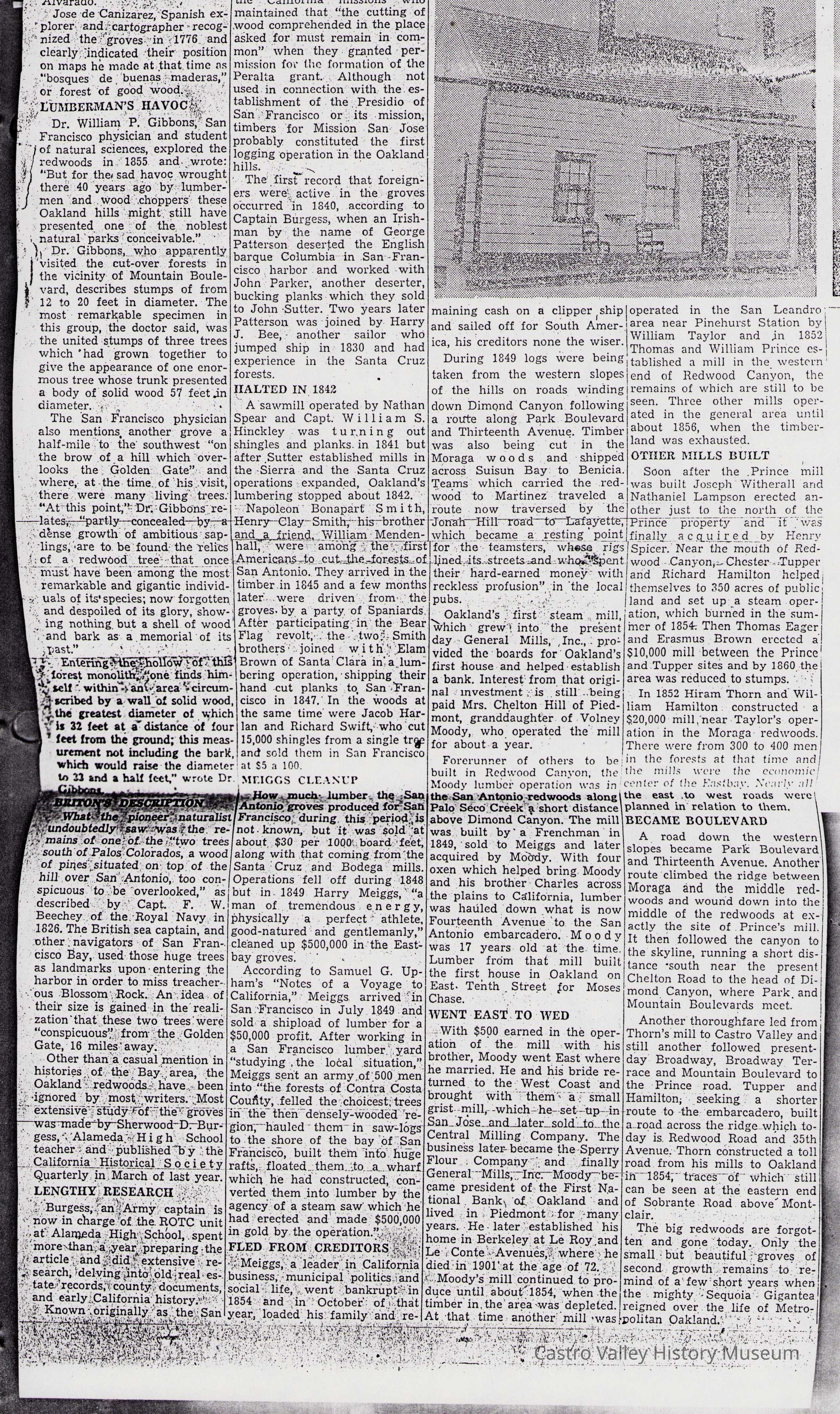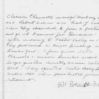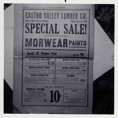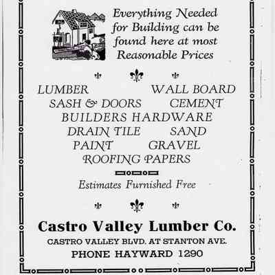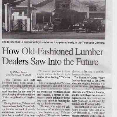 Newspaper articles, other documents and photos on the history of Castro Valley Lumber. Includes an article from the California Historical Society Quarterly from March 1951 and an advertisement from the Castro Valley Business Bulletin. Also includes a Castro Valley Forum article from circa 2005 about owners John Tallman and Bill Peterson.Collection