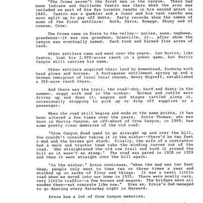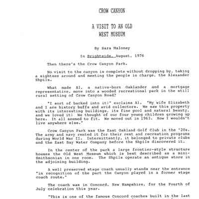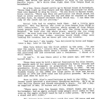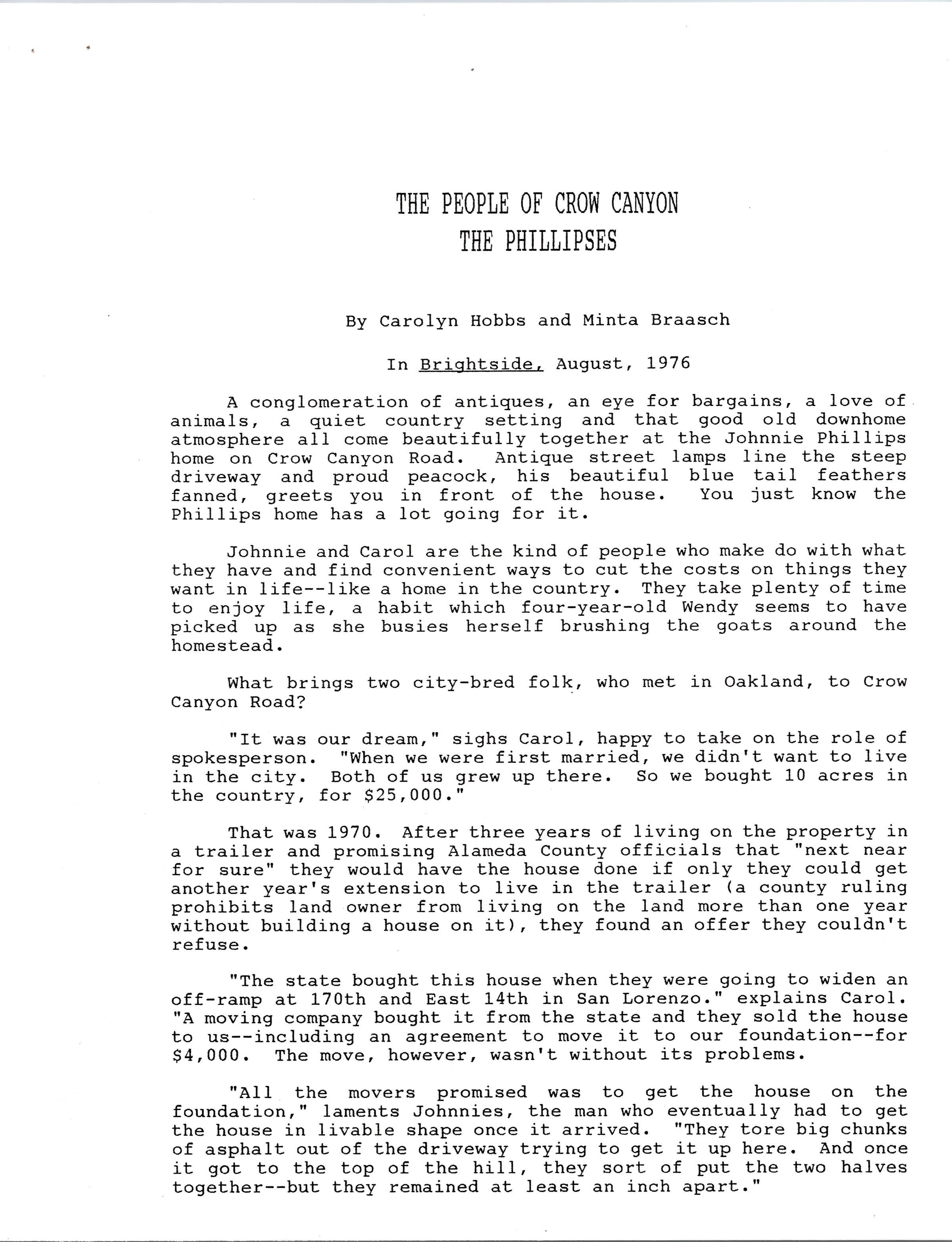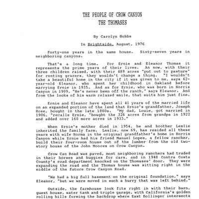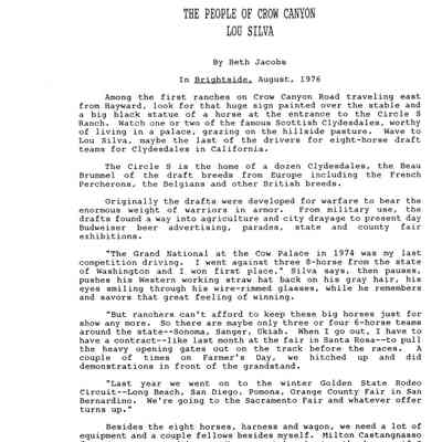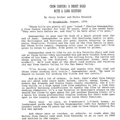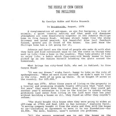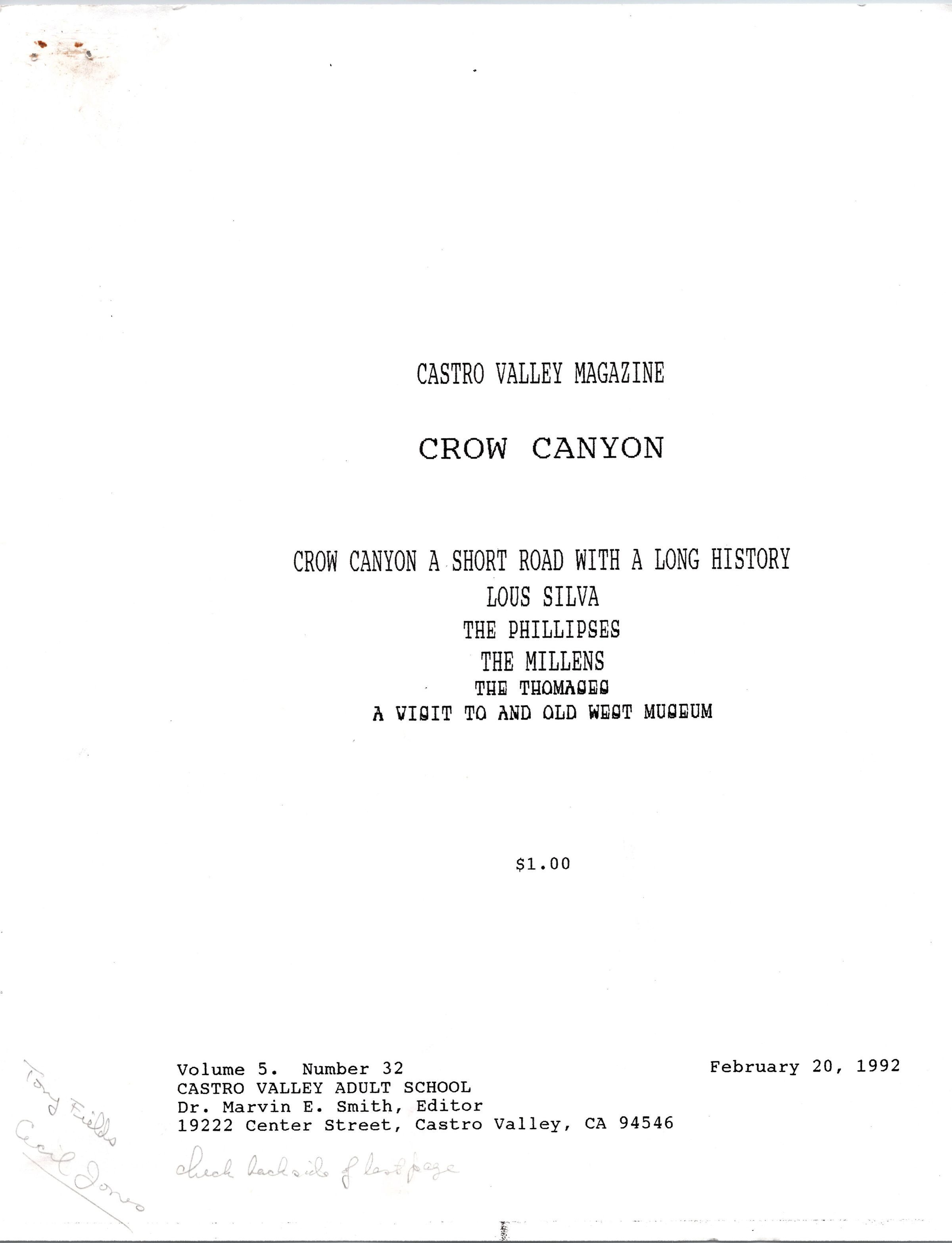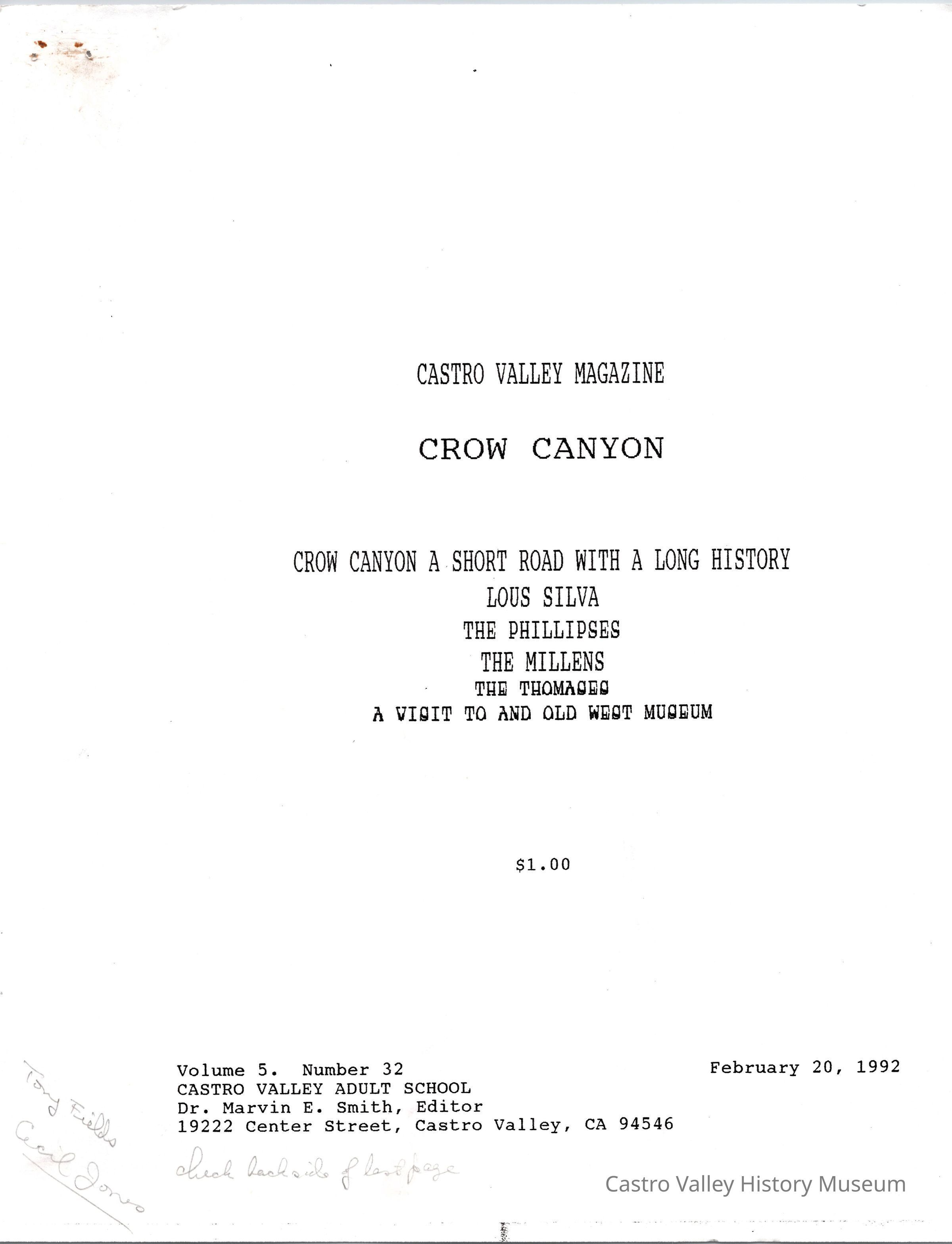Volume 5 number 32 of Castro Valley Magazine edited by Dr. Marvin E. Smith. Articles on Crow Canyon including Lous Silva, the Phillipses, the Millens, and the Thomases. Written by Jerry Archer, Beth Jacobs, Carolyn Hobbs, Minta Braasch, and Sara Maloney.Collection