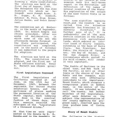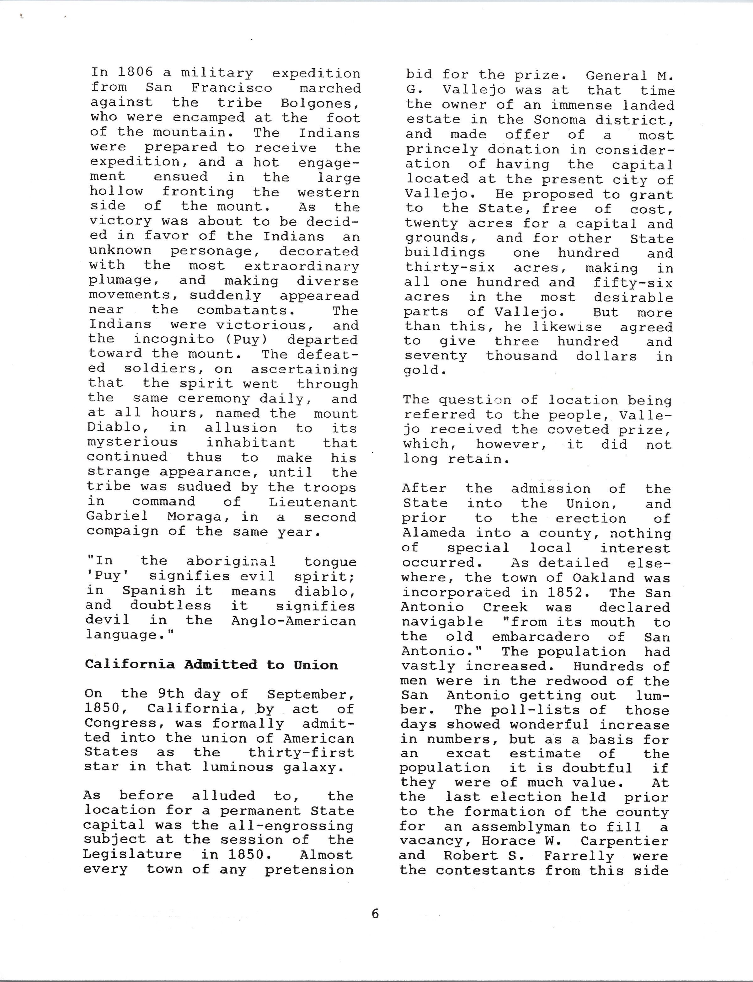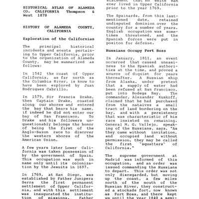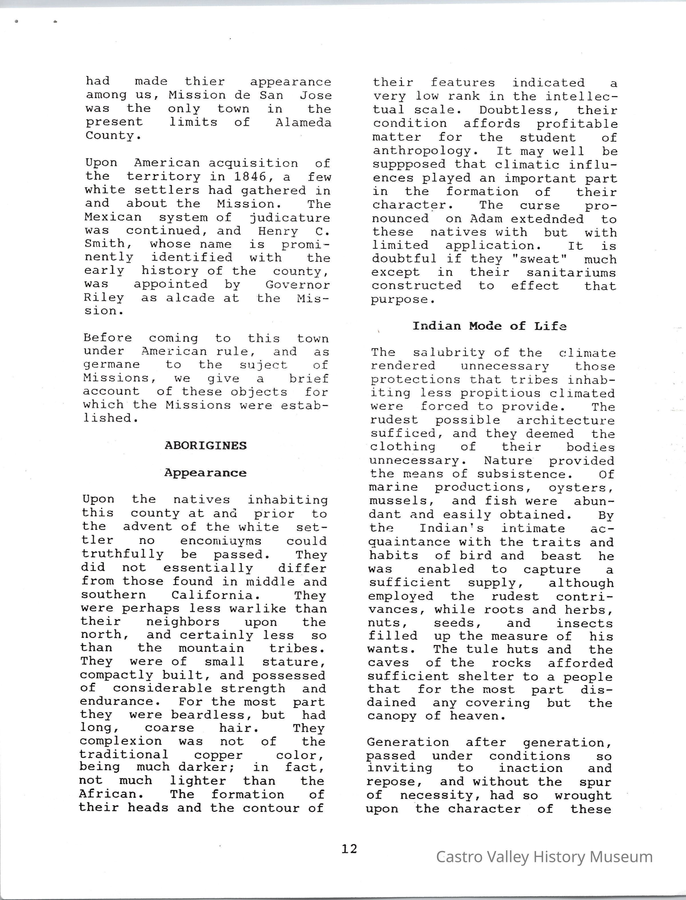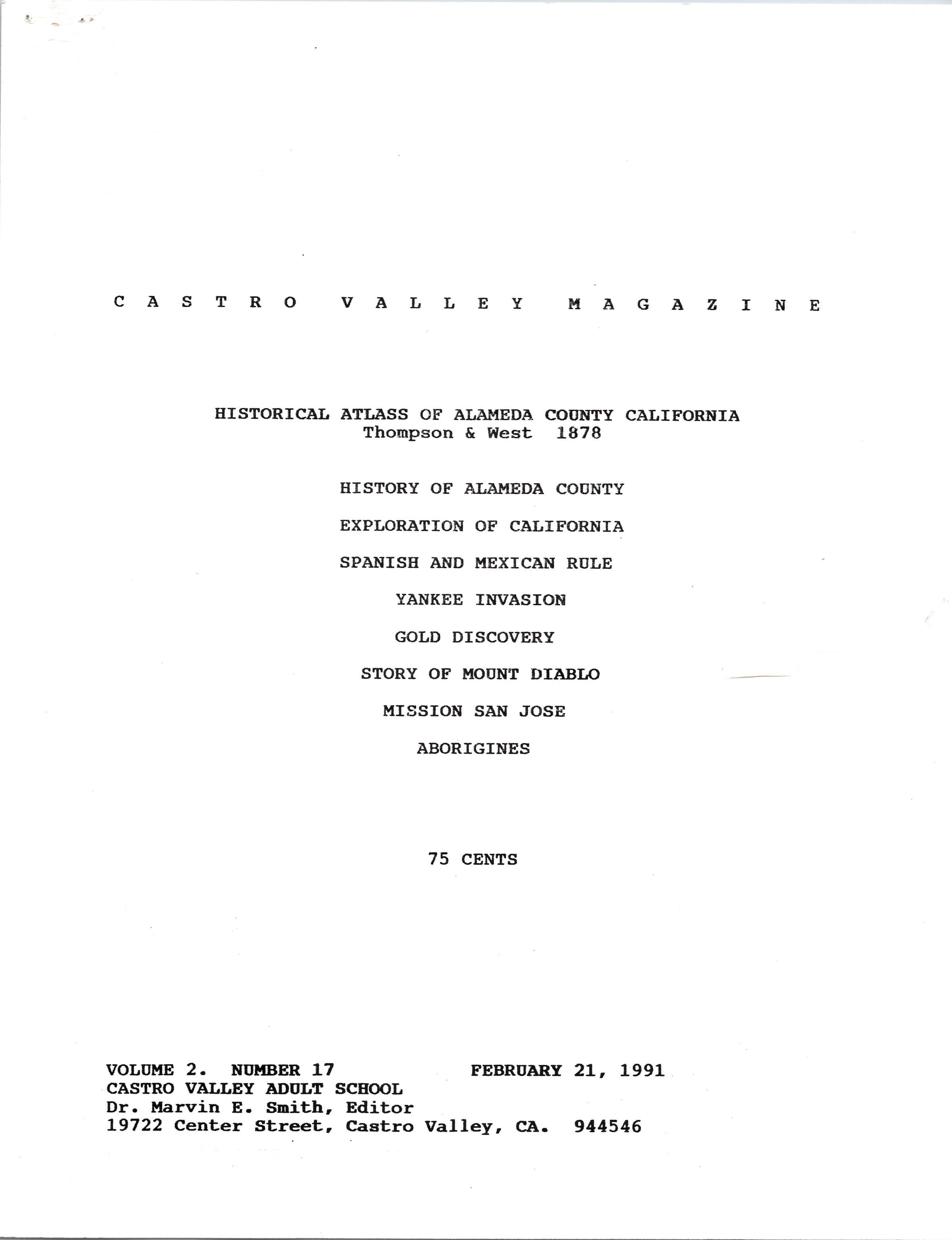 Volume 2 No. 17 of Castro Valley Magazine edited by Dr. Marvin E, Smith. Includes excerpts from Historical Atlas of Alameda County California, Thompson & West 1878. Segments include history of Alameda County, Exploration of California, Spanish and Mexican Rule, Yankee Invasion, Gold Discovery, Story of Mount Diablo, Mission San Jose, and Aborigines.Collection